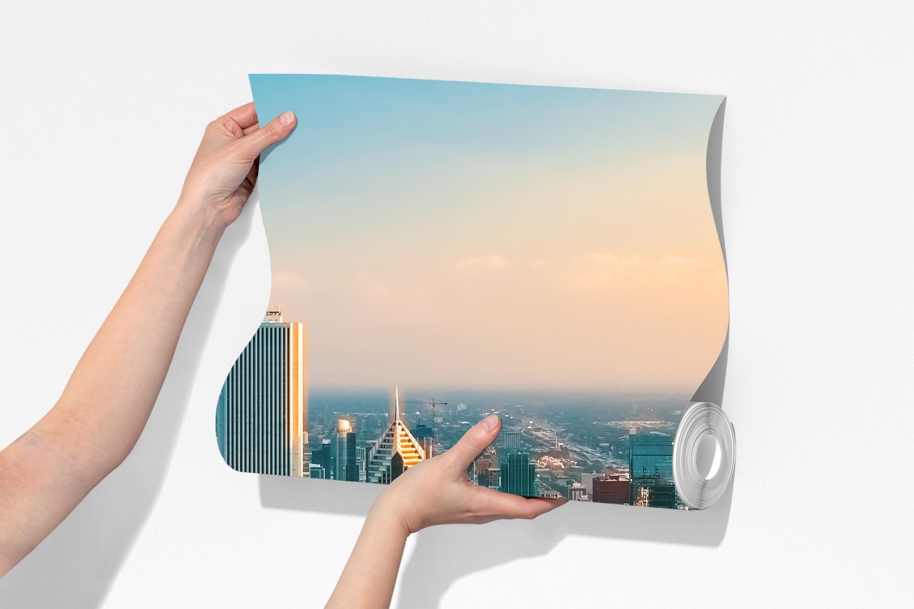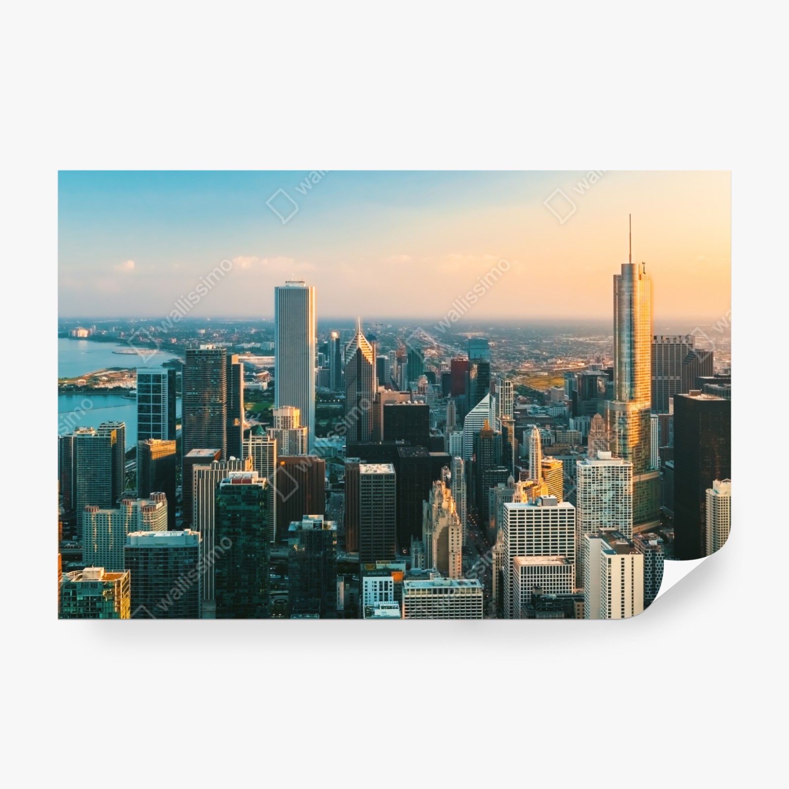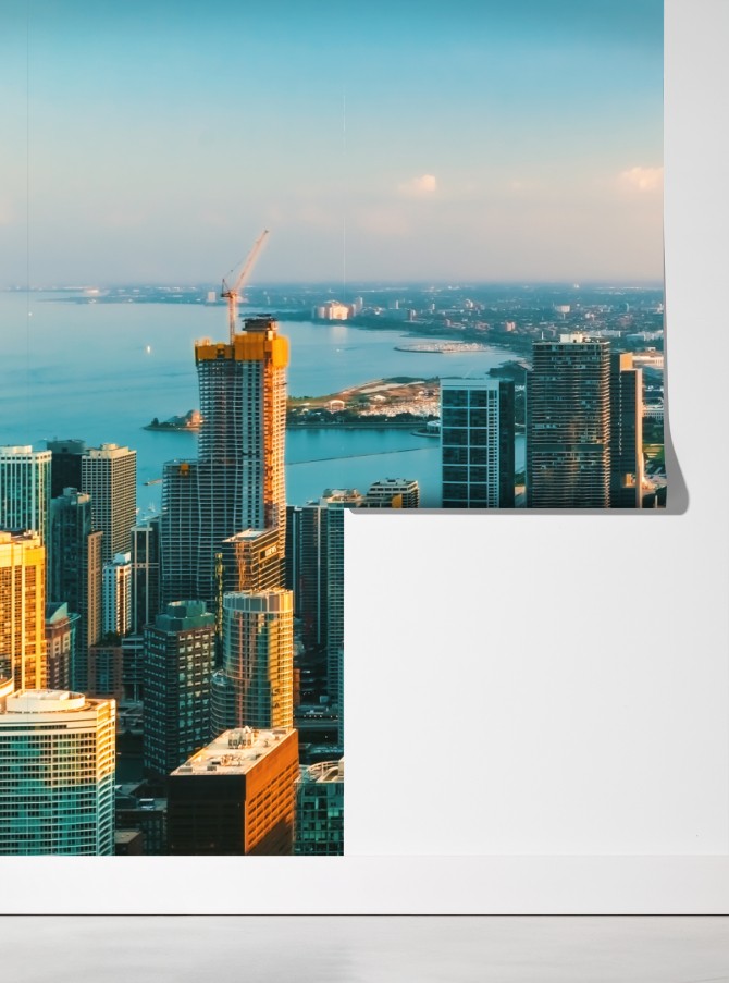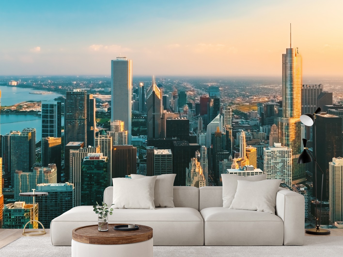 Podkreśl swoje wnętrze złotą panoramą Chicago o zachodzie słońca, która wnosi miejski klimat i elegancję.