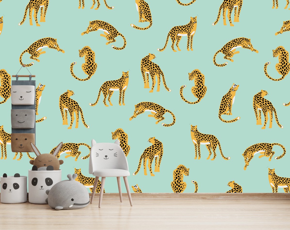 Fototapeta Zabawny wzór gepardów na turkusowym tle
