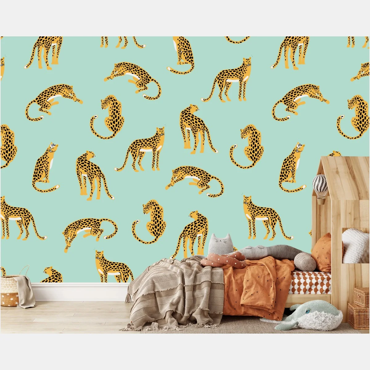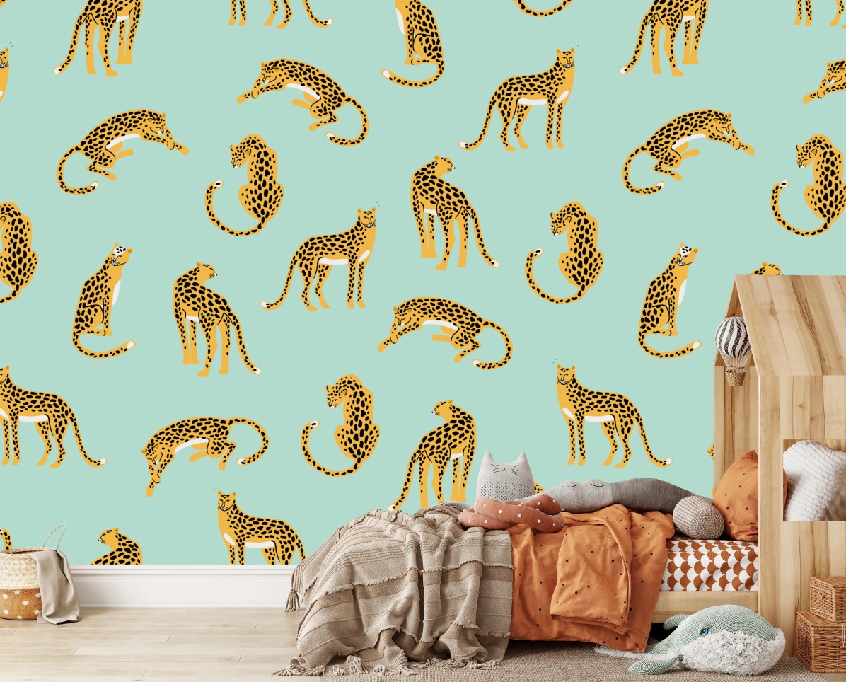 - ilustracja, pokój dziecięcy, dekoracja ścienna, bezszwowy wzór, nowoczesny, dzika przyroda, gepard, turkusowe tło, wzór zwierzęcy, zabawny motyw