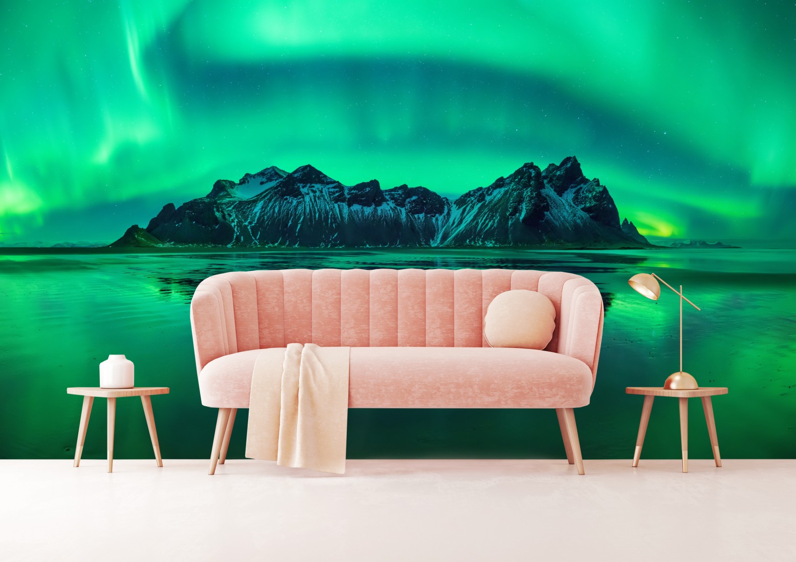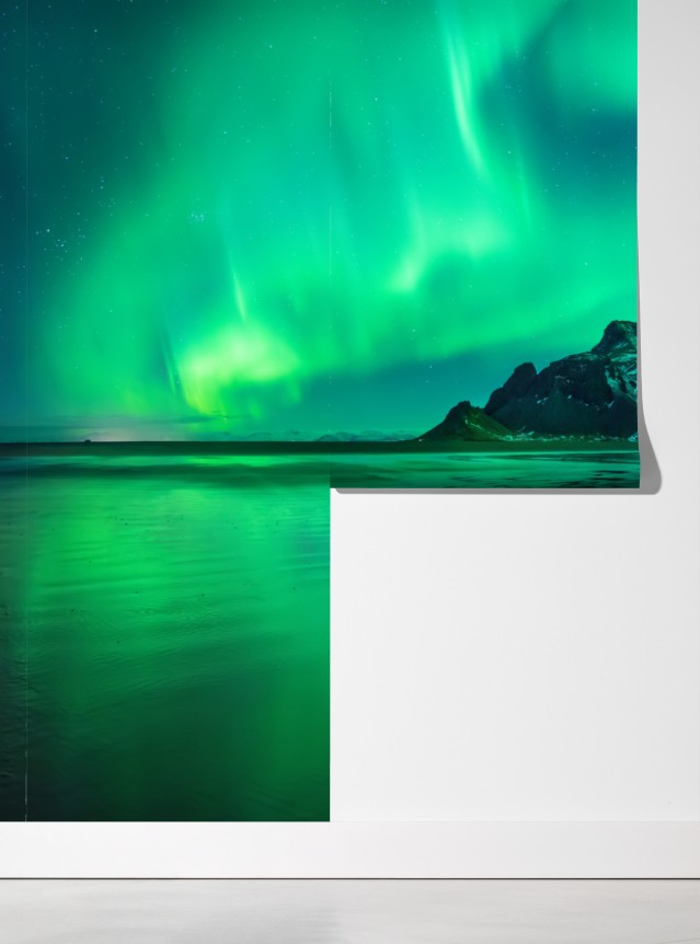 Poczuj hipnotyzujący blask zorzy polarnej nad Vestrahornem i jej odbicie na czarnej plaży, idealne jako efektowna dekoracja ścienna.