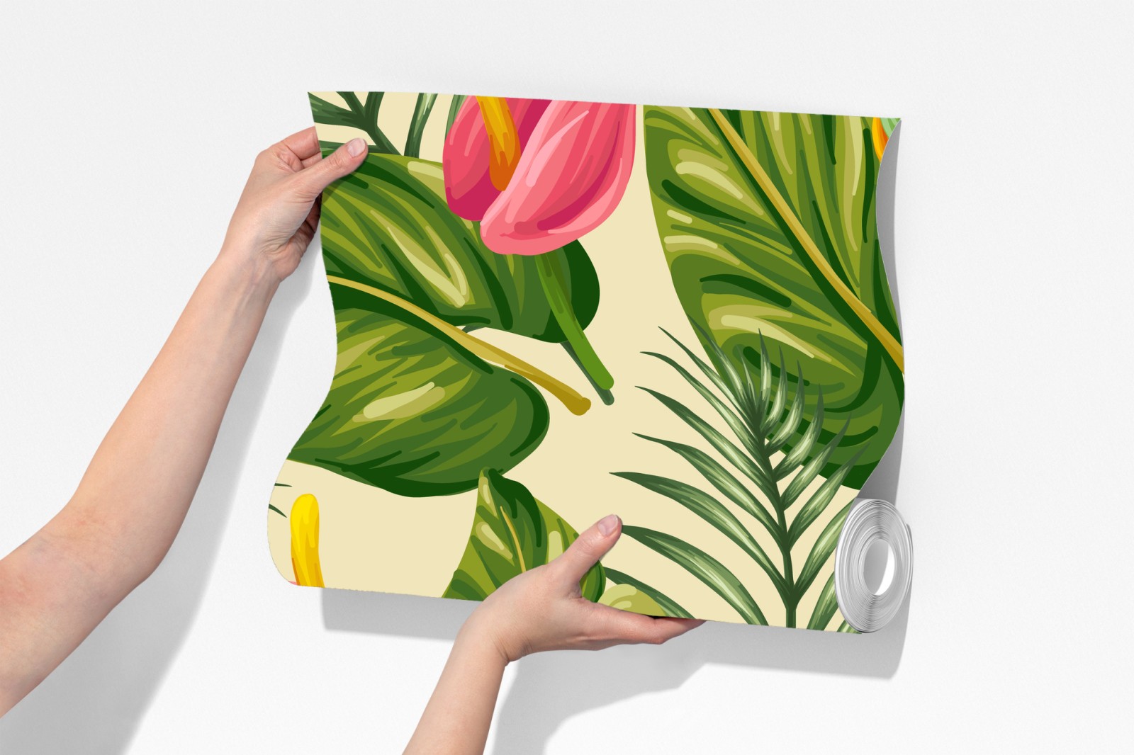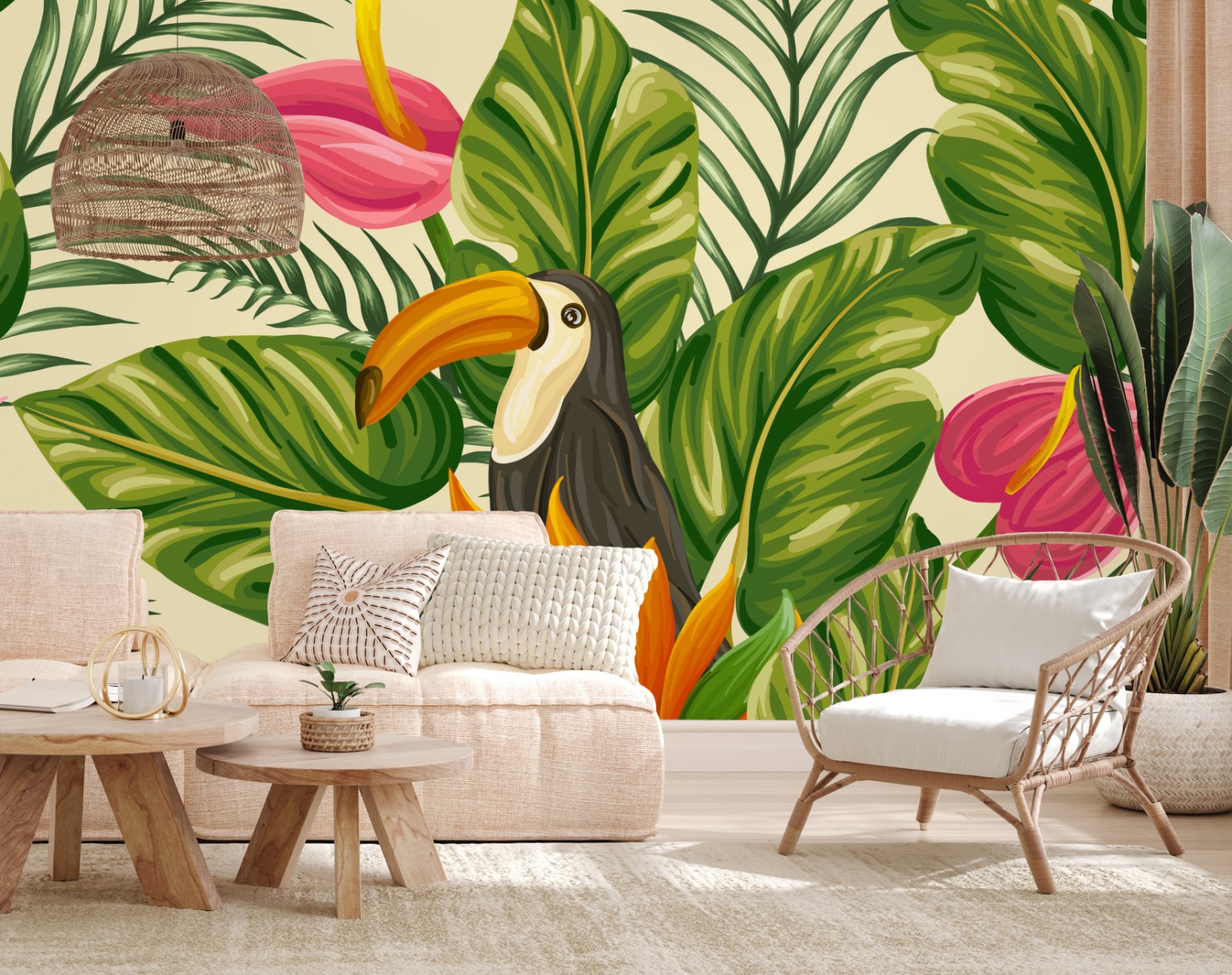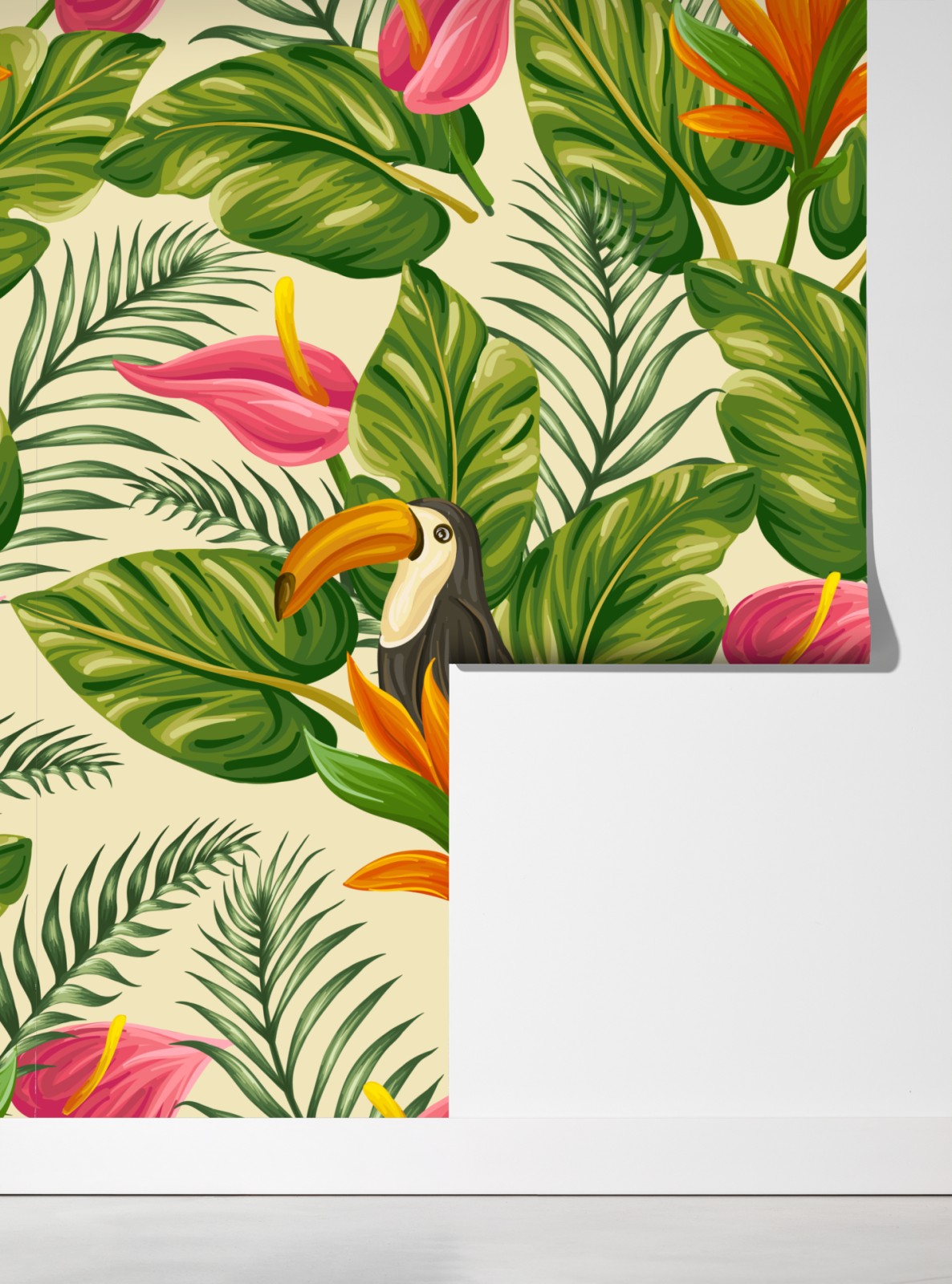 Dodaj żywe tropikalne akcenty do wnętrza dzięki temu ilustrowanemu wzorowi z bujnymi zielonymi liśćmi, egzotycznymi kwiatami i tukanem.