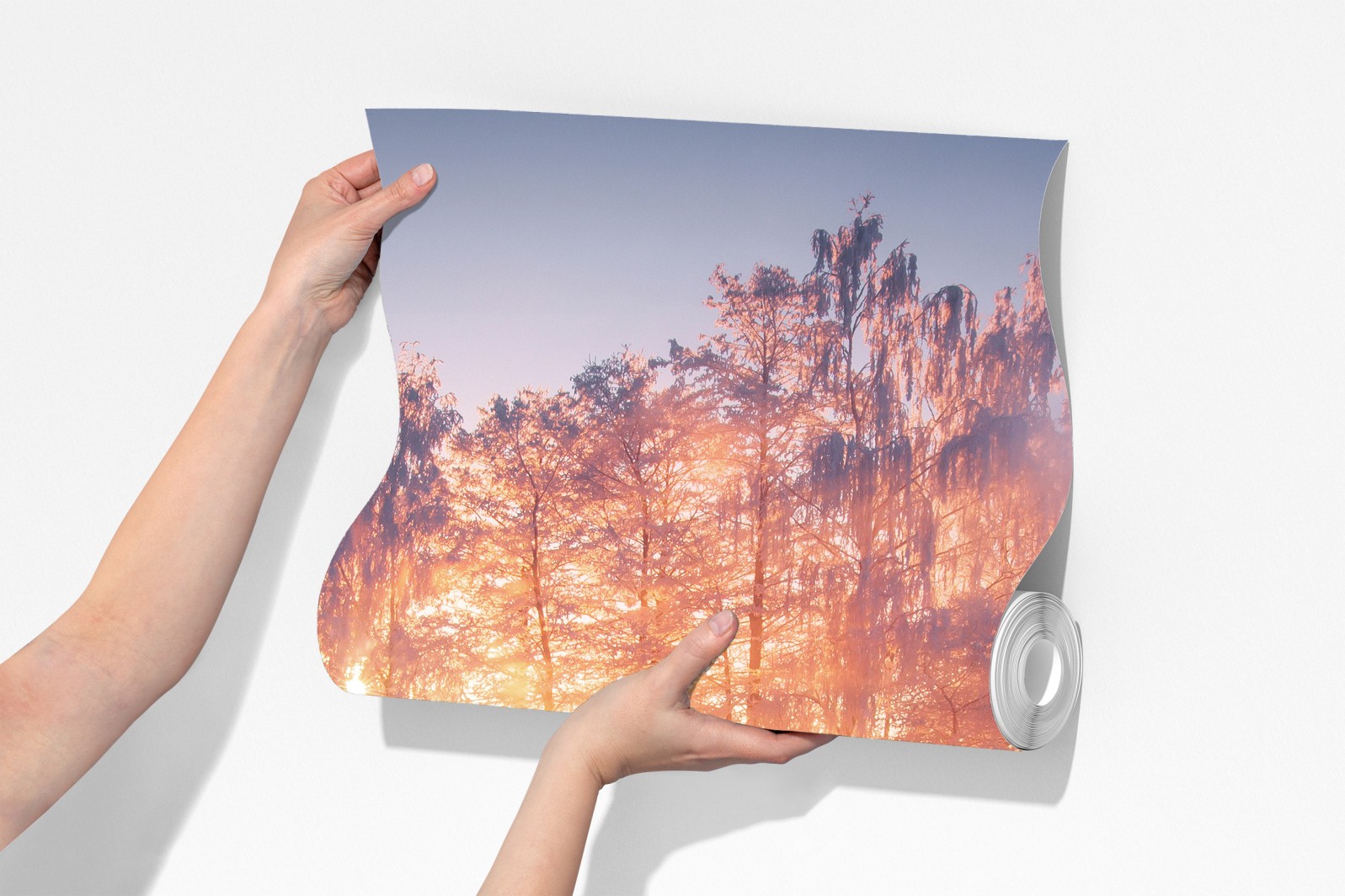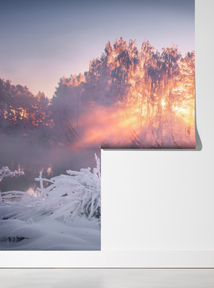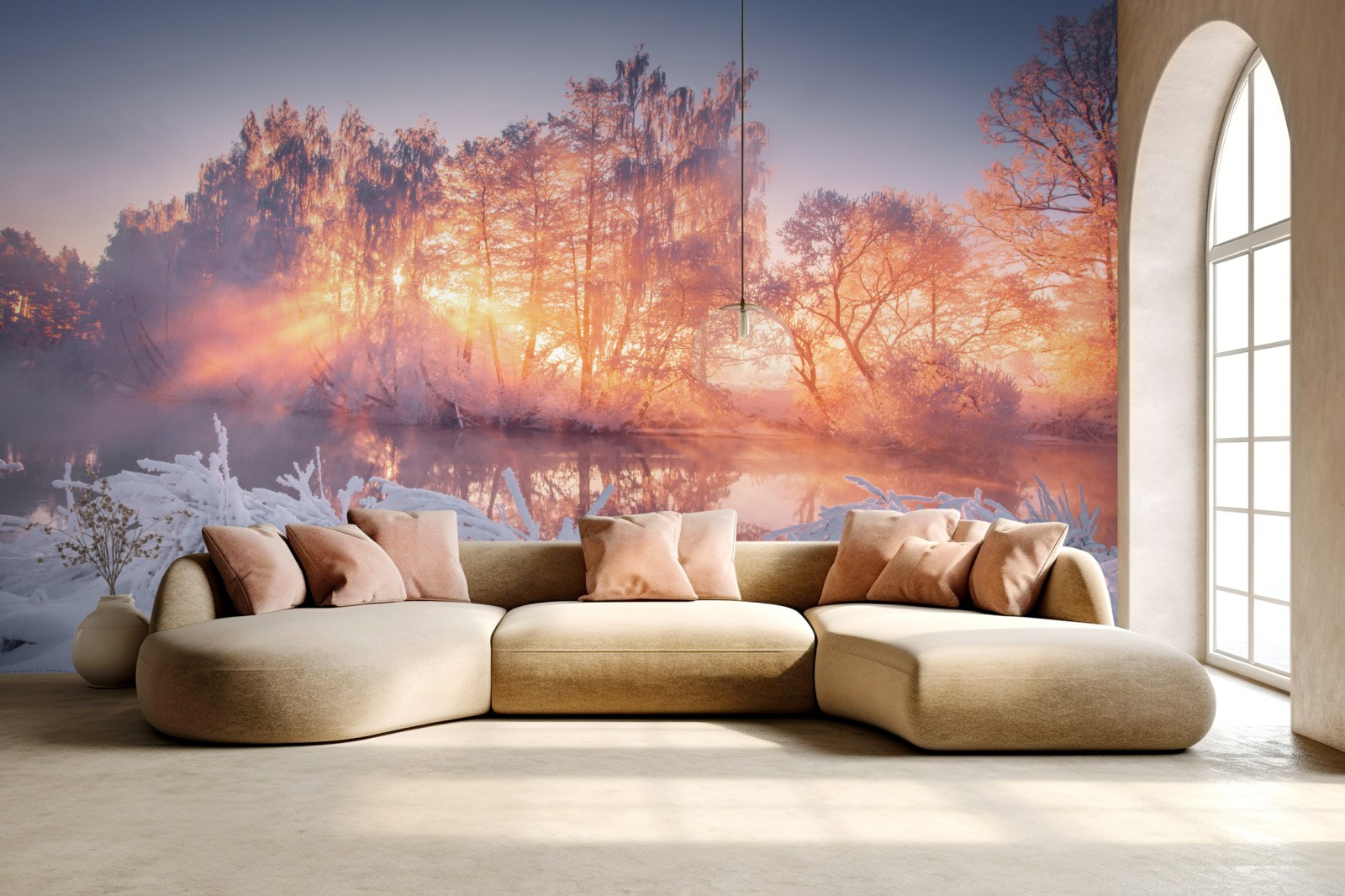 Odkryj spokojne piękno zimowego wschodu słońca z promieniami przebijającymi się przez oszronione drzewa, idealne do ocieplenia każdego wnętrza.
