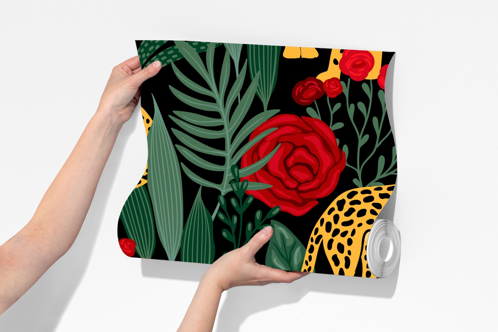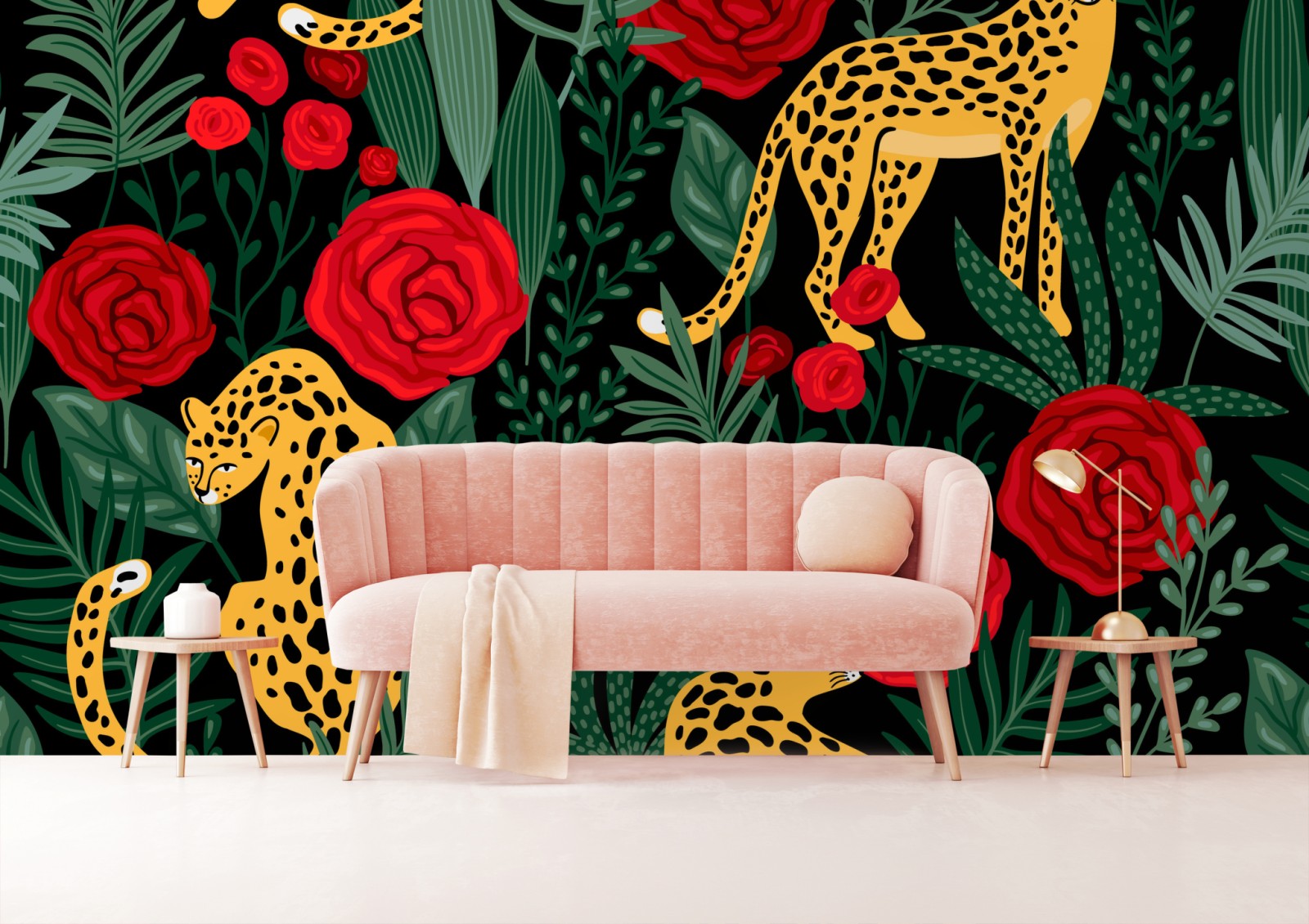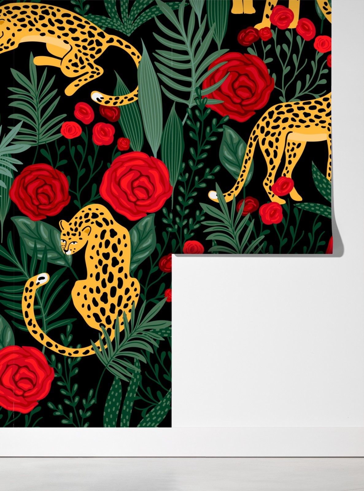 Dodaj tropikalnej energii do wnętrza dzięki odważnym gepardom i czerwonym różom na głębokim czarnym tle.