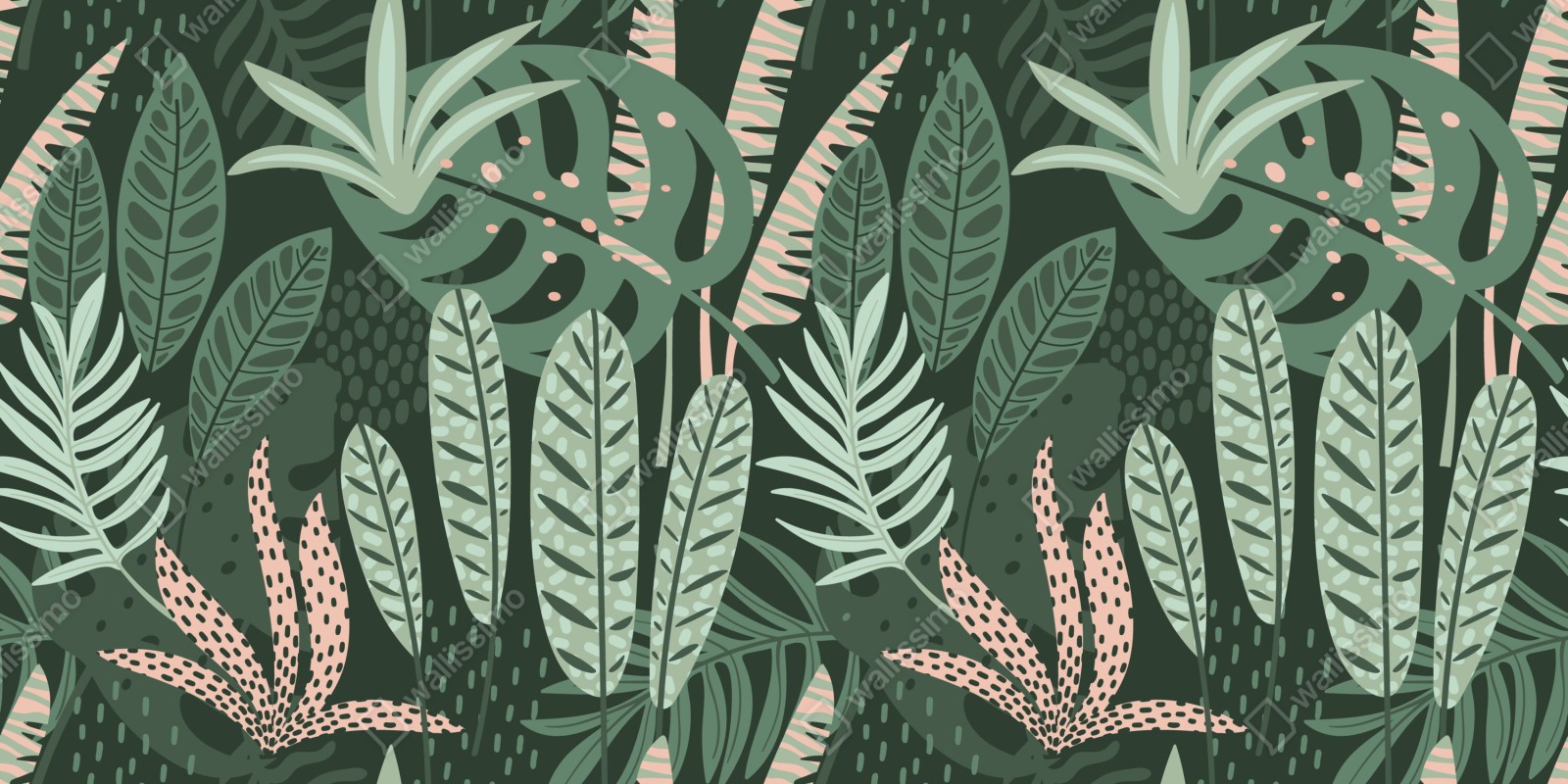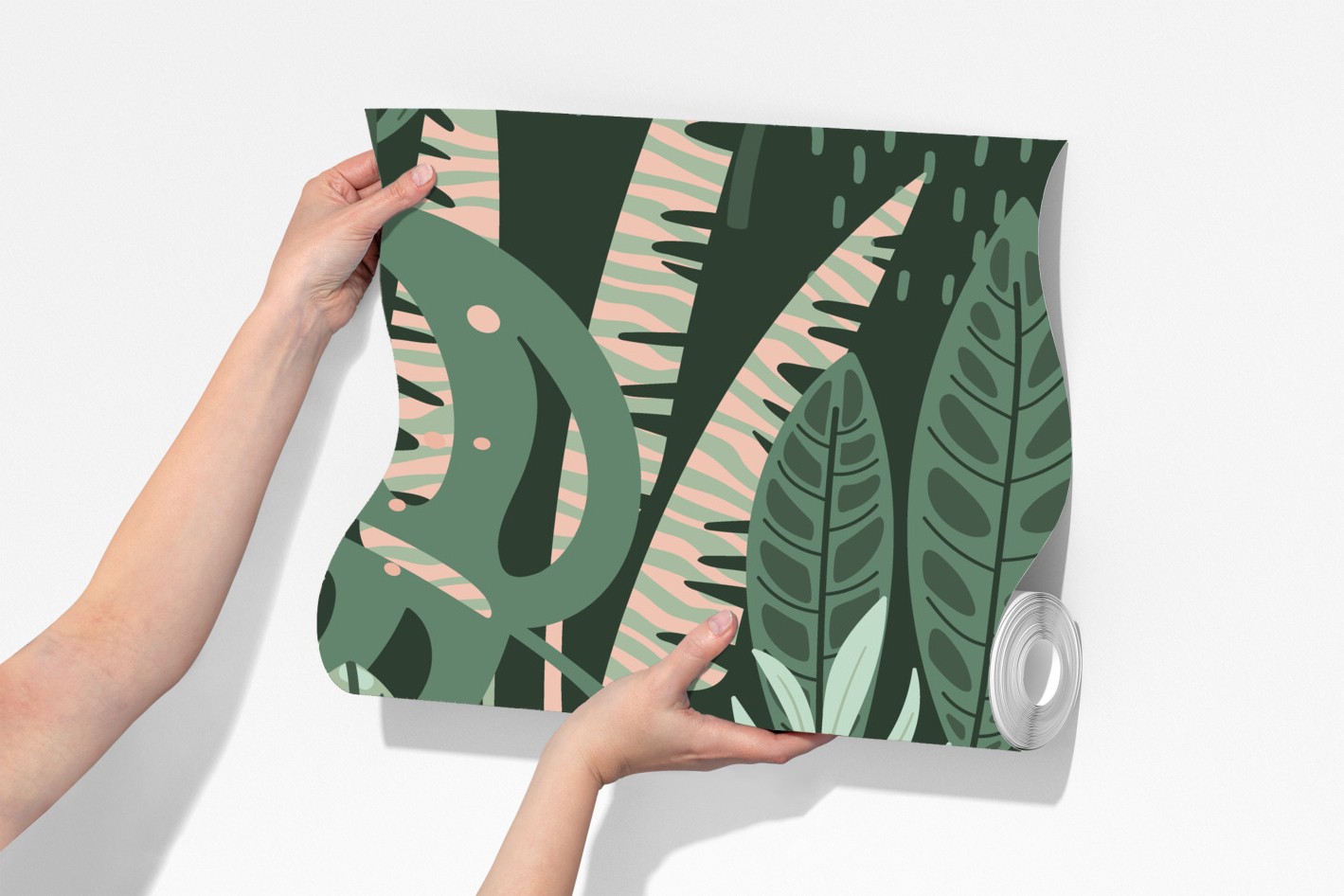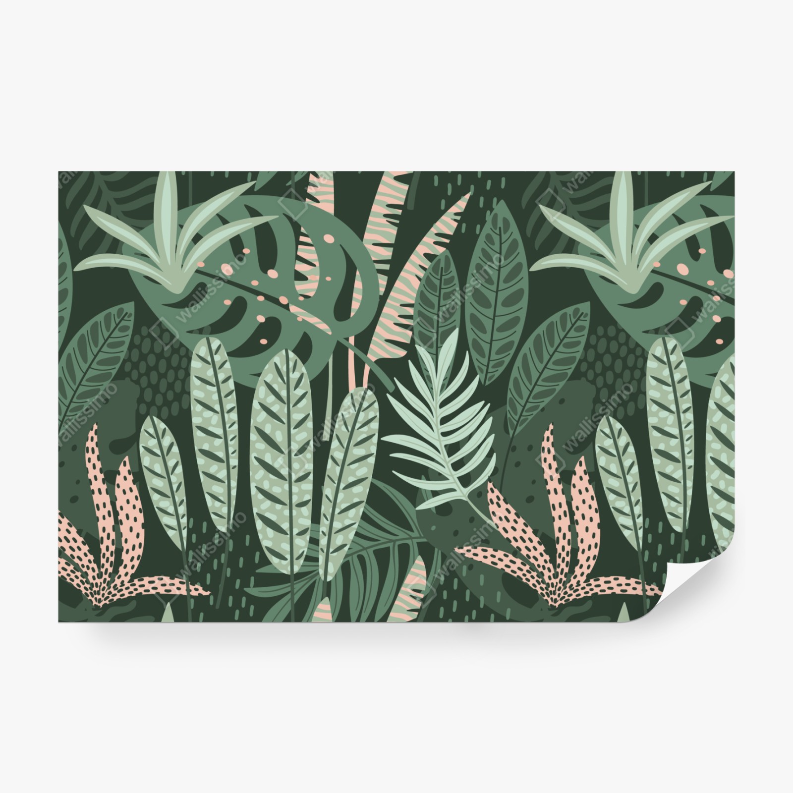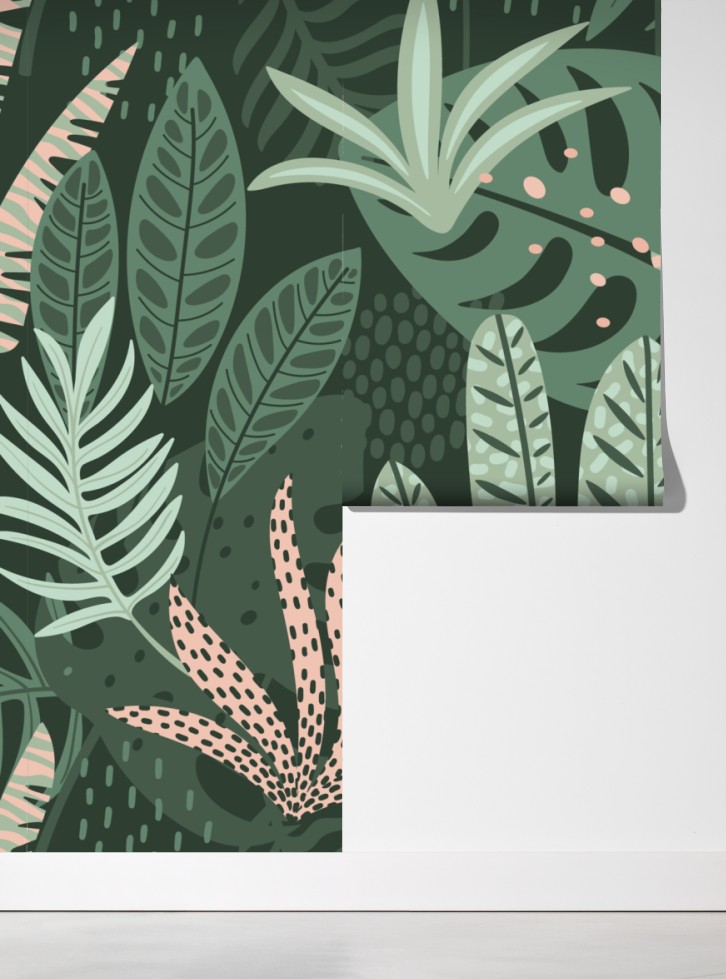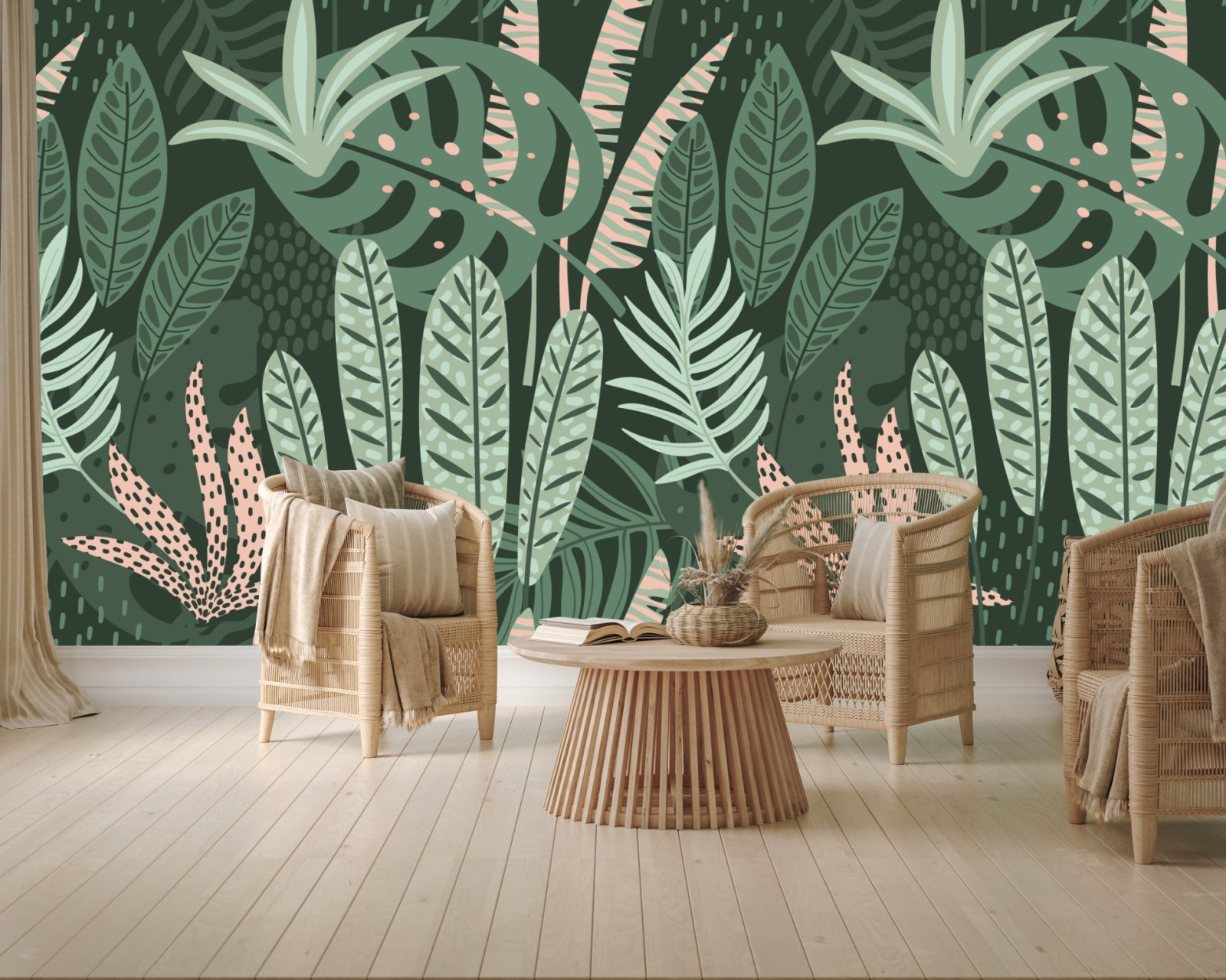 Wprowadź kojące zielone odcienie i subtelne różowe akcenty do wnętrza dzięki temu botanicznemu wzorowi liści, idealnemu do dodania naturalnego akcentu.