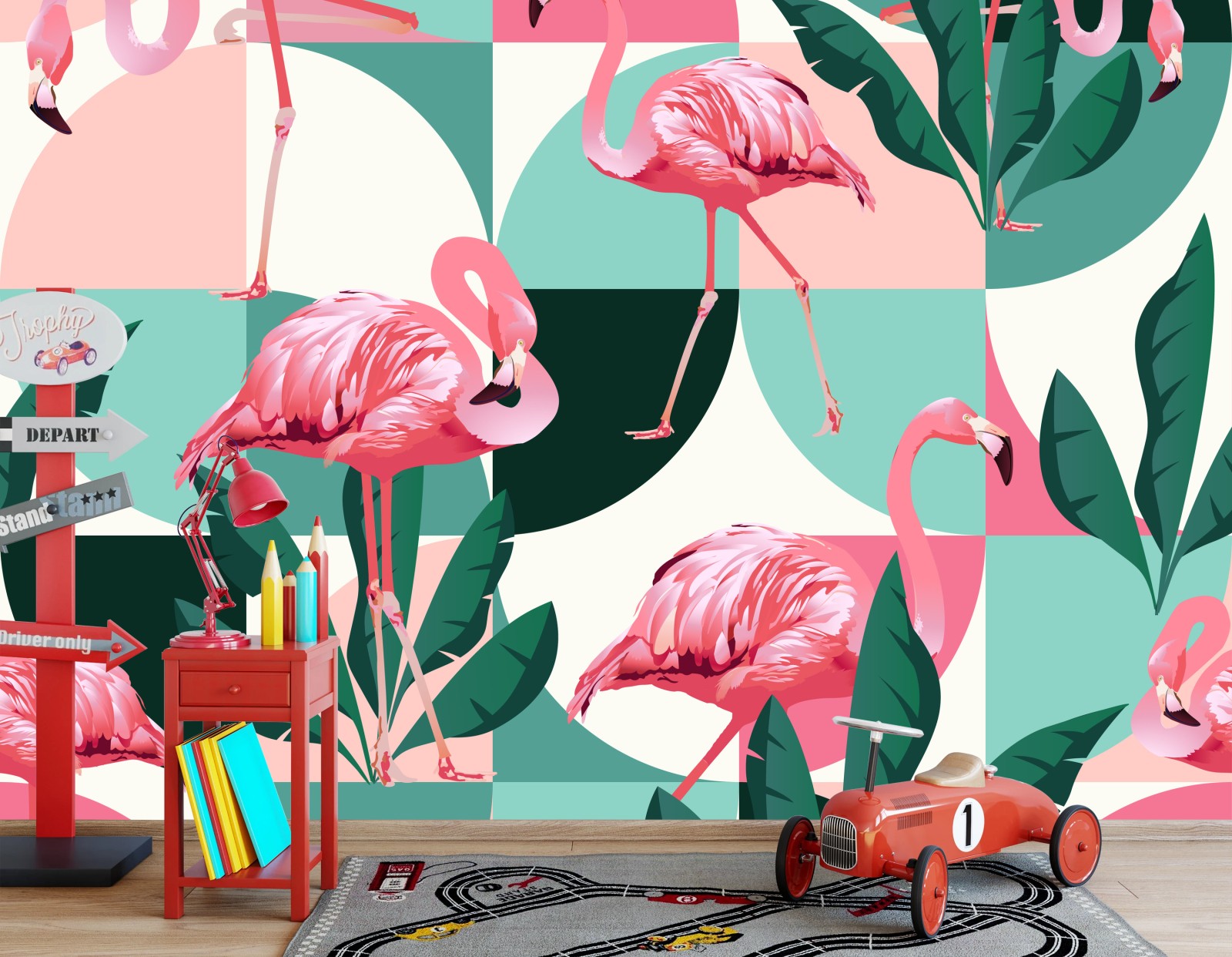 - geometryczny, wzór, dekoracja, tropikalny, liście, egzotyczny, lato, różowy, pastelowy, flamingi