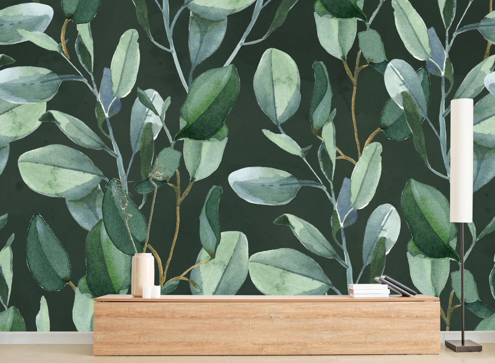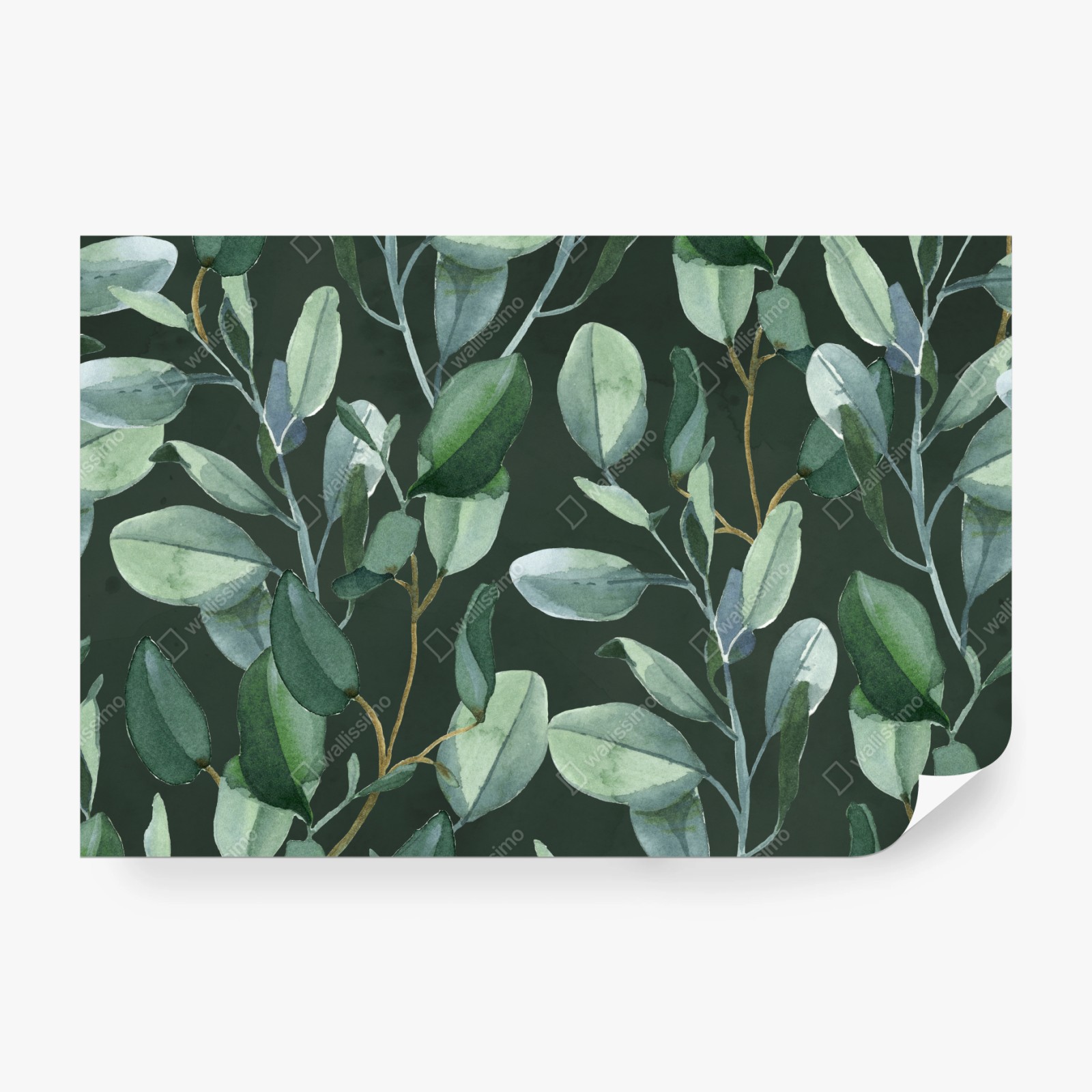 Fototapeta Wzór akwarelowy z liśćmi eukaliptusa na ciemnozielonym tle
