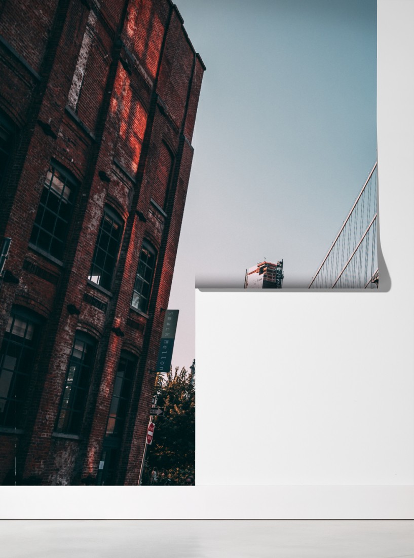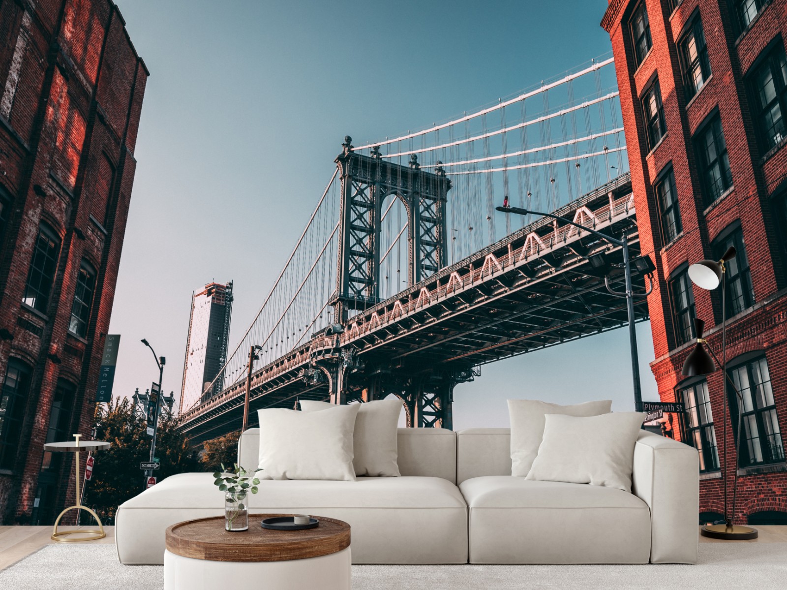 Dodaj do wnętrza odrobinę miejskiego charakteru dzięki zdjęciu Mostu Manhattan otoczonego zabytkowymi ceglanymi budynkami.