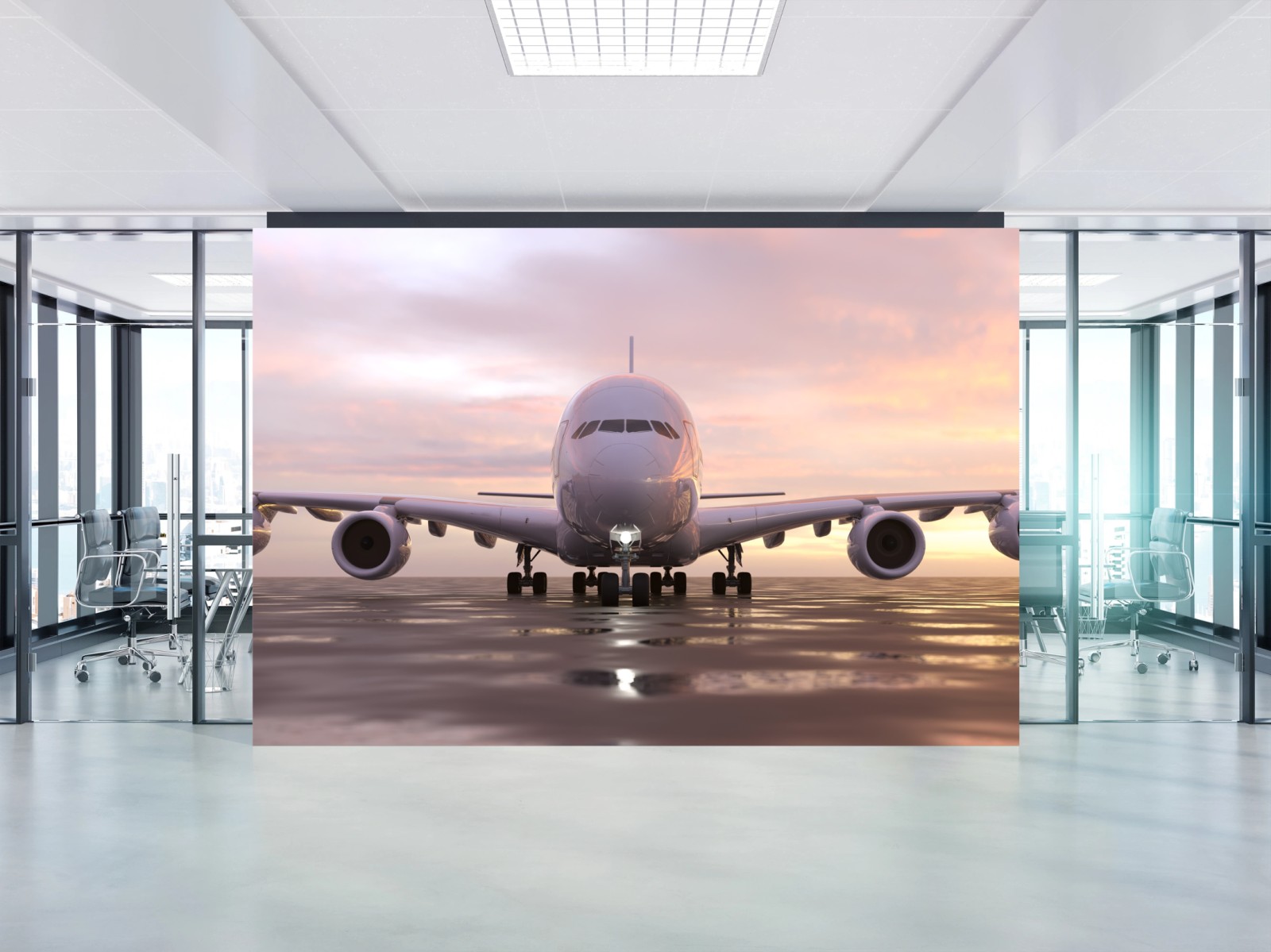 Fototapeta Odrzutowiec na pasie startowym o zachodzie słońca