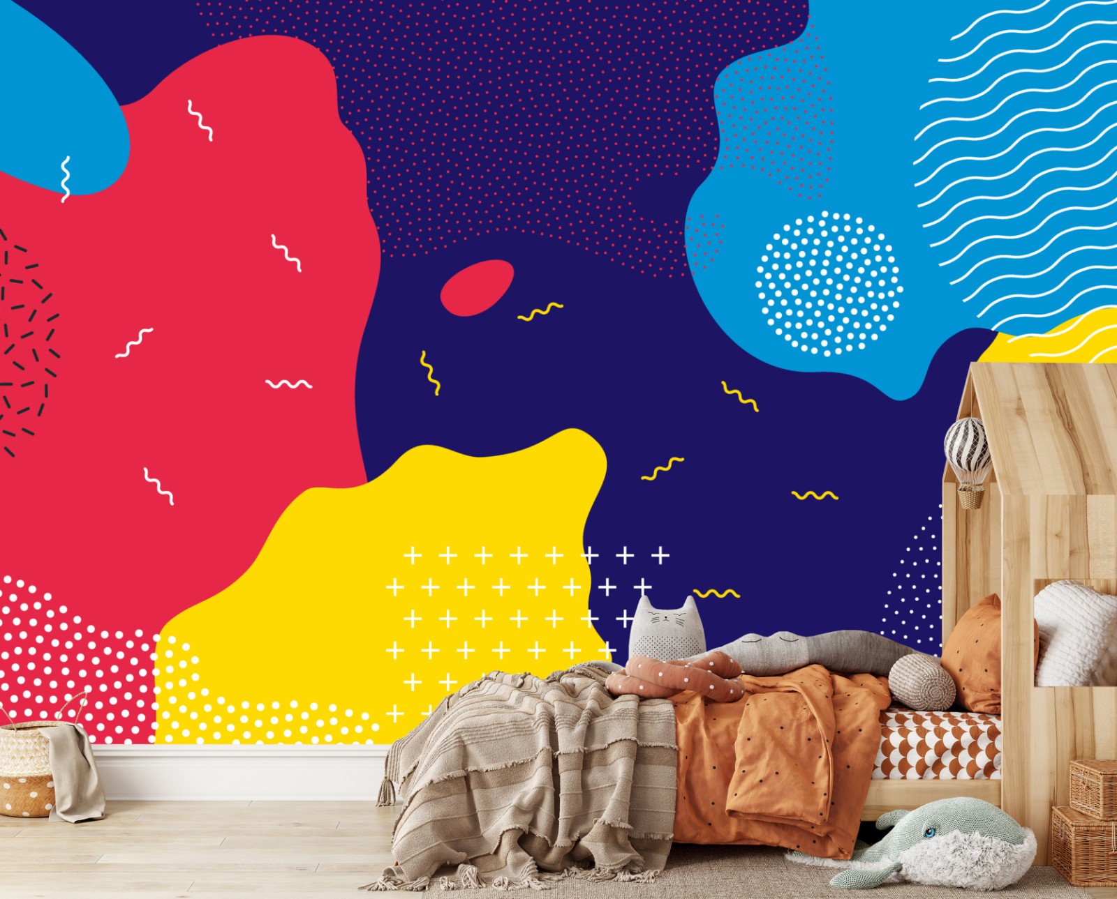 Jasna i energetyczna abstrakcyjna kompozycja z wyrazistymi kształtami i kolorami idealna do nowoczesnych wnętrz i dziecięcych pokoi.