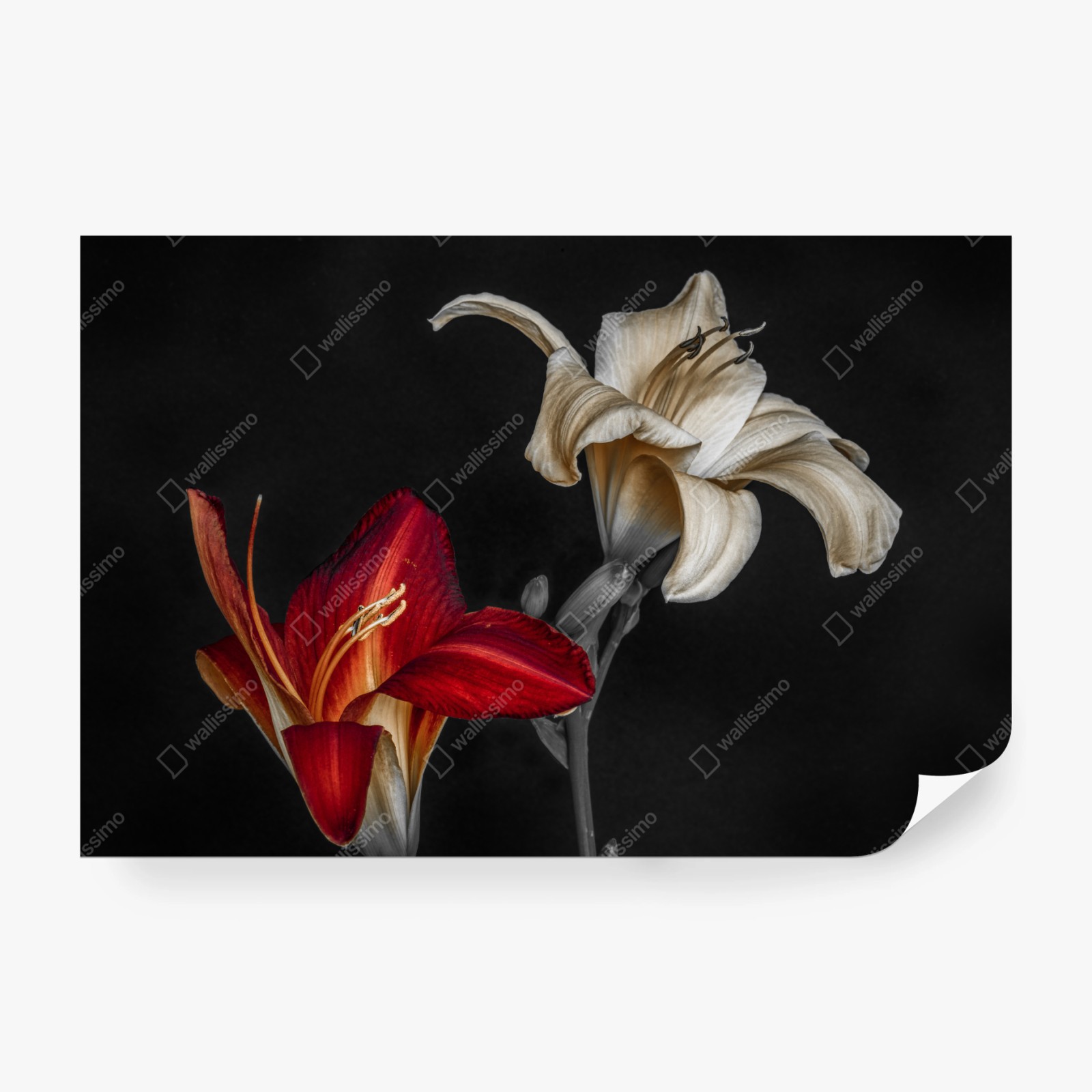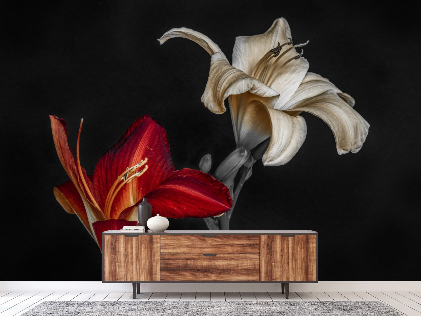 Fototapeta Dramatyczne czerwone i kremowe lilie na czarnym tle
