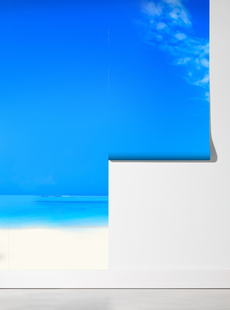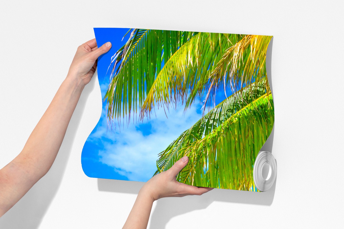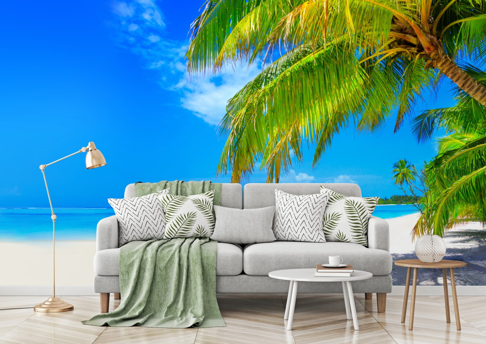 Przenieś spokojną atmosferę tropikalnej plaży do swojego wnętrza dzięki żywemu pejzażowi z palmami, białym piaskiem i krystalicznie czystą wodą.