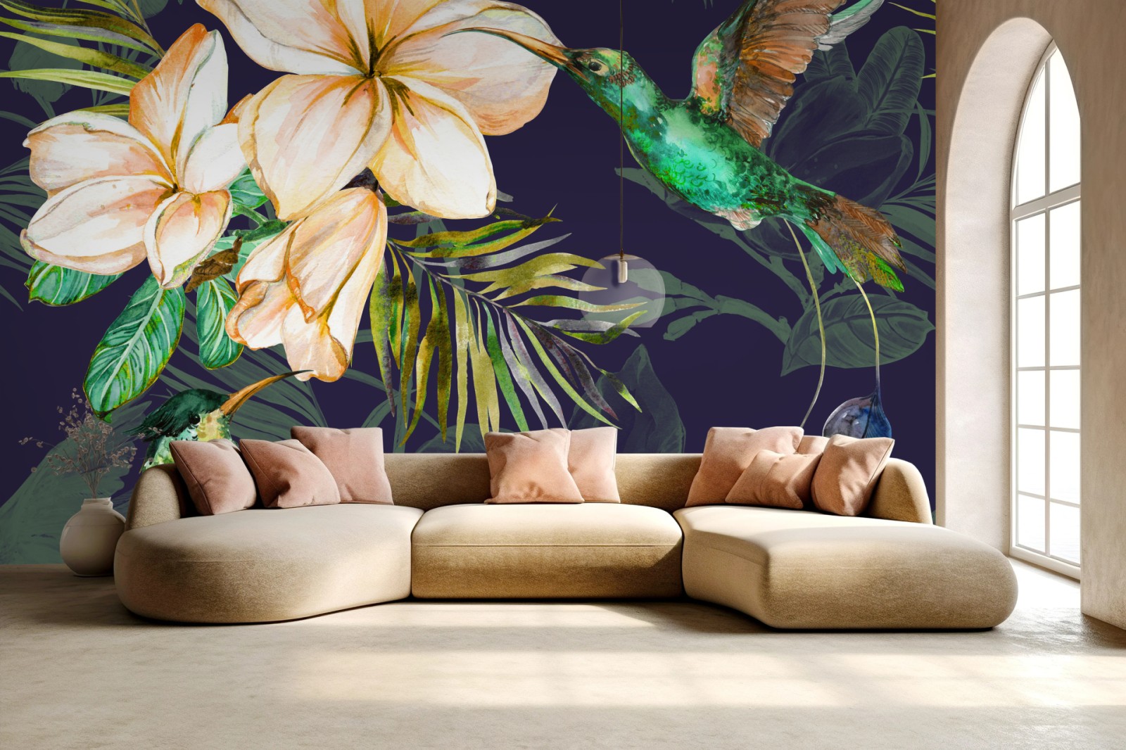 Fototapeta Tropikalne kolibry i plumeria w akwareli