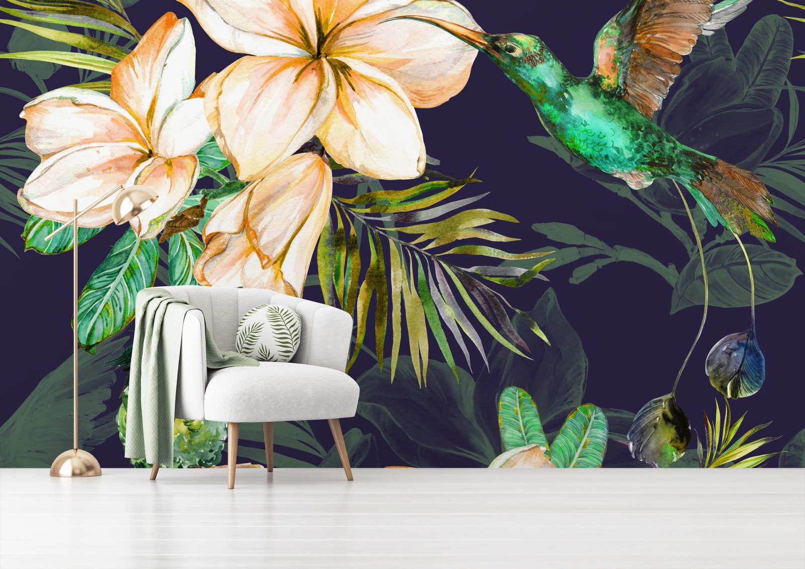 Fototapeta Tropikalne kolibry i plumeria w akwareli