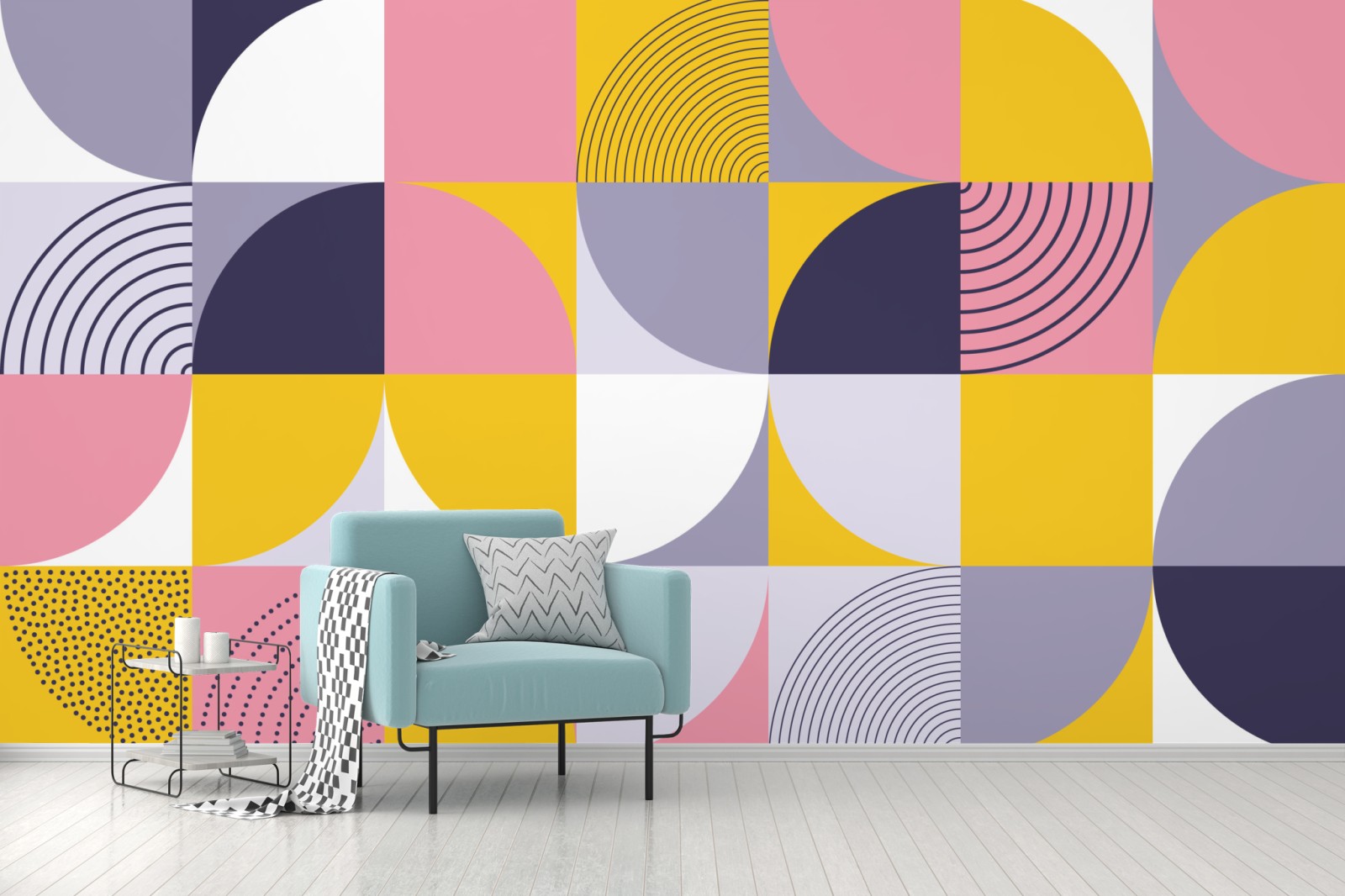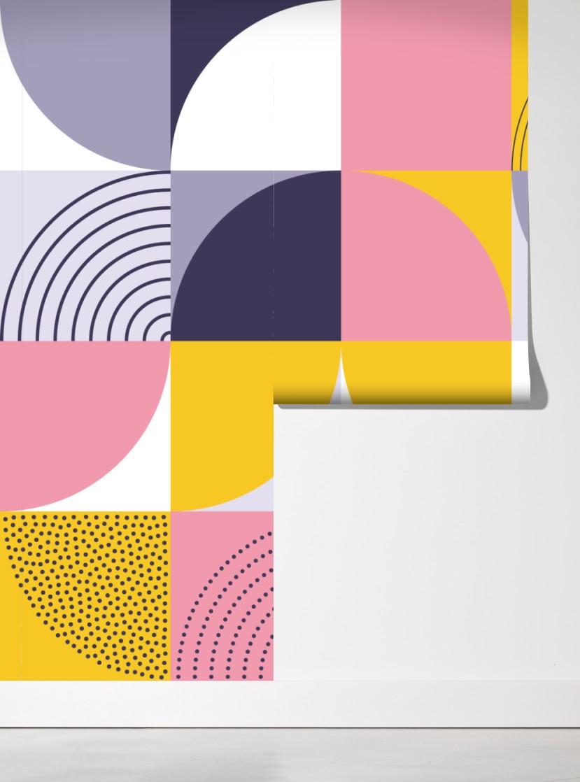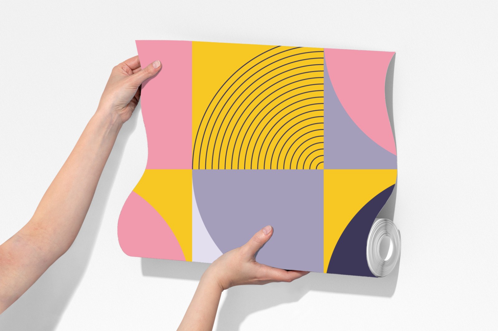 Ożyw swoje wnętrze geometrycznym wzorem w pastelowych odcieniach różu, żółci i fioletu, idealnym do nowoczesnych aranżacji.