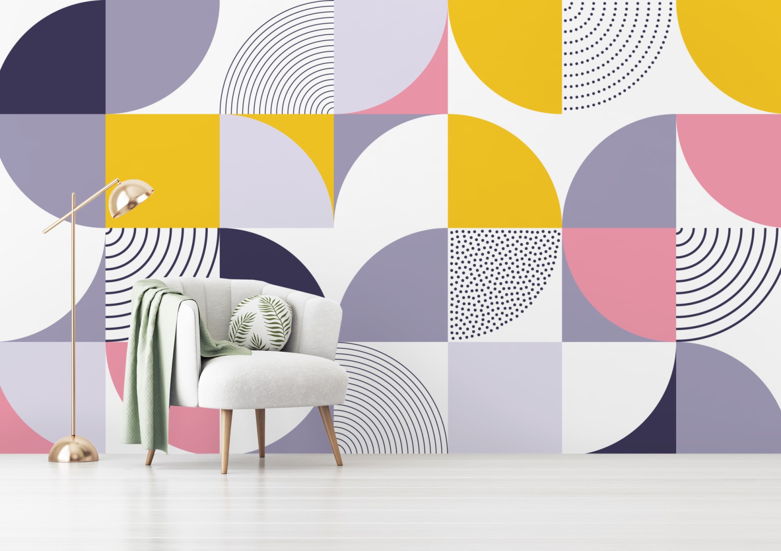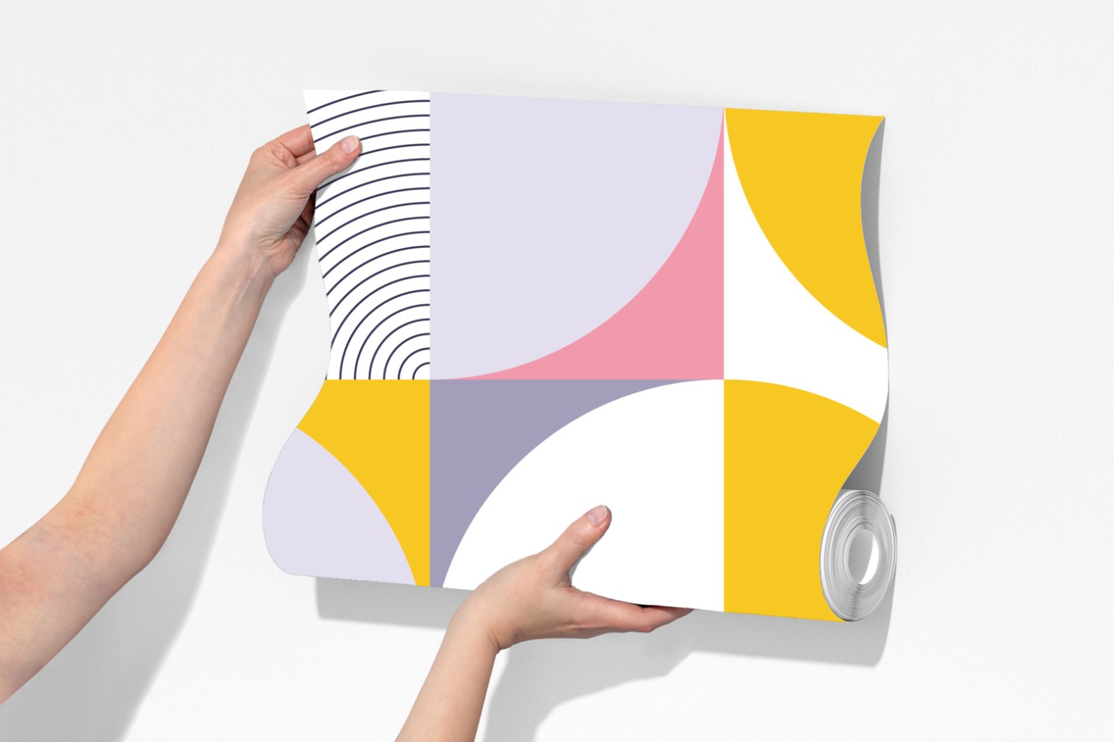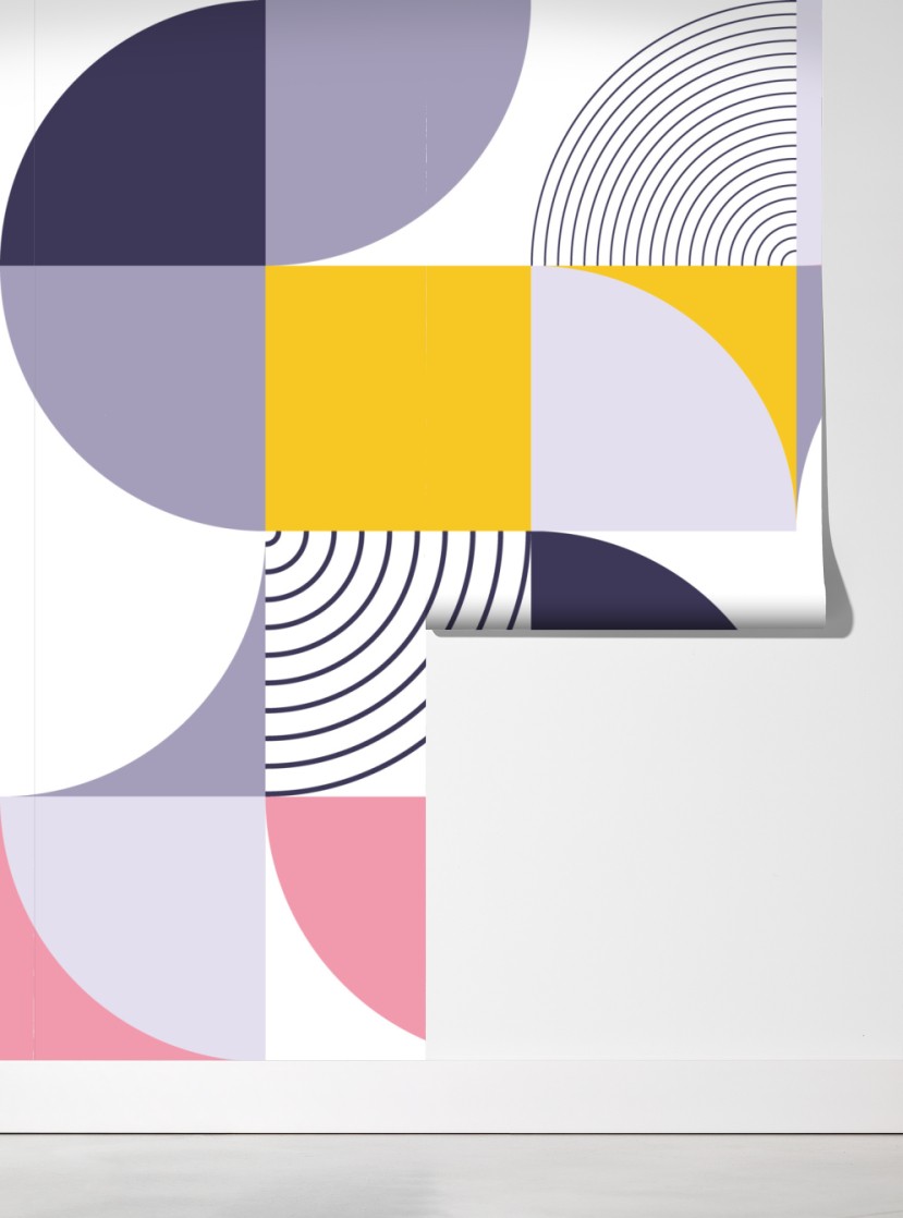 Dodaj współczesnego uroku swoim ścianom dzięki pastelowemu, geometrycznemu wzorowi łączącemu delikatne lawendowe i różowe odcienie z żółtymi akcentami.