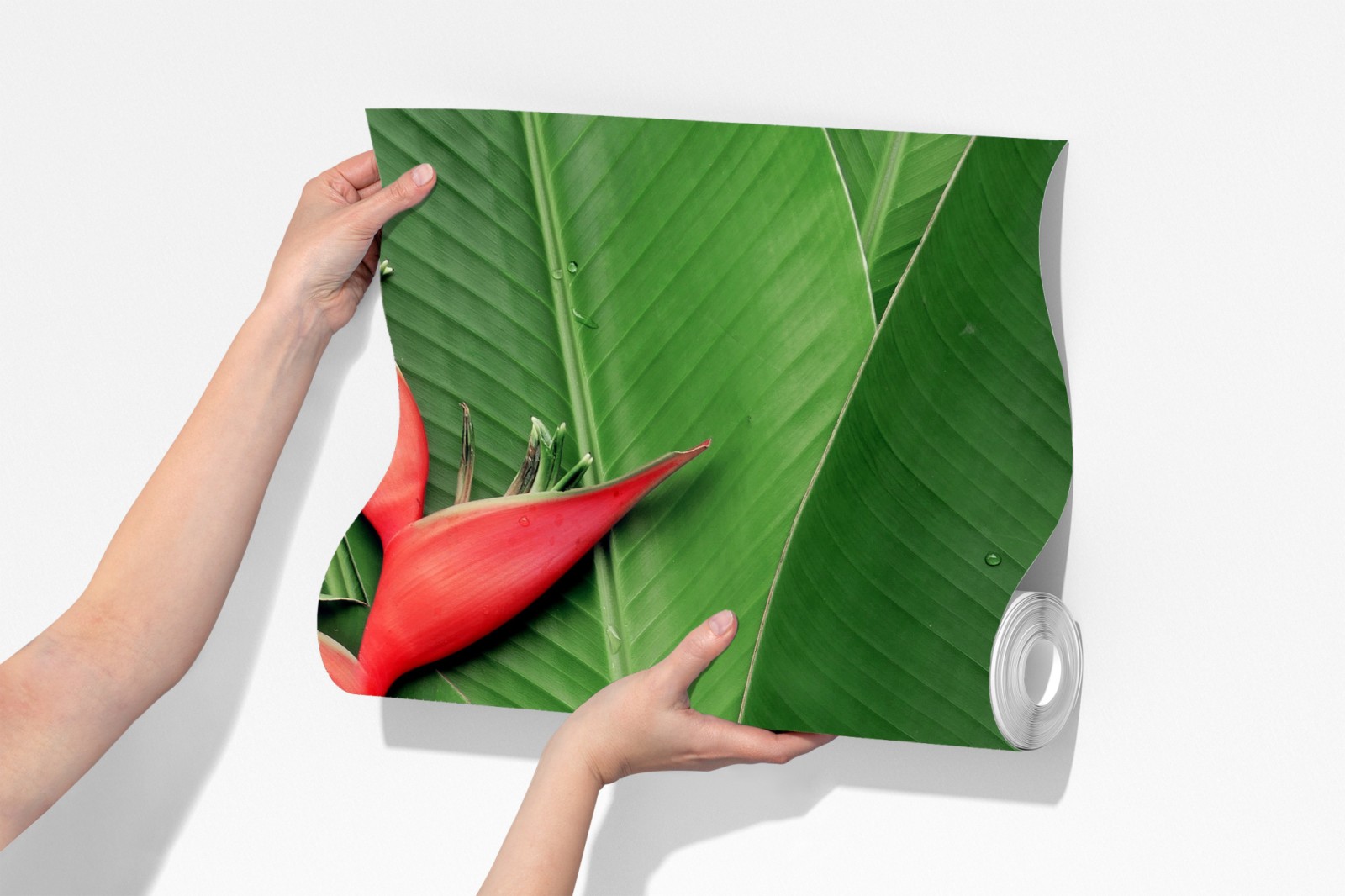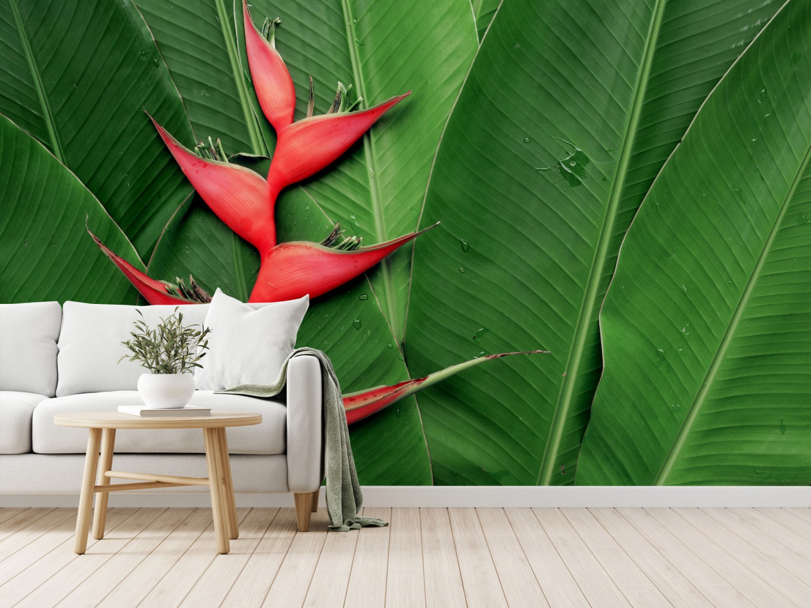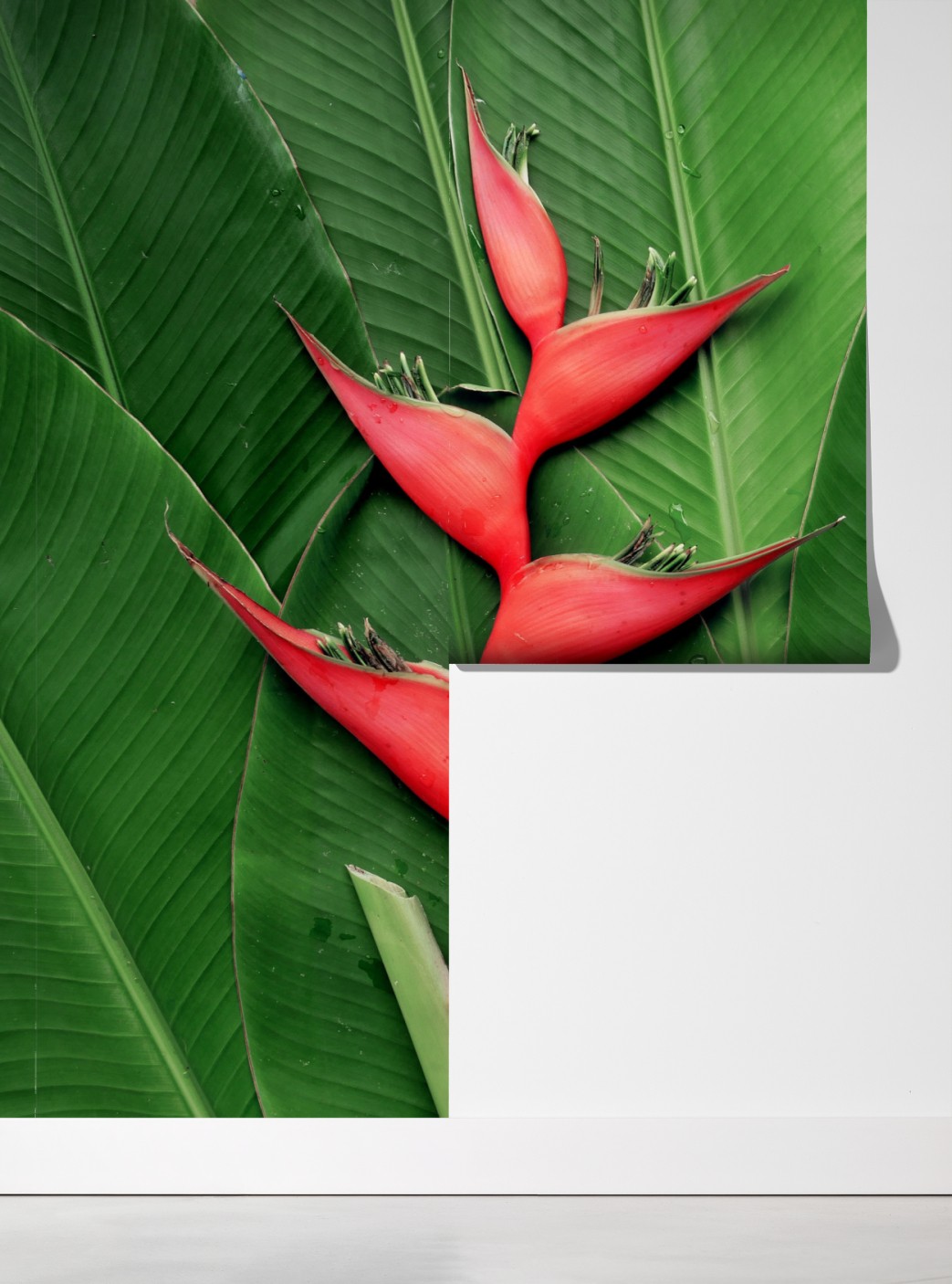 Wprowadź tropikalną elegancję do wnętrza dzięki intensywnej kompozycji heliconii z czerwonymi kwiatami na tle bujnych zielonych liści.