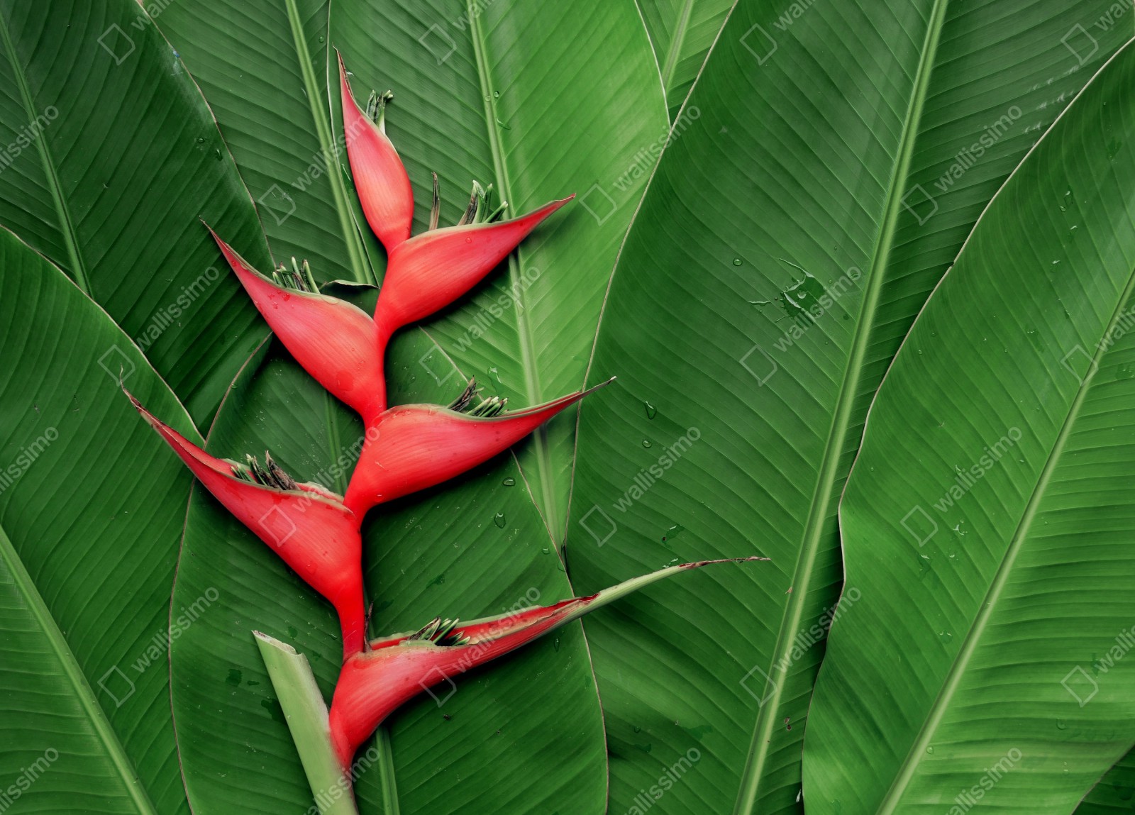 Fototapeta Intensywna heliconia na tropikalnych liściach