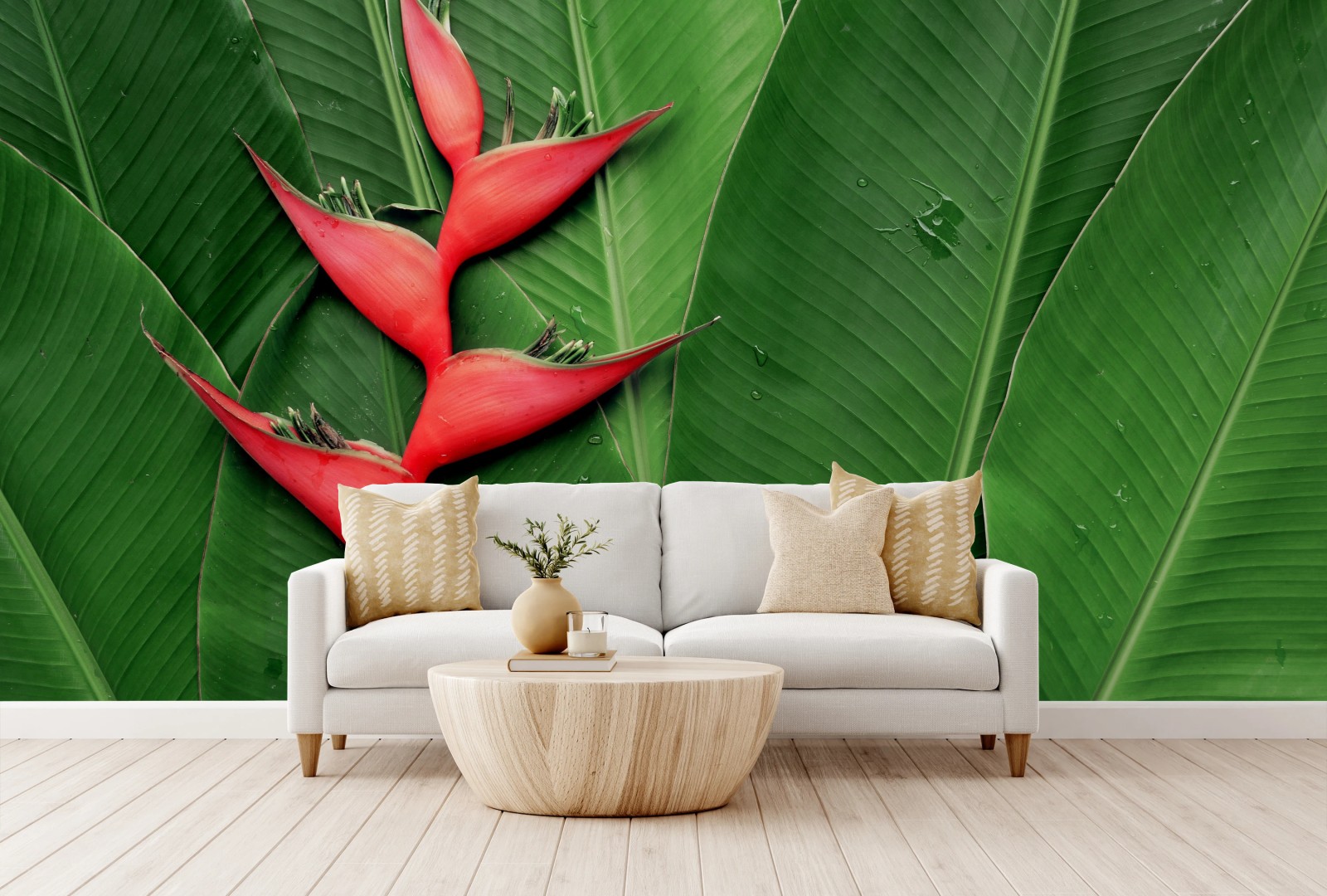 Fototapeta Intensywna heliconia na tropikalnych liściach