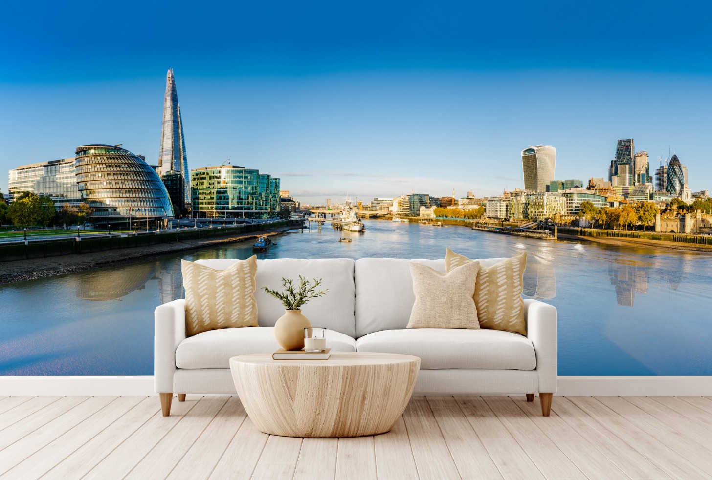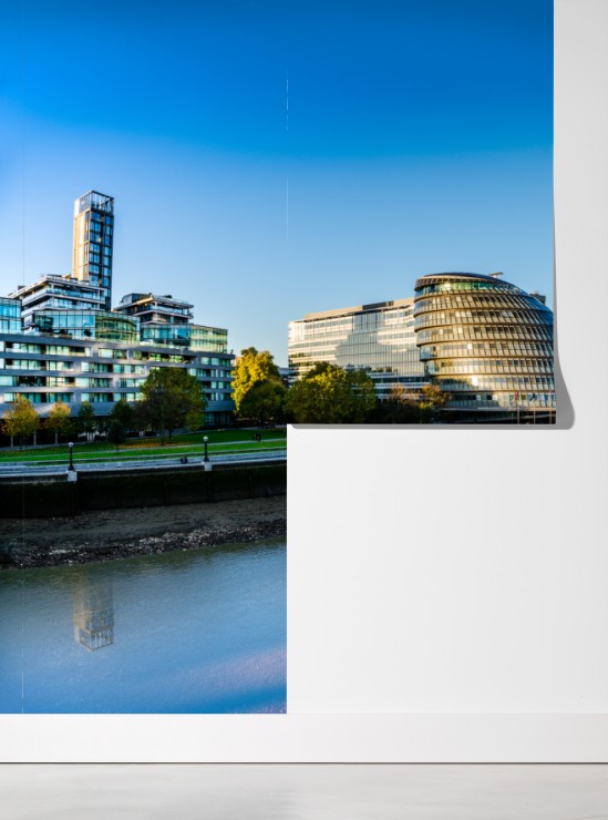 Odkryj dynamiczną panoramę Londynu, która wnosi nowoczesną energię miejską i łagodne odbicia rzeki do każdego wnętrza.