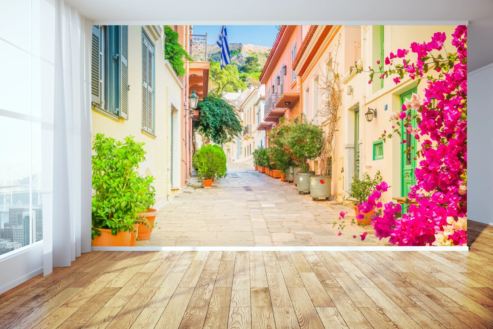 Fototapeta Słoneczna grecka uliczka z bougainvilleą