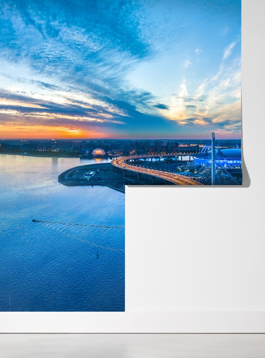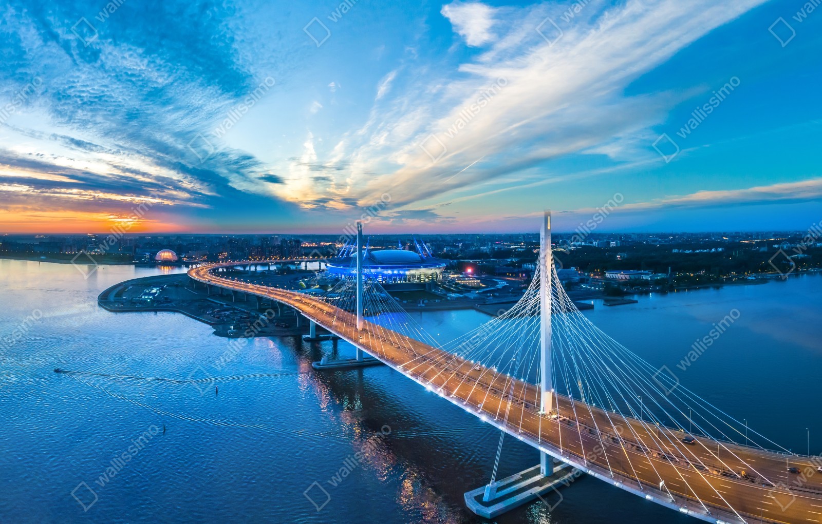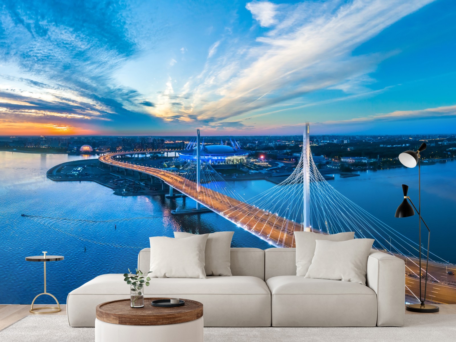Ożyw swoje wnętrze panoramicznym widokiem mostu w Sankt Petersburgu o zmierzchu, łączącym spokój i nowoczesną architekturę.