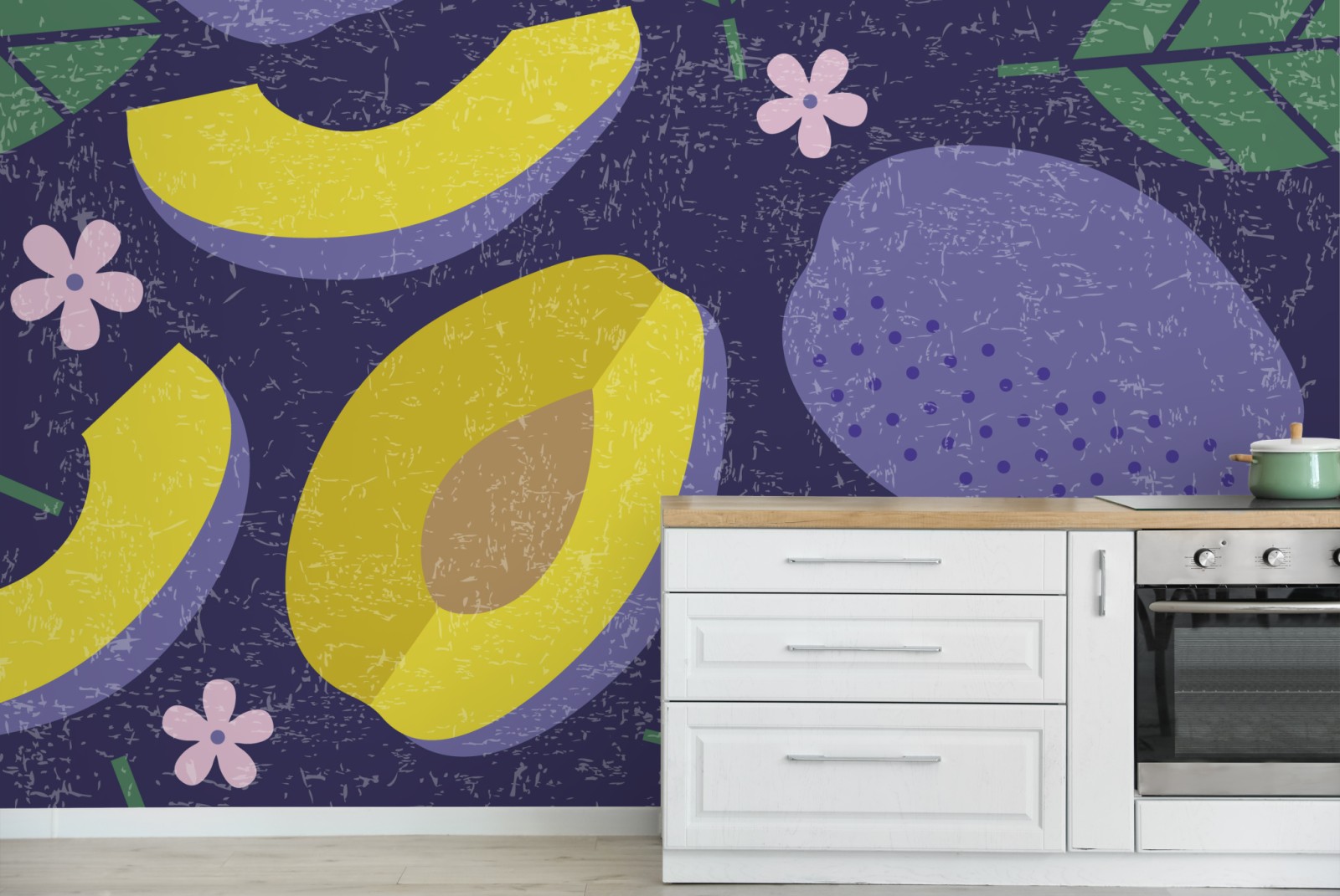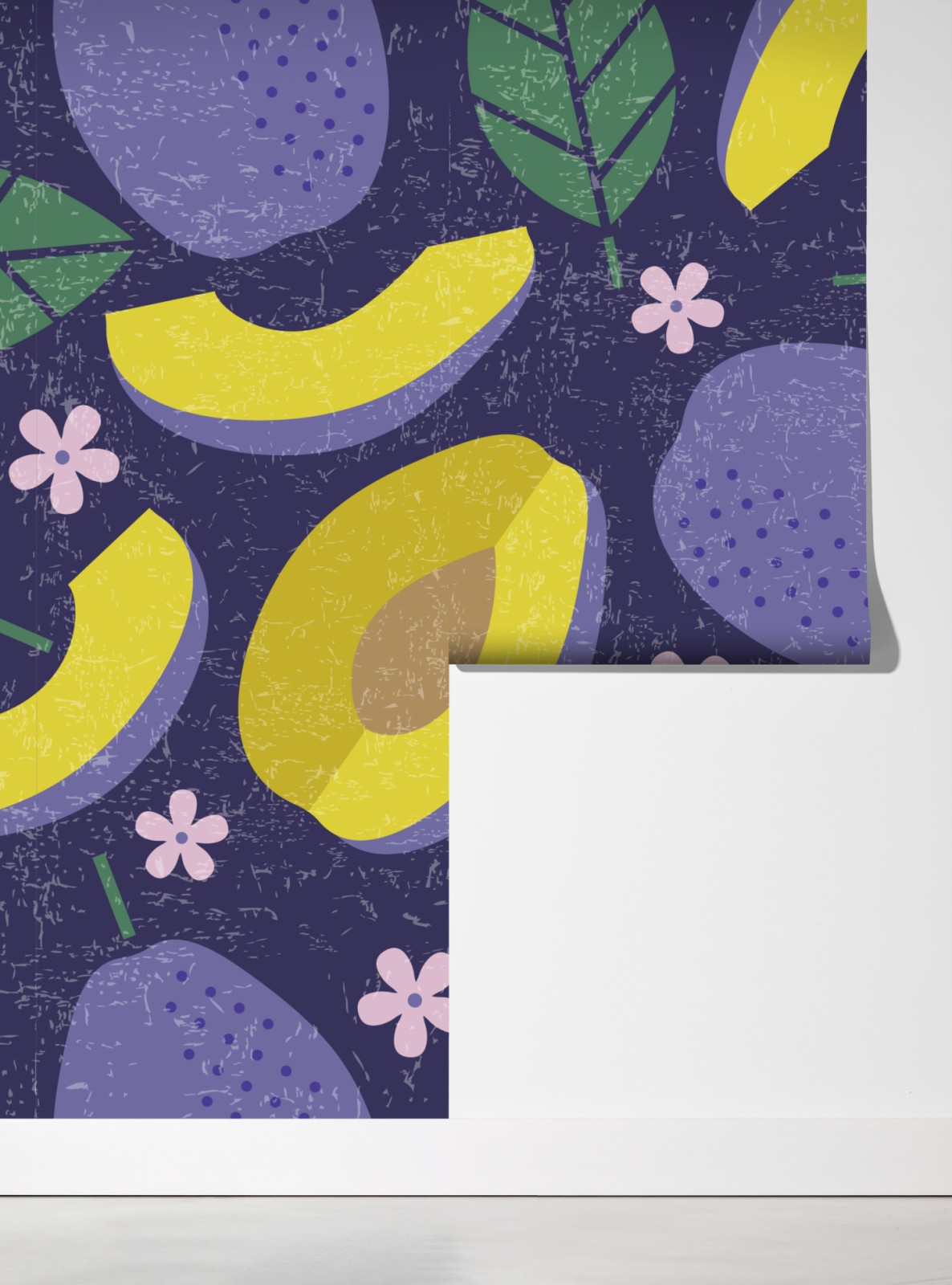 Jasny i wesoły wzór owocowy ze śliwkami, liśćmi i kwiatami, który ożywi kuchnię lub jadalnię.