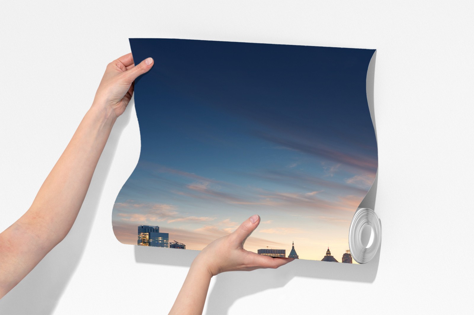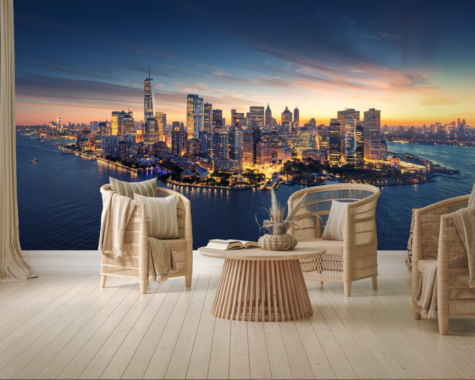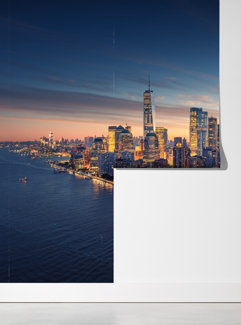 Dodaj miejskiego charakteru do wnętrza dzięki panoramicznemu widokowi Manhattanu o wschodzie słońca.