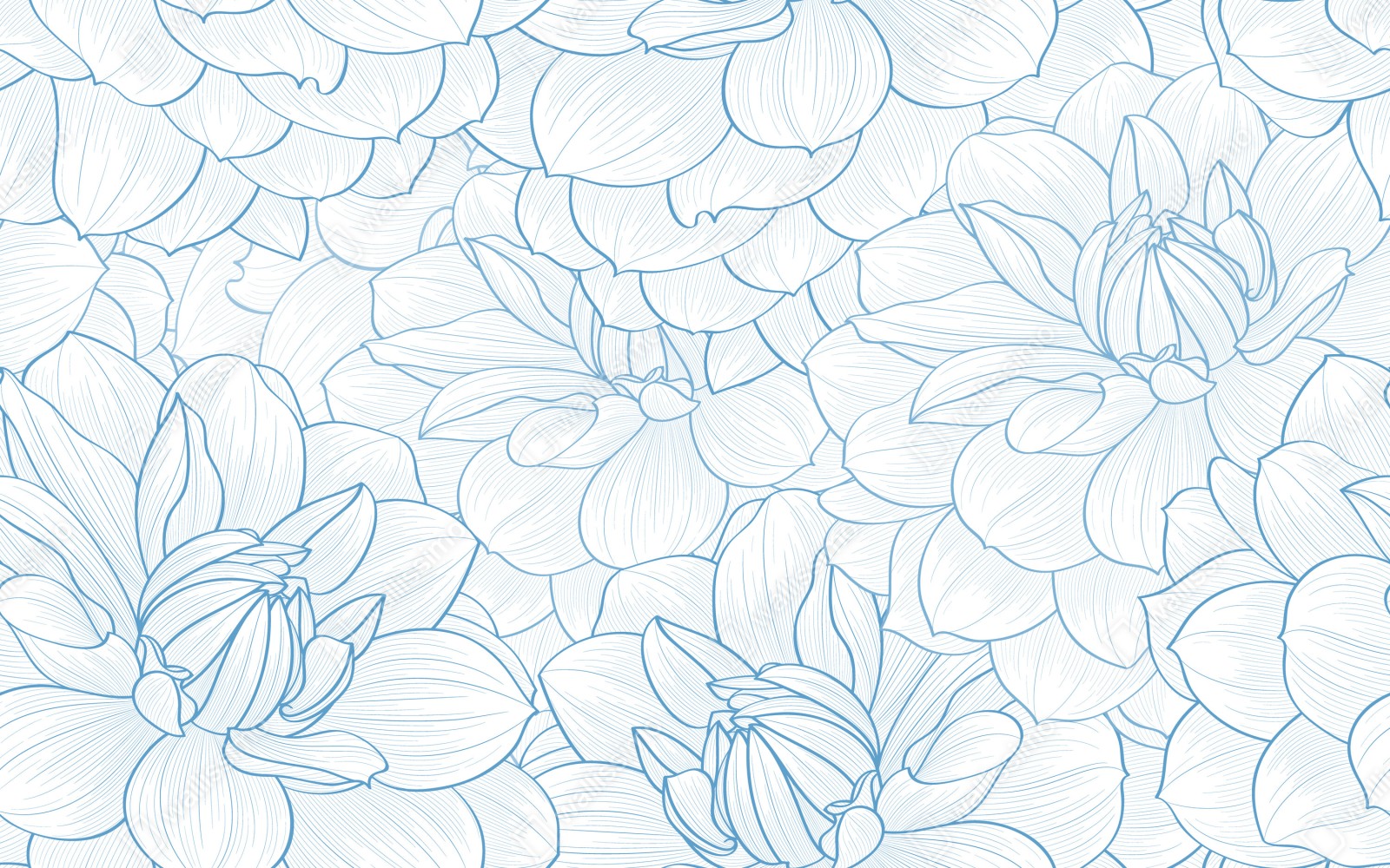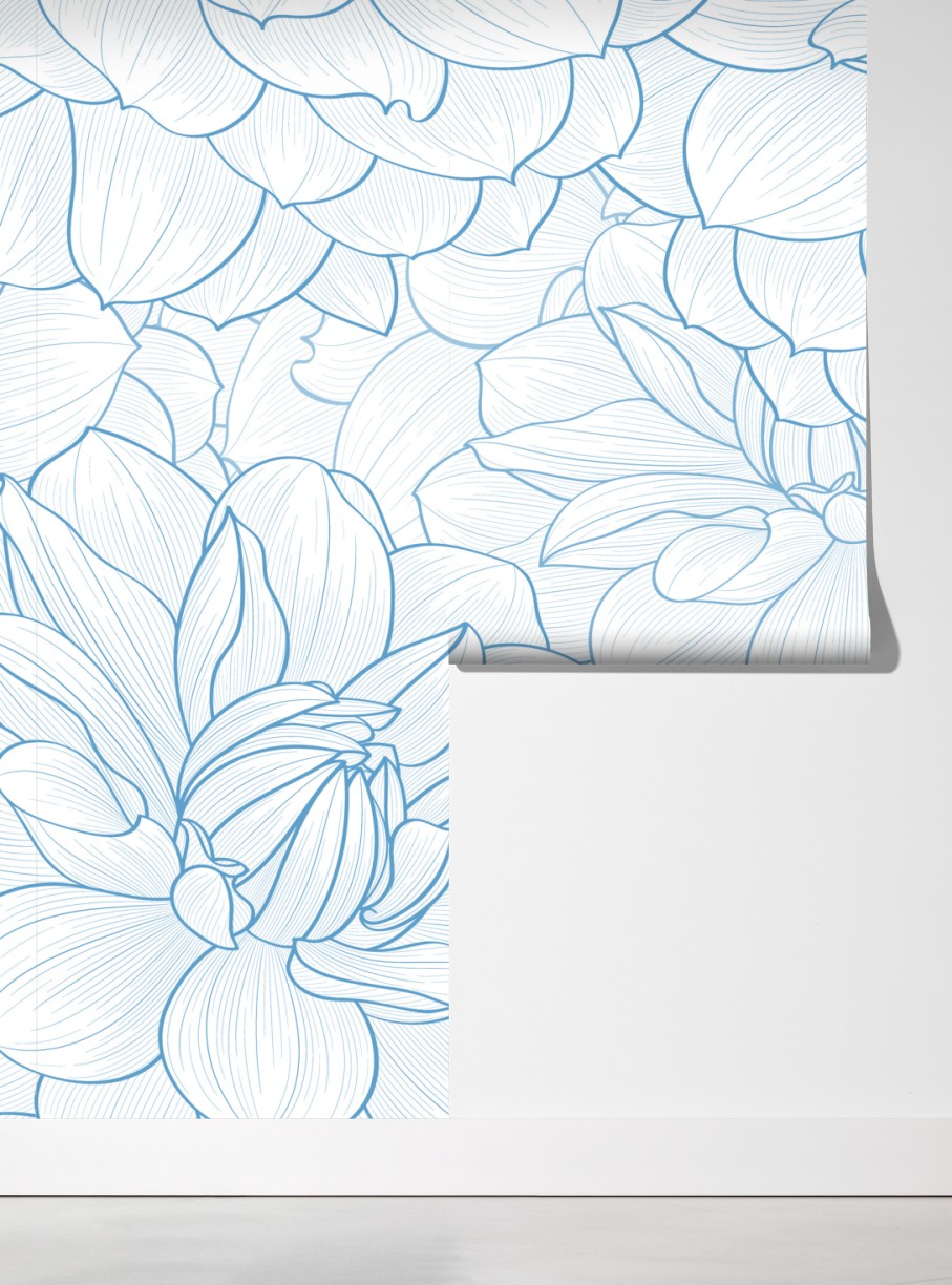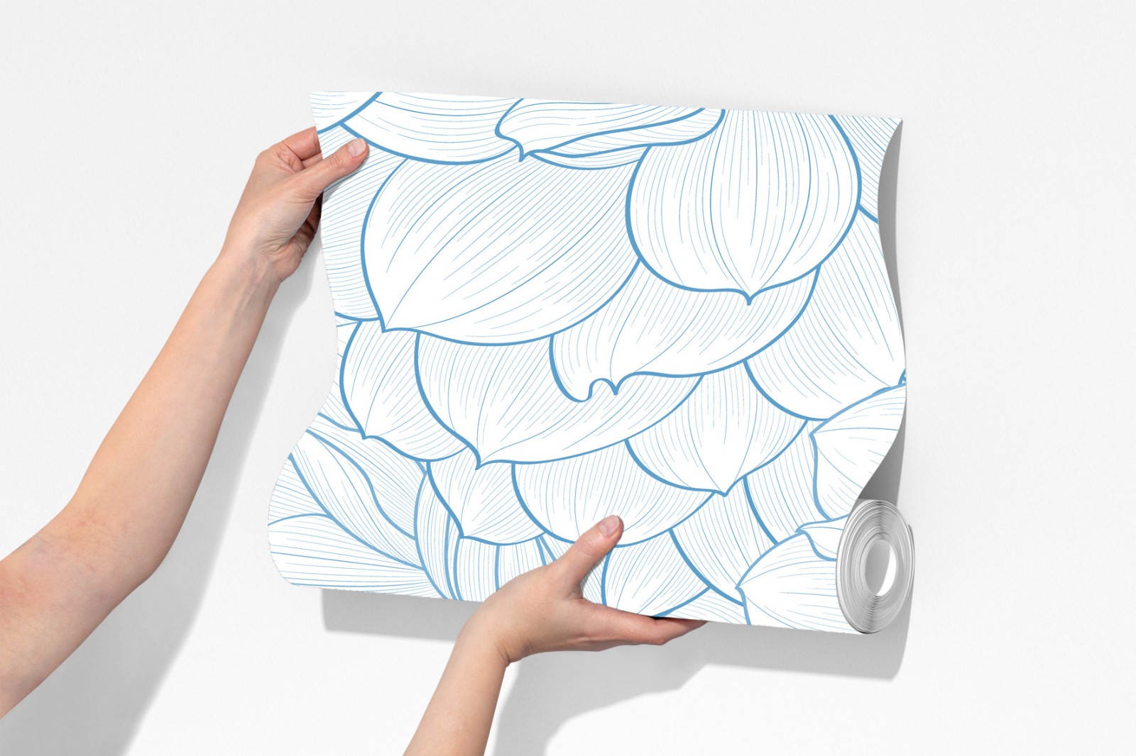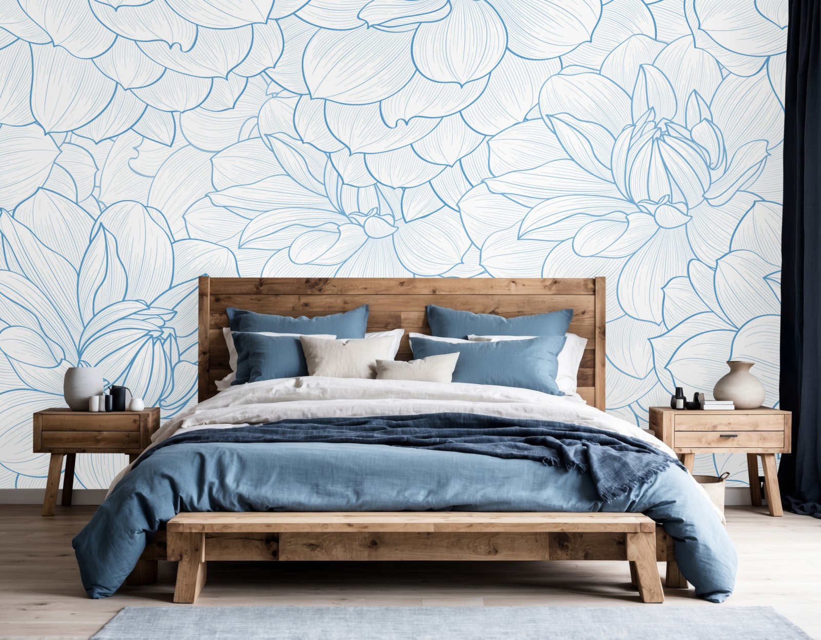 Elegancki, ręcznie rysowany wzór kwiatowy w delikatnych niebieskich tonacjach, który wnosi uspokajający, botaniczny urok do każdego wnętrza.