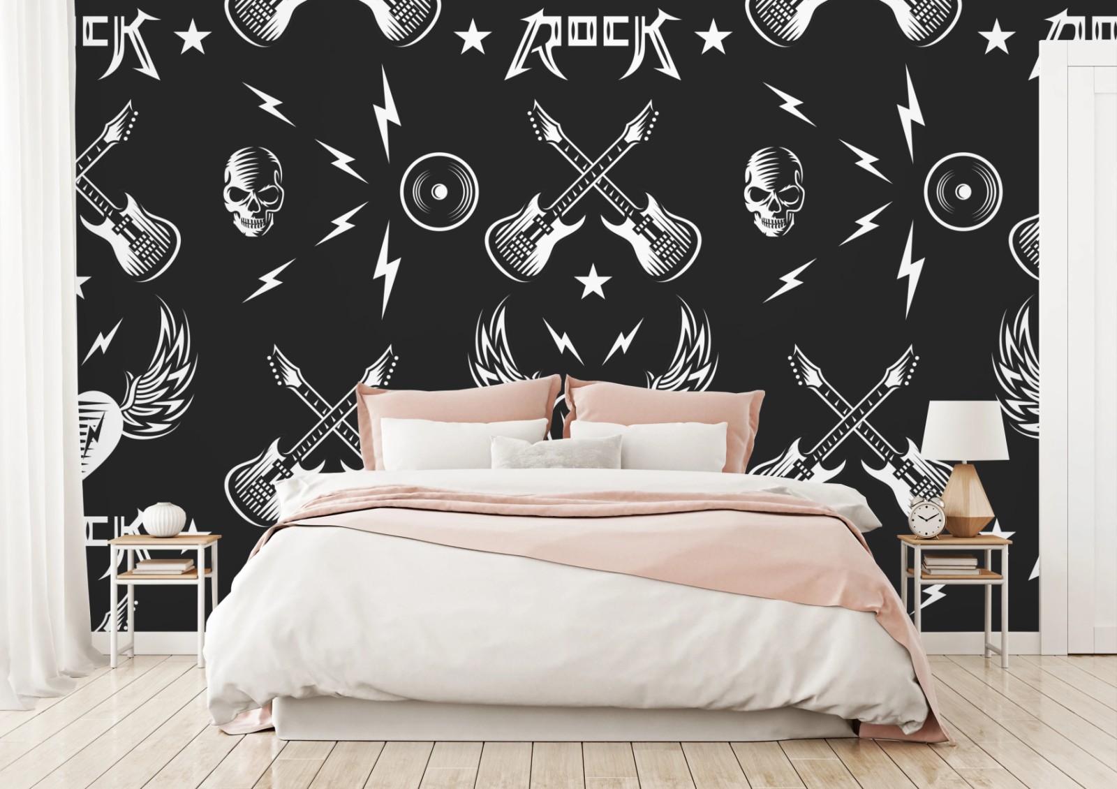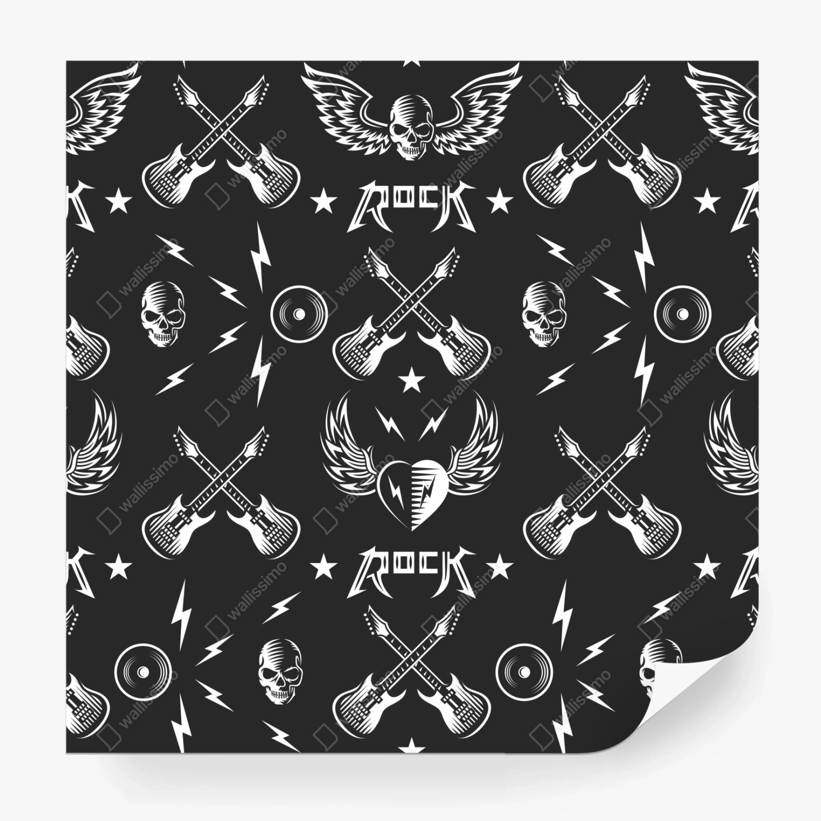 - muzyka, winyl, wzór bezszwowy, gwiazdy, monochromatyczne, rock, gitary, czaszki, pioruny, serce ze skrzydłami