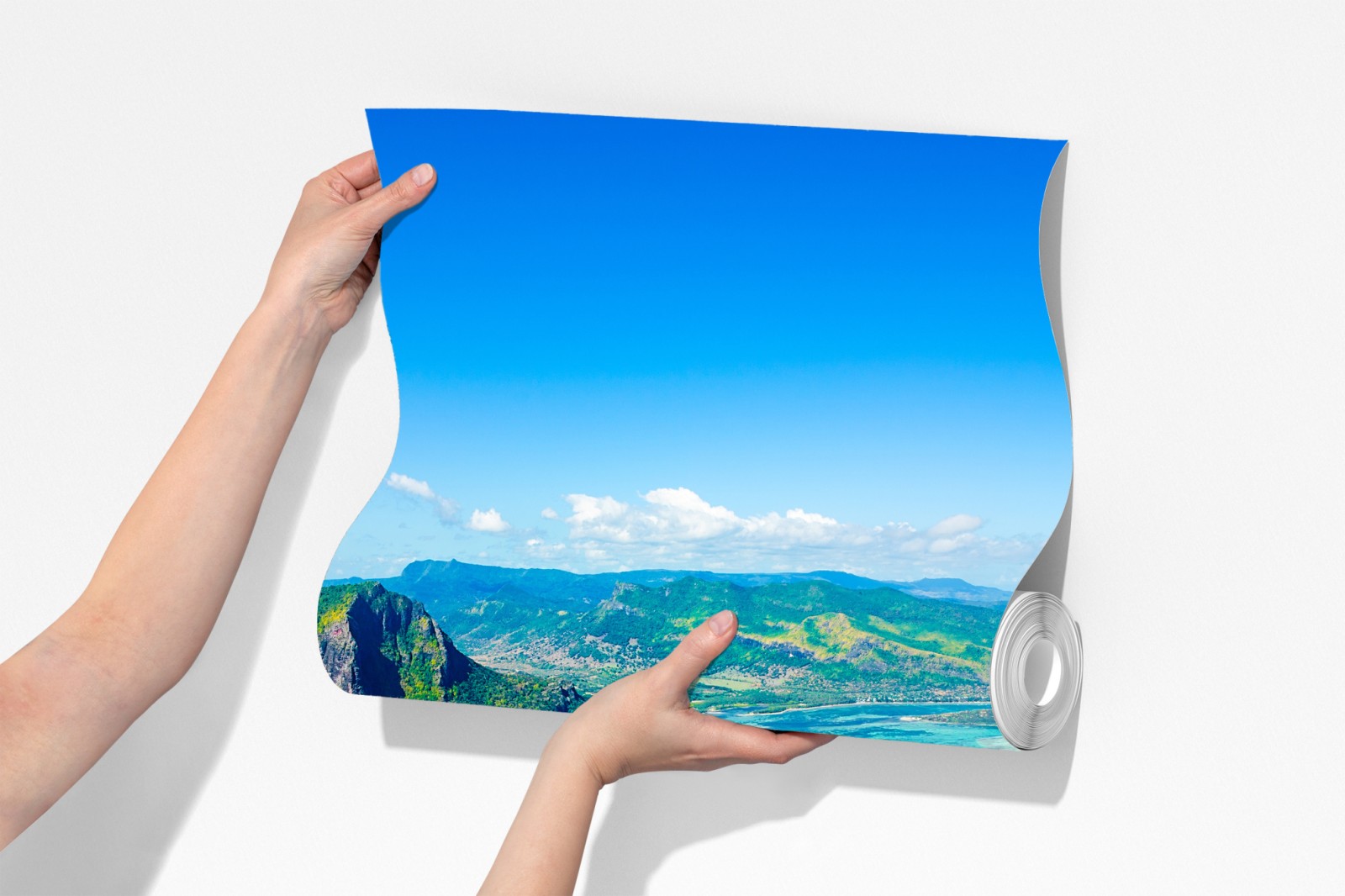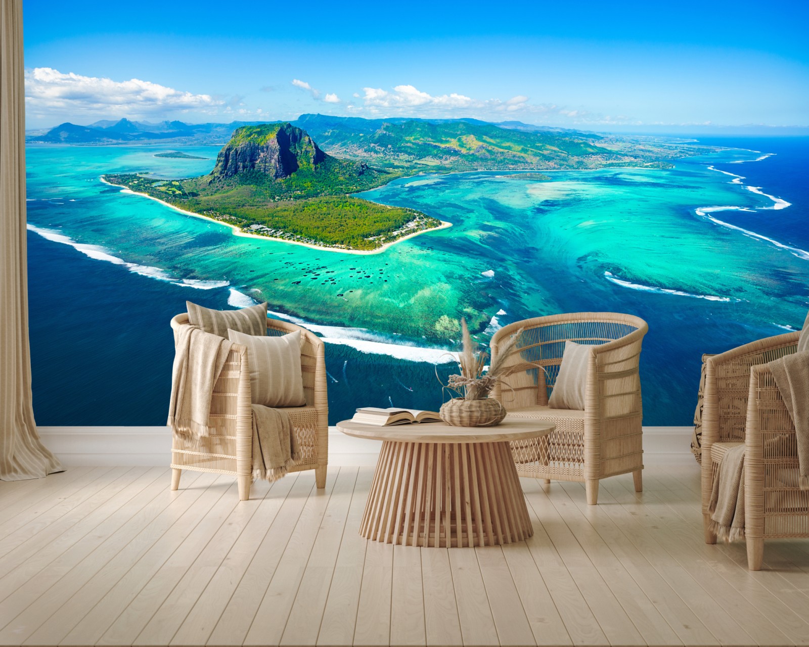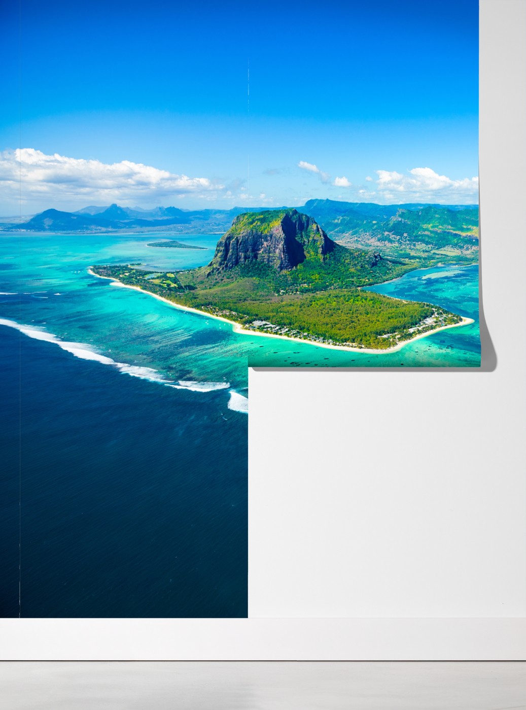 Dodaj tropikalny nastrój do wnętrza dzięki barwnemu ujęciu z lotu ptaka Le Morne i jego turkusowej laguny.