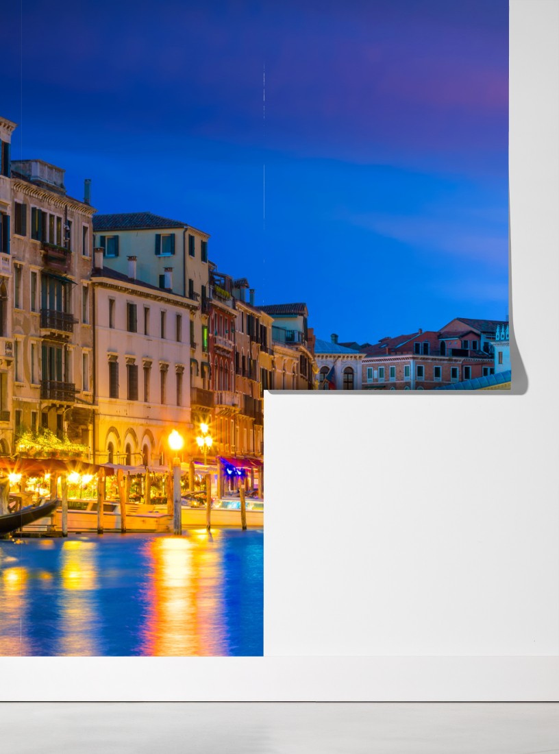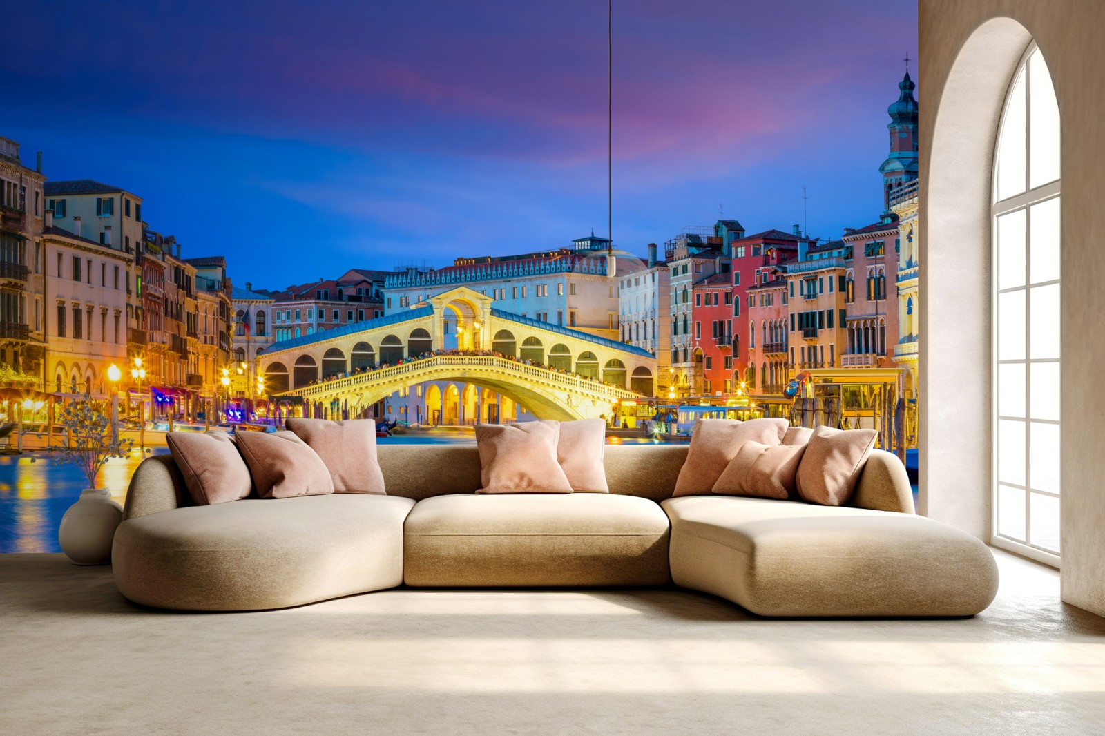 Dodaj do wnętrza magię zmierzchu w Wenecji z żywym widokiem na most Rialto i migoczące odbicia na kanale.
