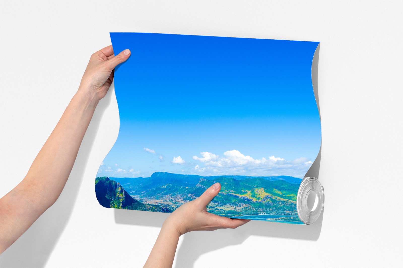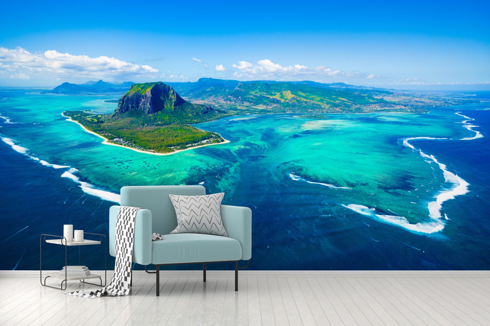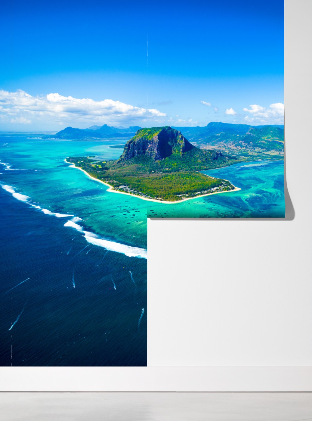 Wprowadź tropikalny spokój do wnętrza dzięki barwnemu widokowi z lotu ptaka na Le Morne i turkusową lagunę Mauritiusa.
