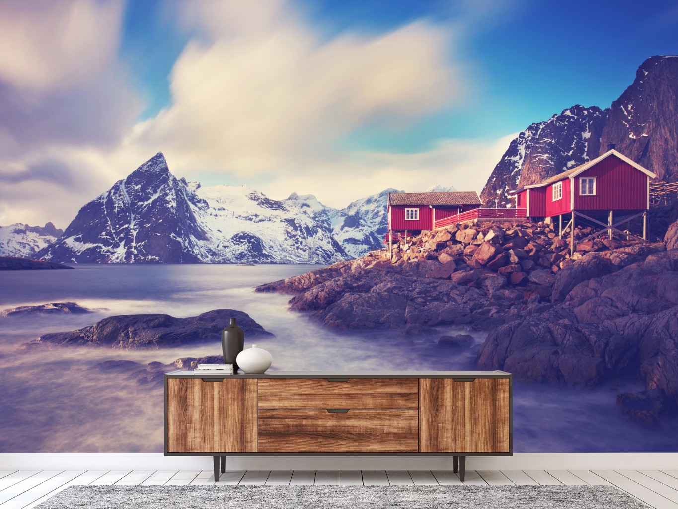 Fototapeta Górski nadmorski krajobraz z czerwonymi domkami