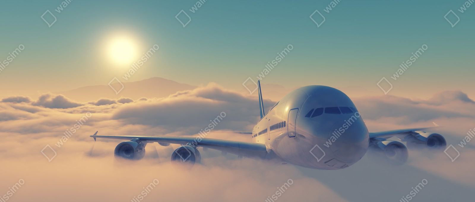Poczuj dreszczyk lotu dzięki tej efektownej wizualizacji 3D samolotu unoszącego się ponad chmurami w miękkim świetle poranka.