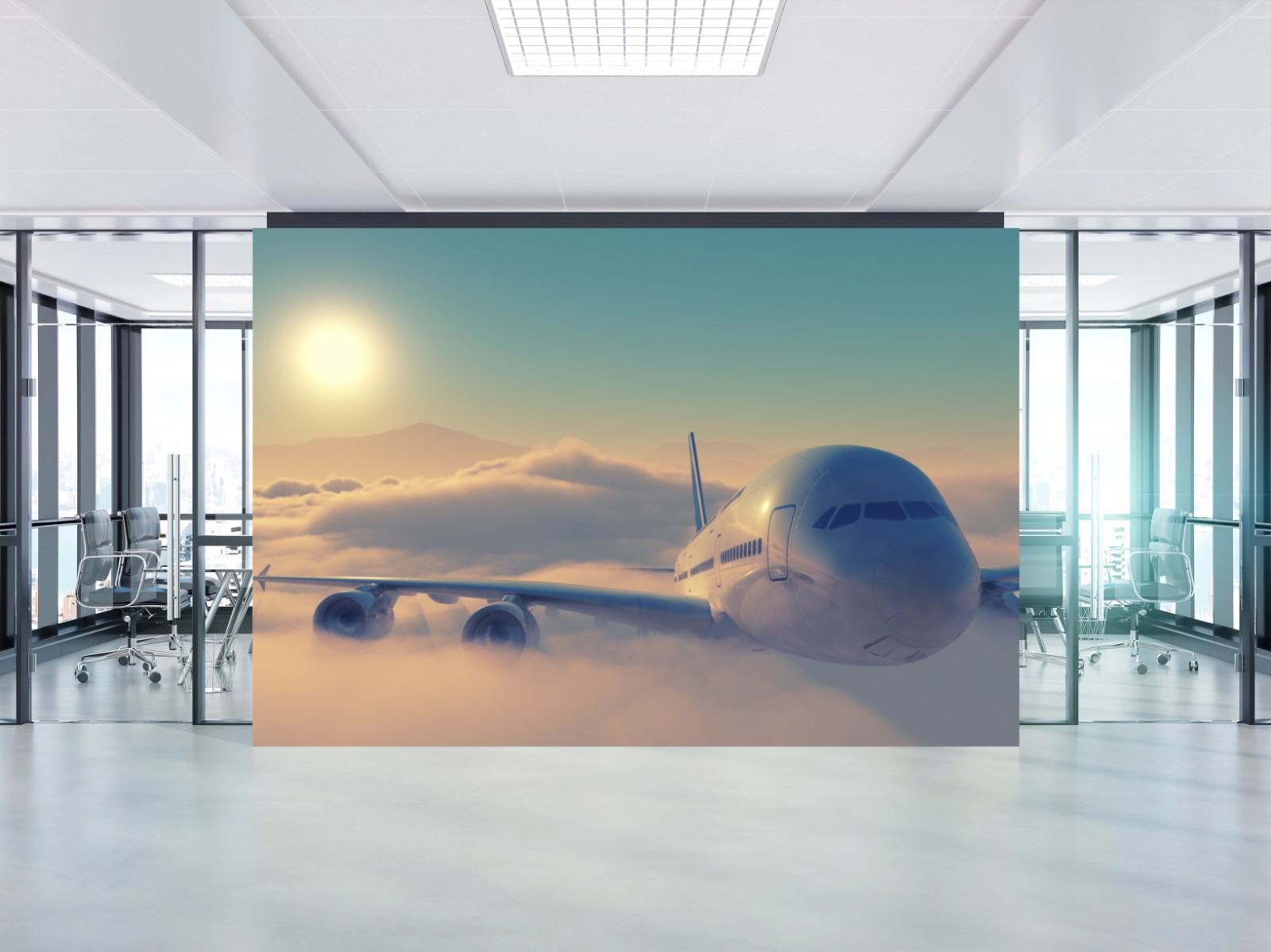 Fototapeta Samolot nad chmurami o wschodzie słońca