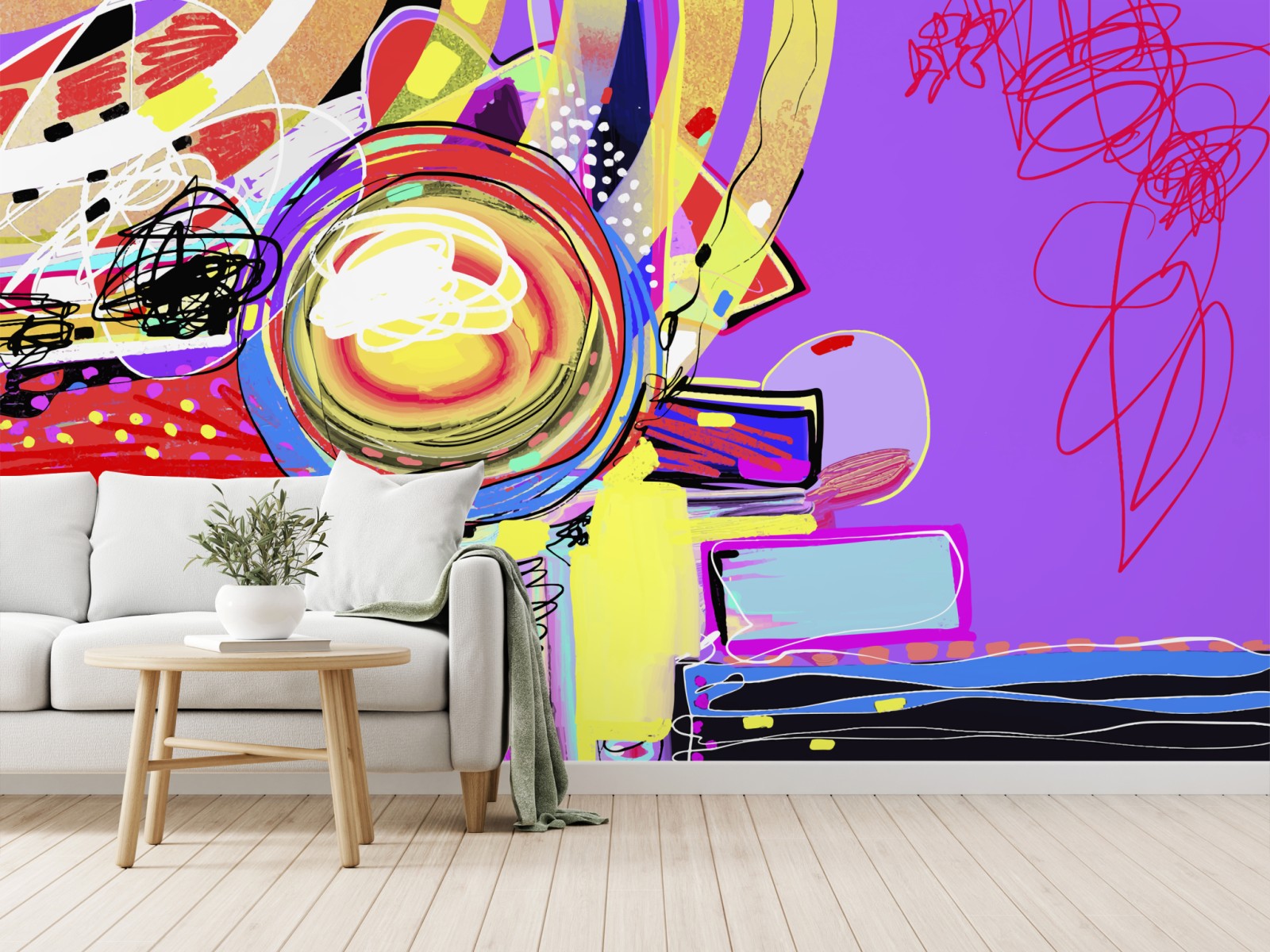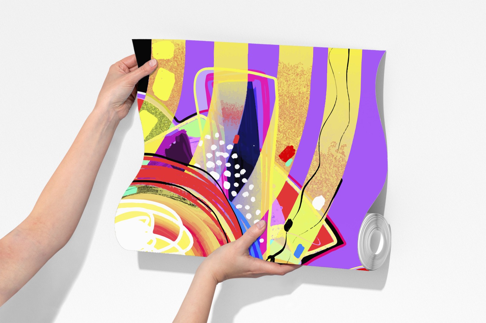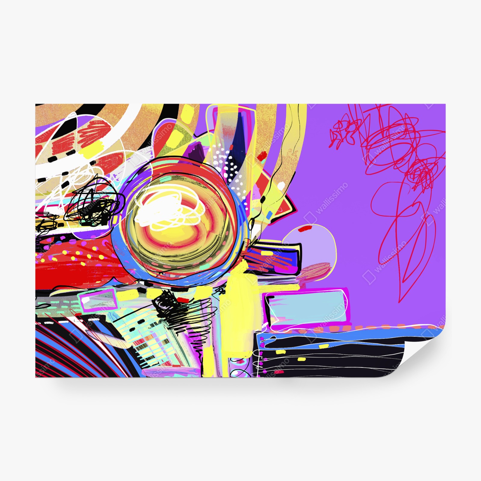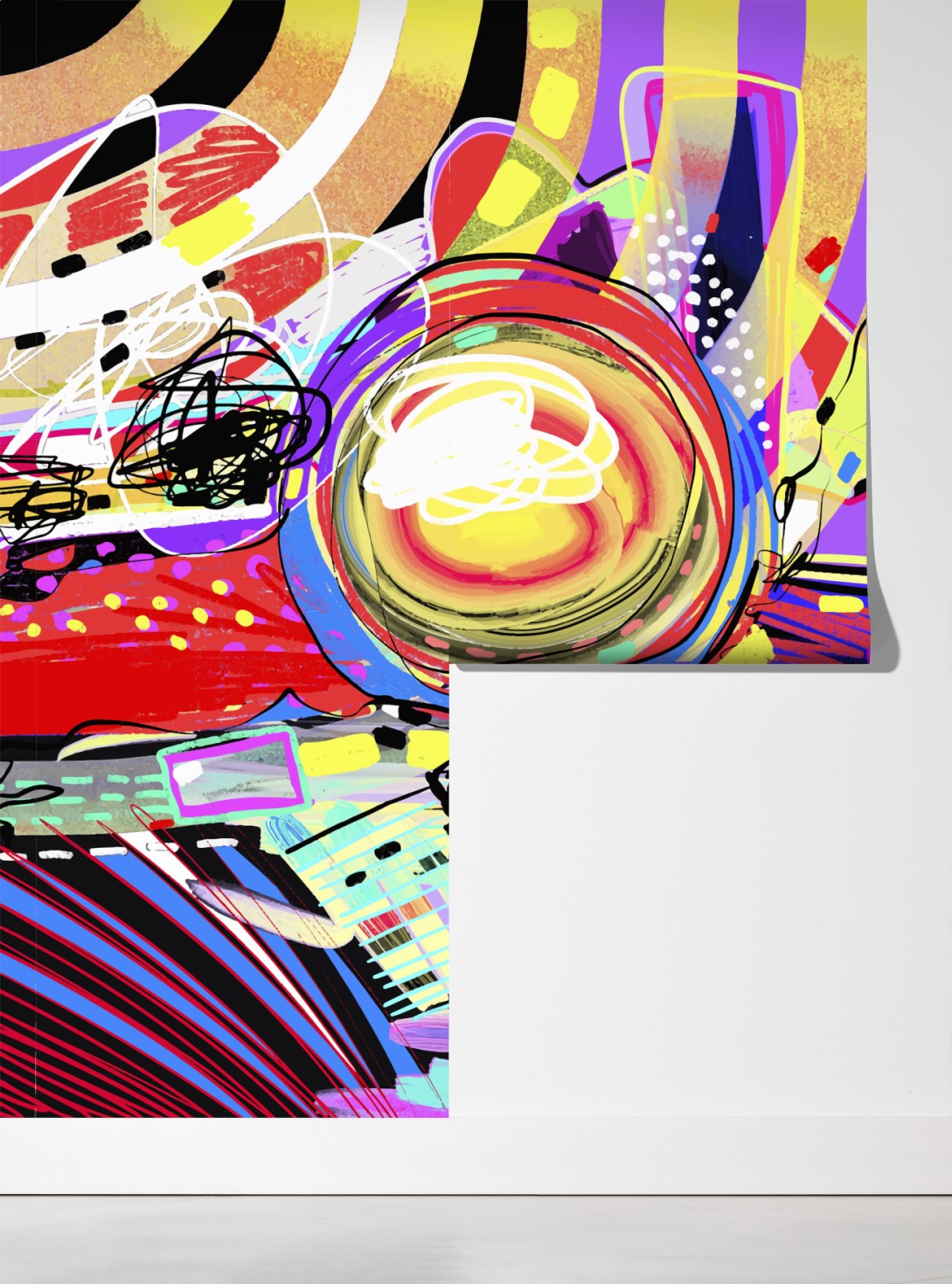Wprowadź do wnętrza energetyczny akcent dzięki tej żywej abstrakcyjnej kompozycji cyfrowej z dynamicznymi kształtami i intensywnymi kolorami.