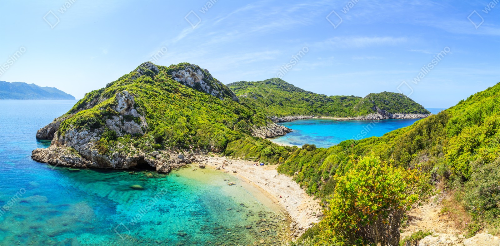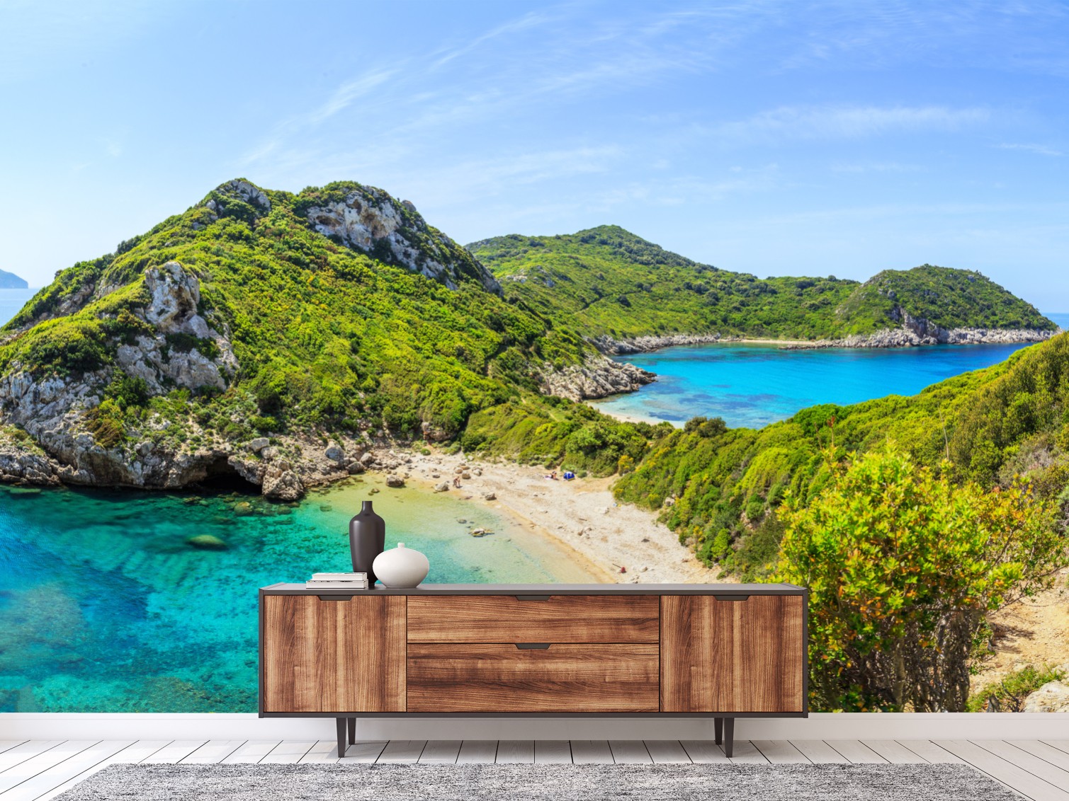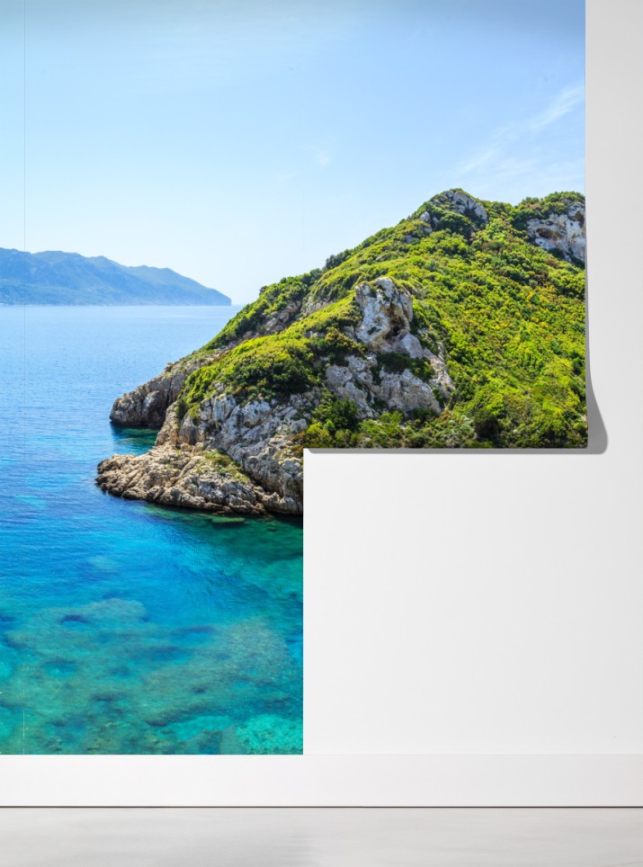 Poczuj spokój nadmorskiego krajobrazu z turkusową wodą, zielonymi wzgórzami i ukrytą piaszczystą zatoką, która wnosi lato do wnętrza.
