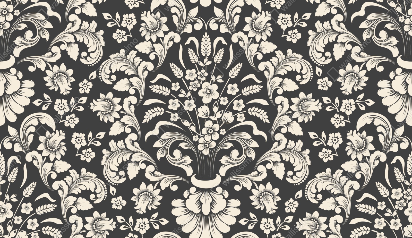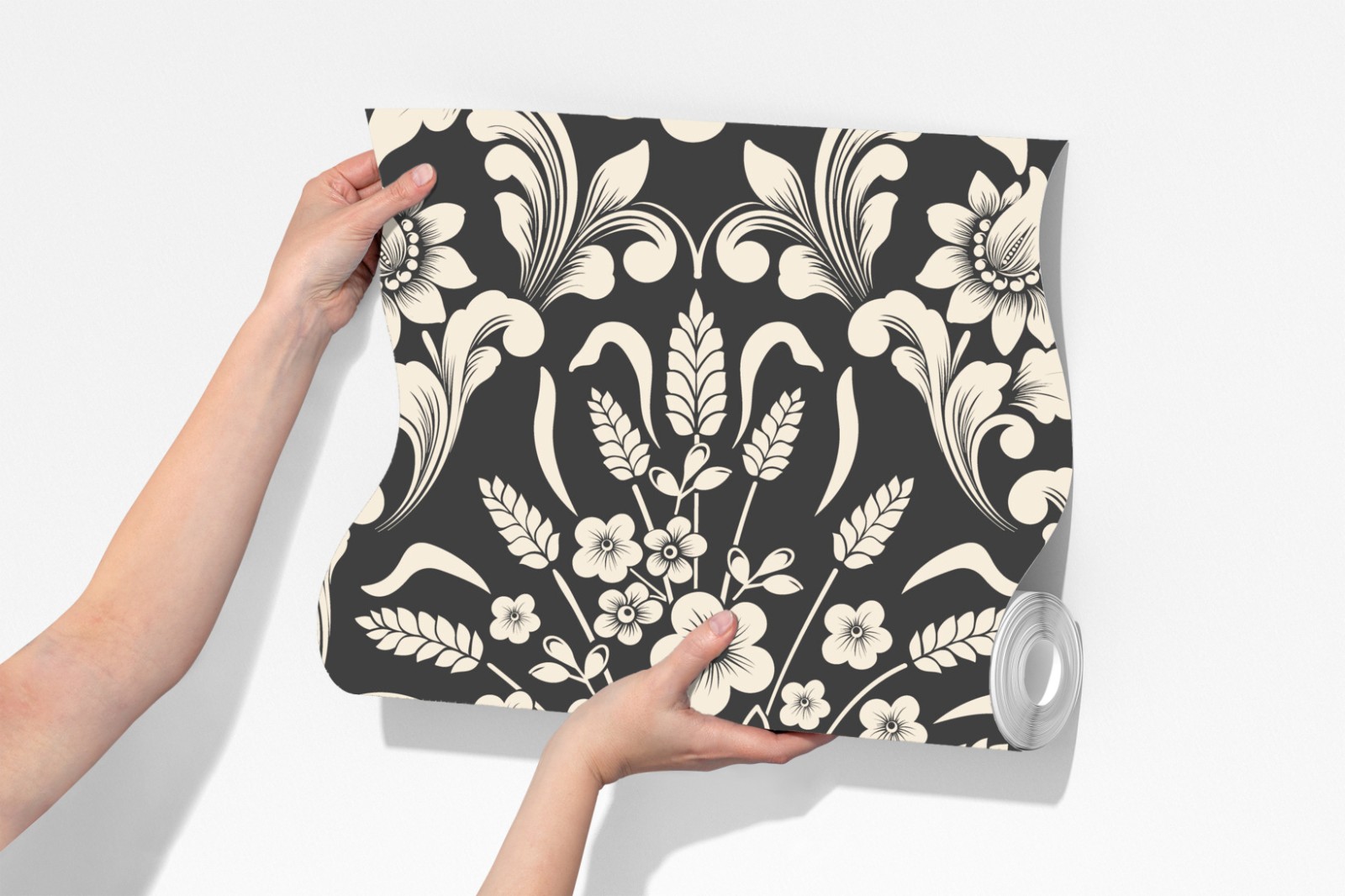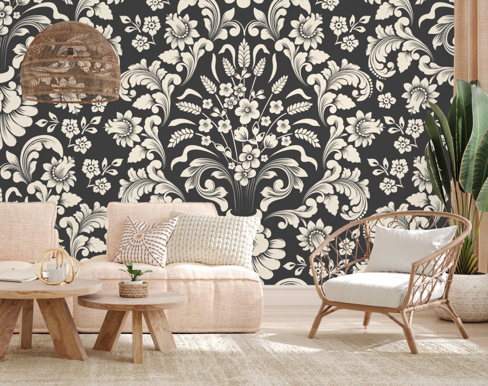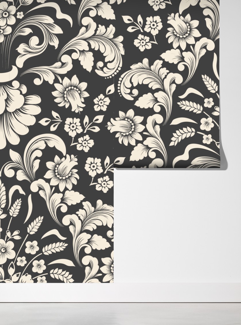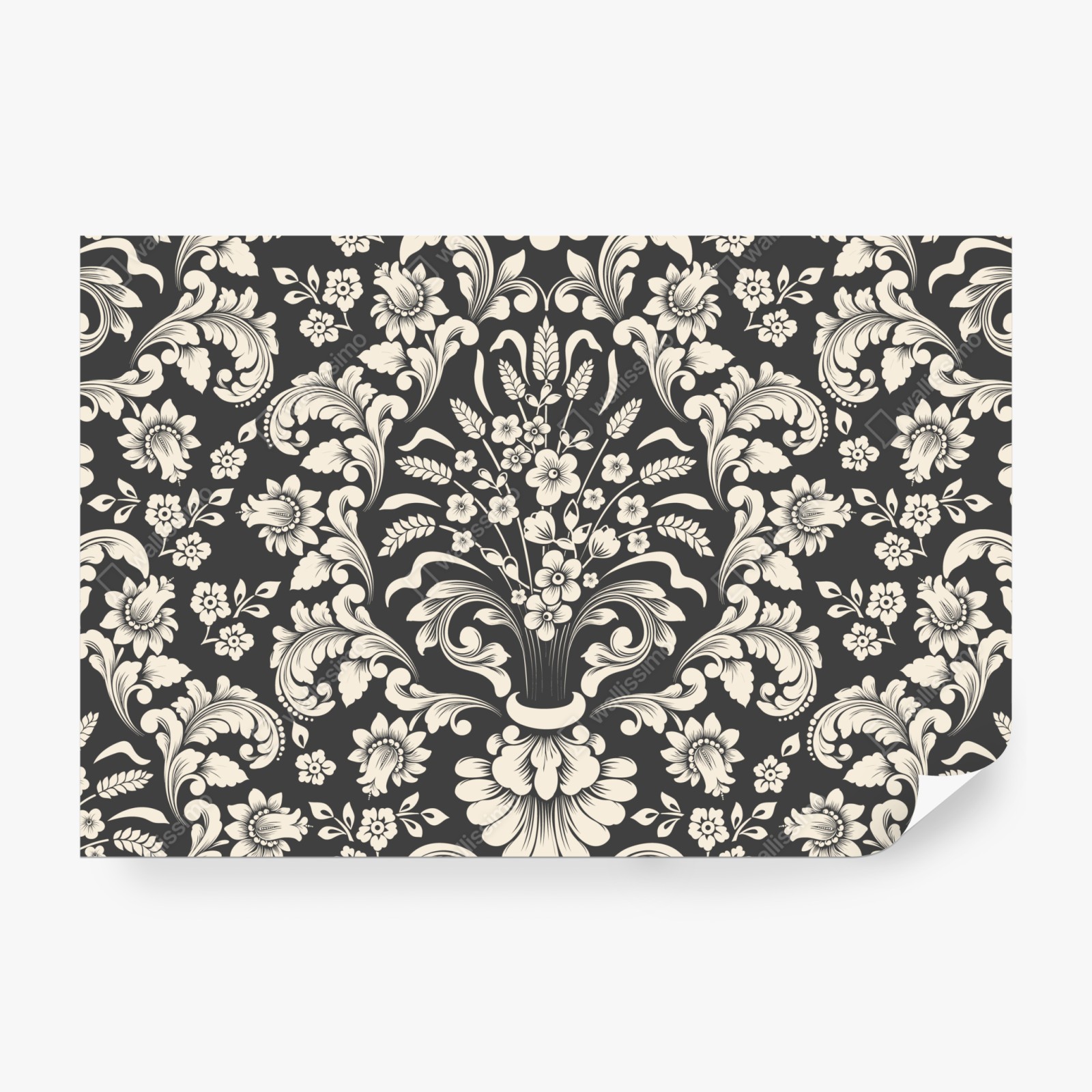 Dodaj swojemu wnętrzu ponadczasową elegancję dzięki kremowo-czarnemu, kwiatowemu wzorowi damask, idealnemu do salonu lub sypialni.