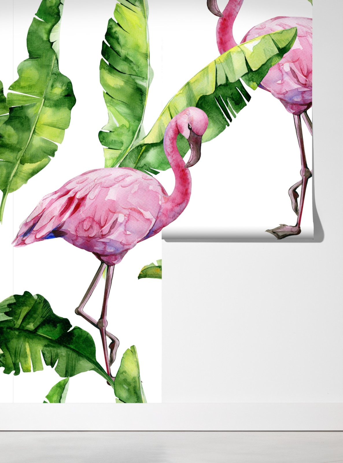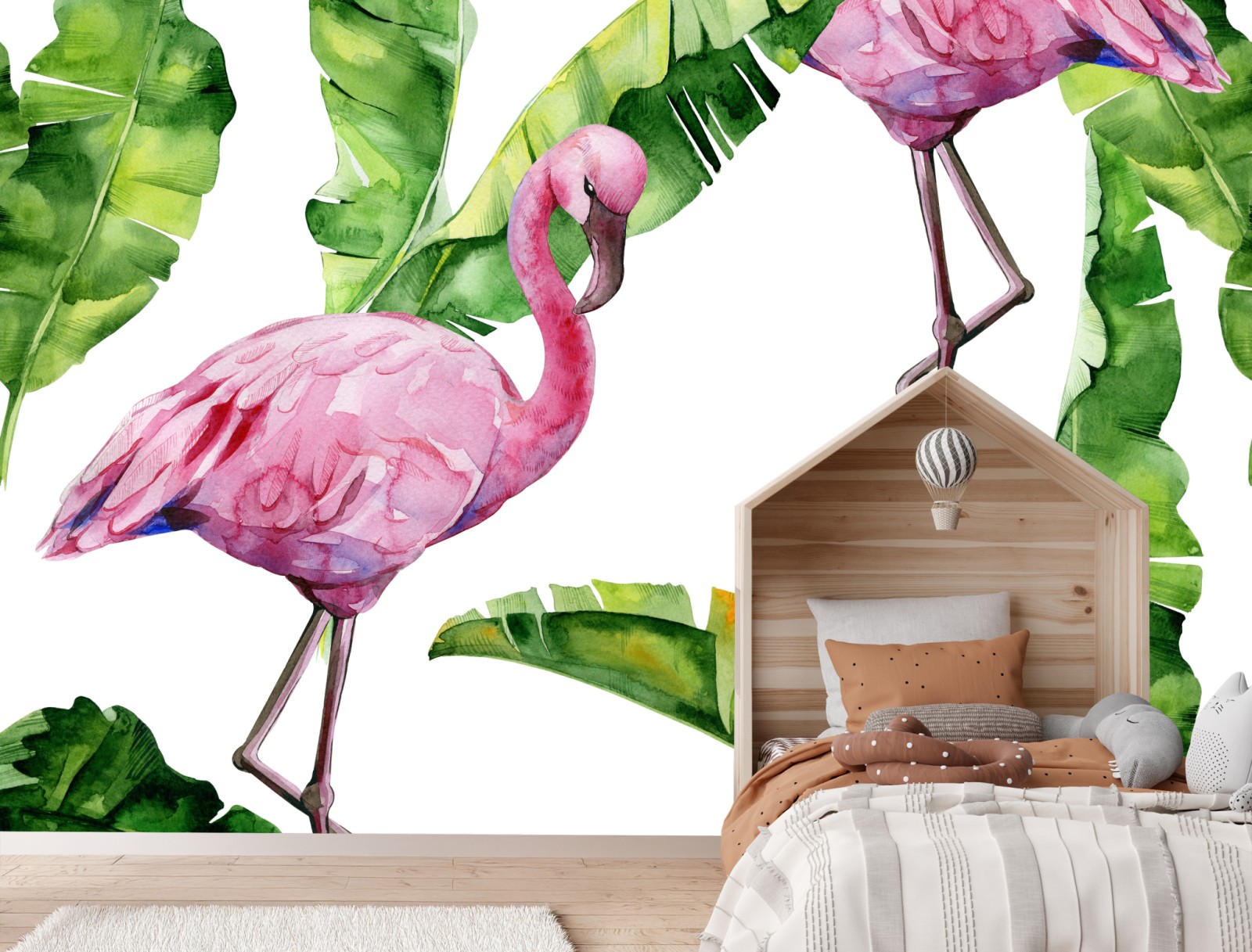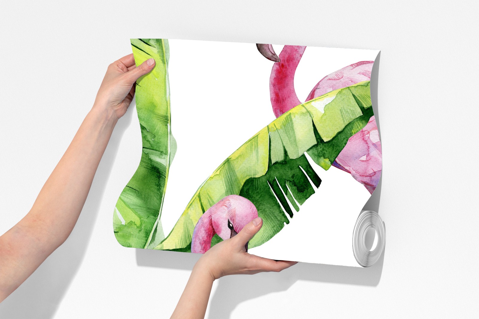 Dodaj tropikalnego uroku do wnętrza dzięki akwarelowemu wzorowi flamingów i liści bananowca, idealnemu na letnią dekorację.