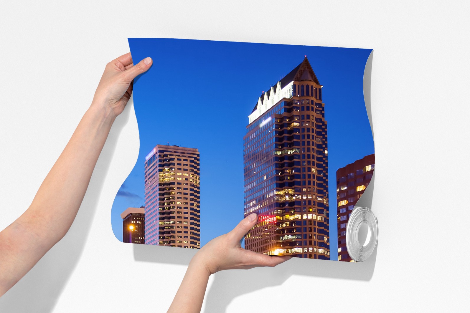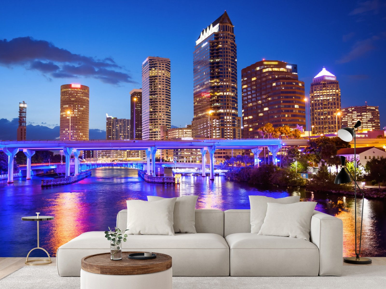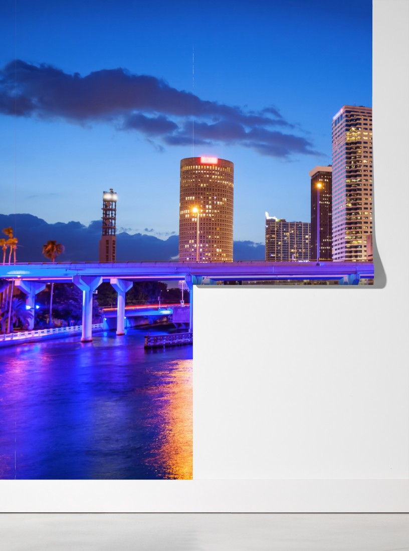 Ożyw swoje wnętrze dynamiczną nocną panoramą Tampa z odbiciami świateł na rzece, idealną do nowoczesnych przestrzeni.