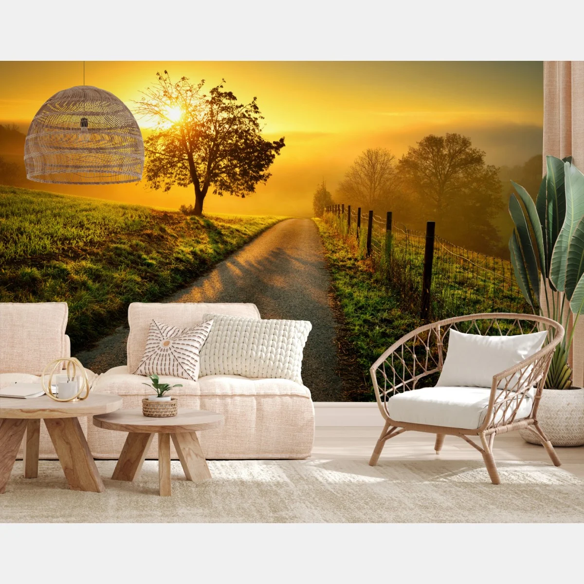 Fototapeta Słoneczna droga przez wiejską łąkę o świcie