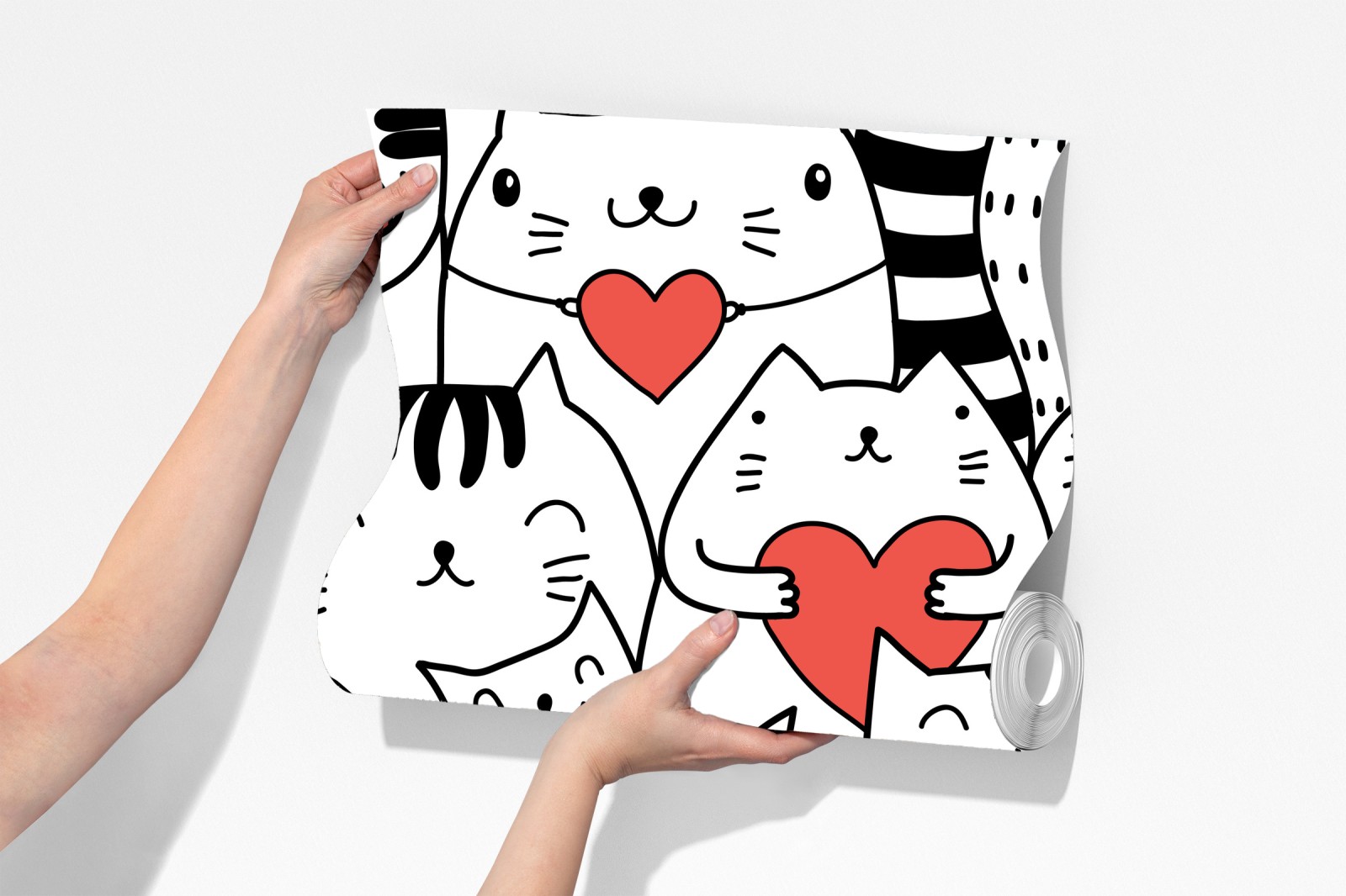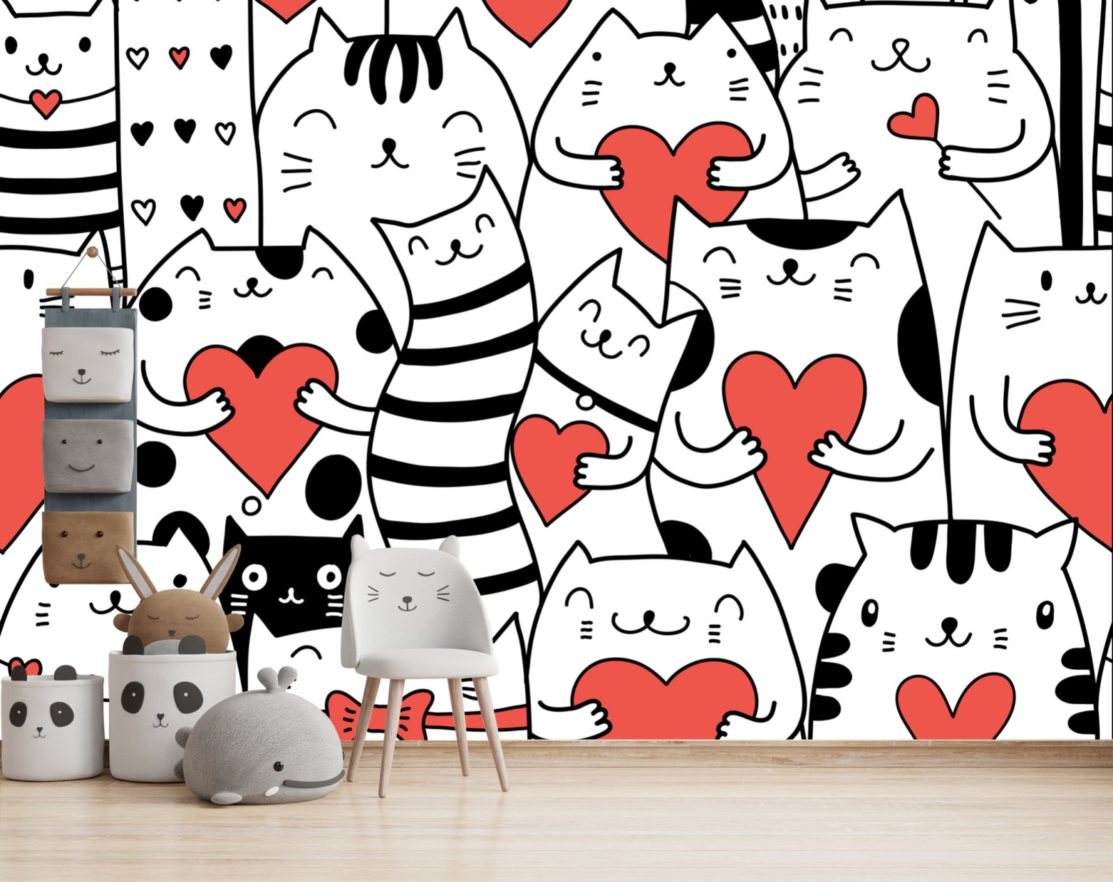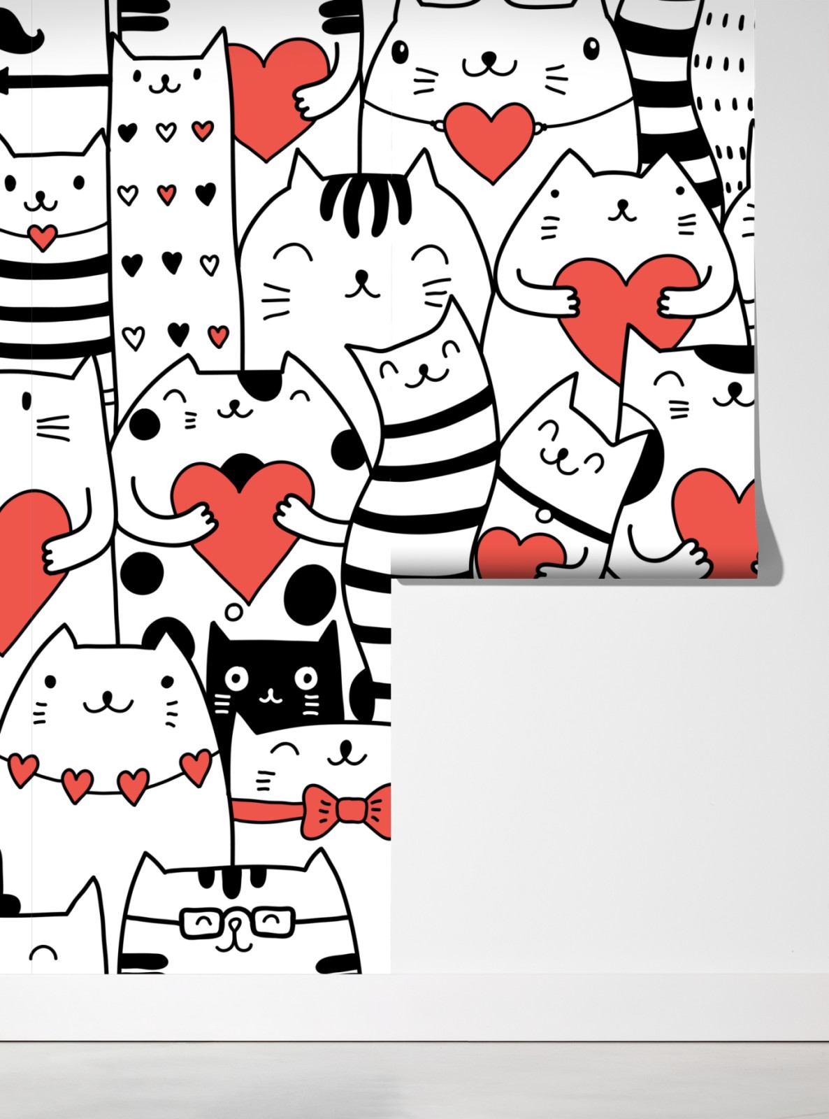 Dodaj zabawny i czuły akcent do wnętrza dzięki temu uroczemu, bezszwowemu wzorowi z kotami trzymającymi czerwone serca, idealnemu do pokoju dziecięcego i przytulnych przestrzeni.