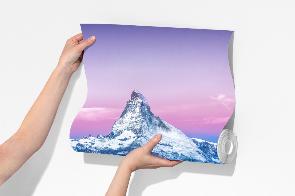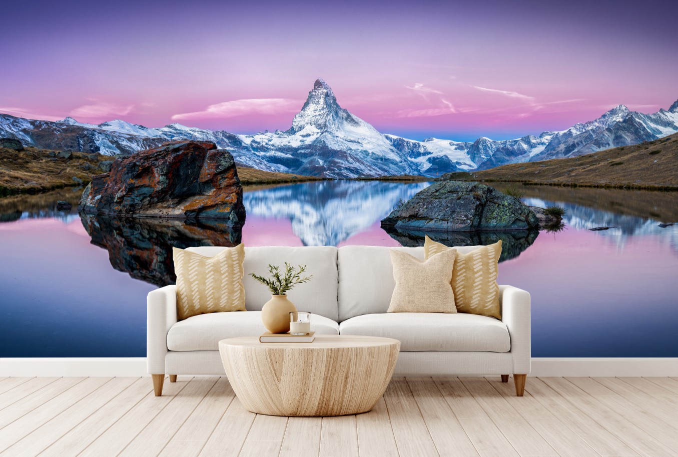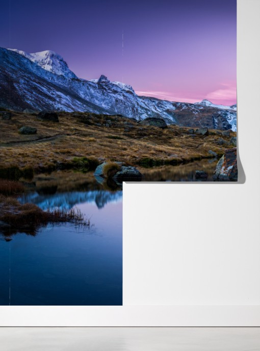 Wprowadź spokojne alpejskie piękno do swojego wnętrza dzięki temu odbiciu gór i delikatnemu pastelowemu niebu, idealnemu do stworzenia relaksującego akcentu.