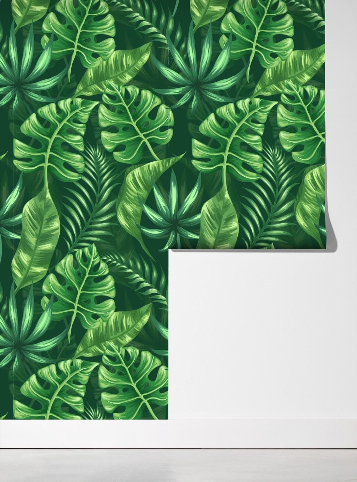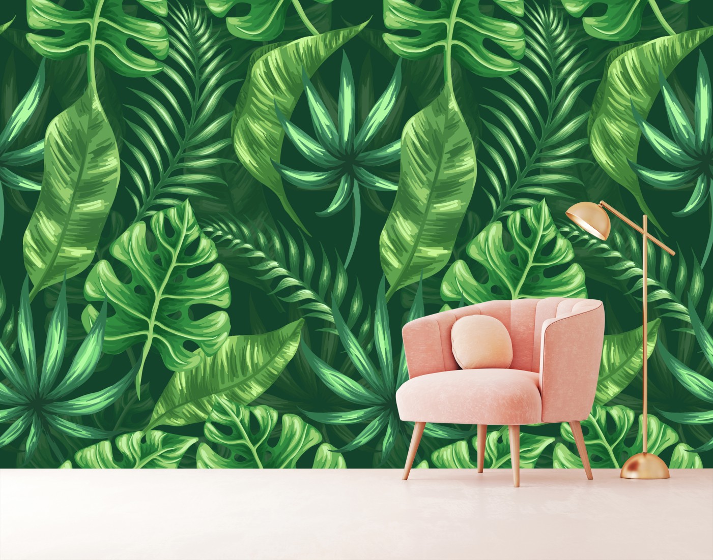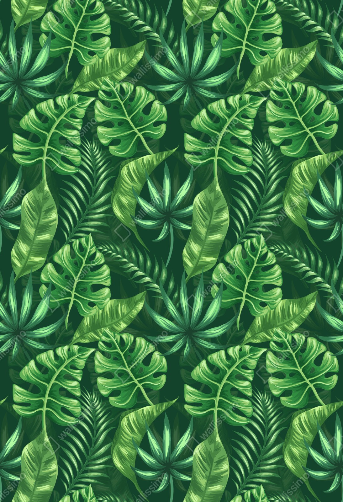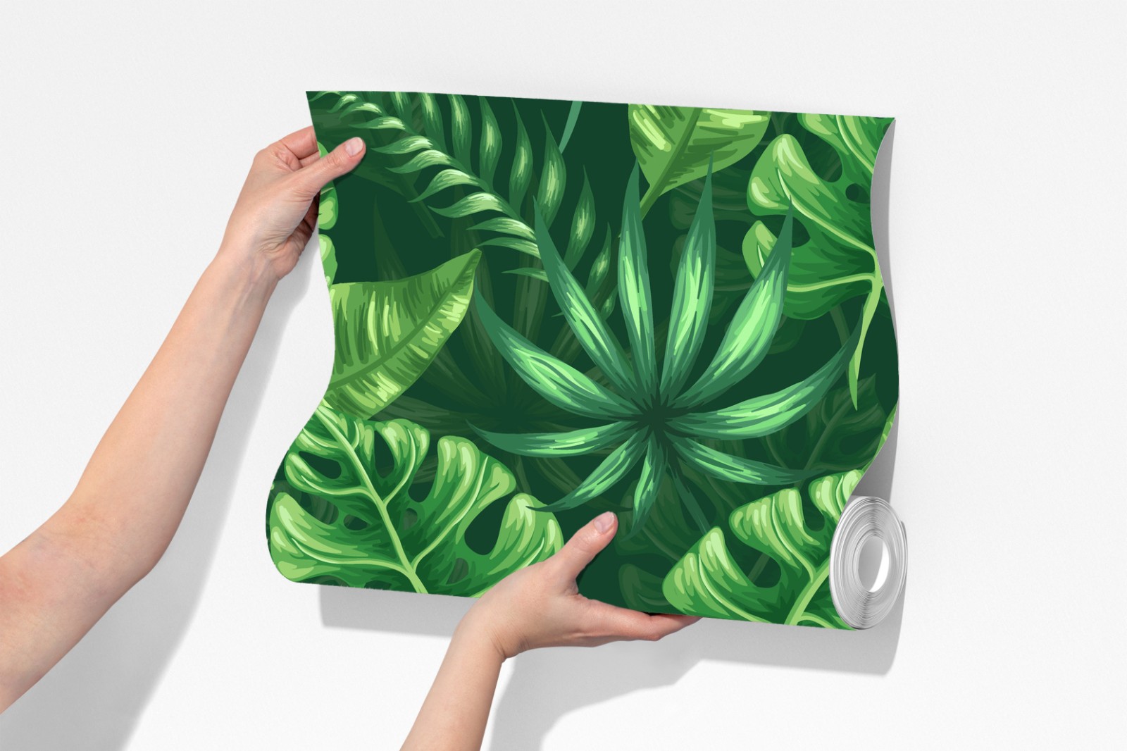 Przenieś tropikalny klimat do wnętrza dzięki bezszwowemu, zielonemu wzorowi liści palmowych, idealnemu do stworzenia kojącej, botanicznej atmosfery.