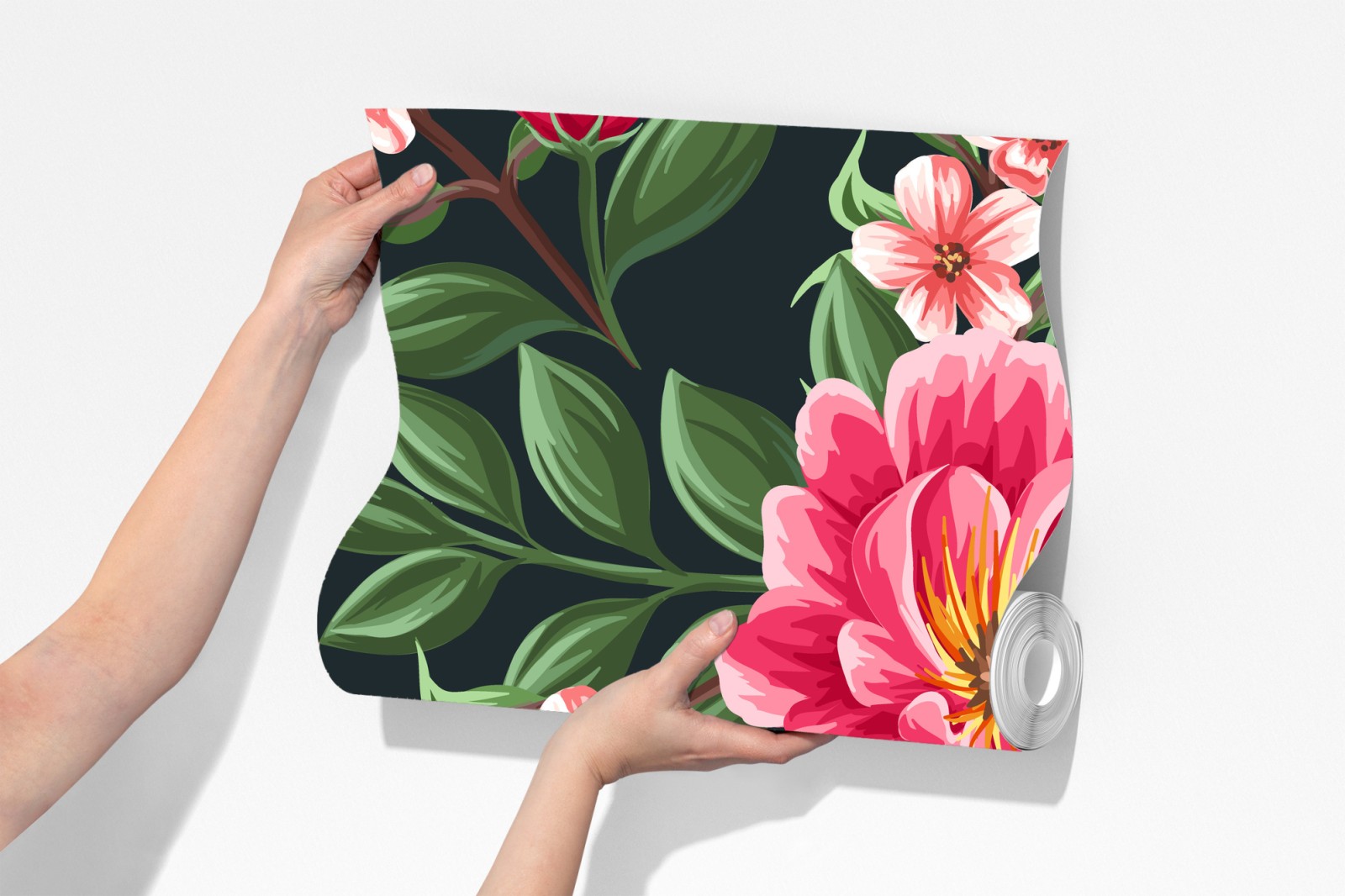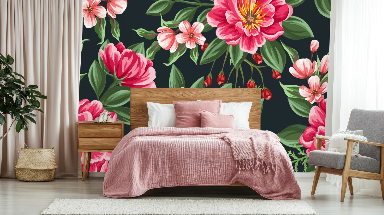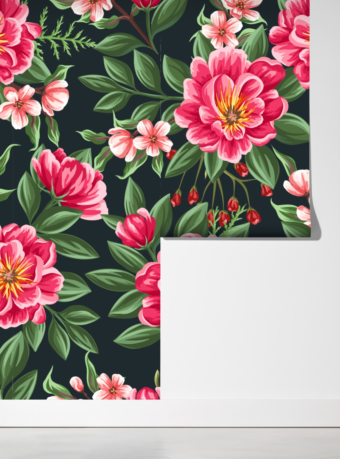 Dodaj botanicznego uroku do wnętrza dzięki temu różowemu wzorowi kwiatowemu w stylu akwareli na ciemnym tle, idealnemu do stworzenia przytulnej i eleganckiej atmosfery.