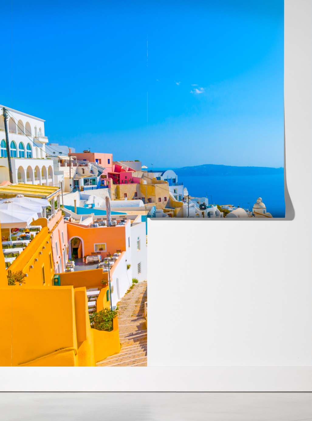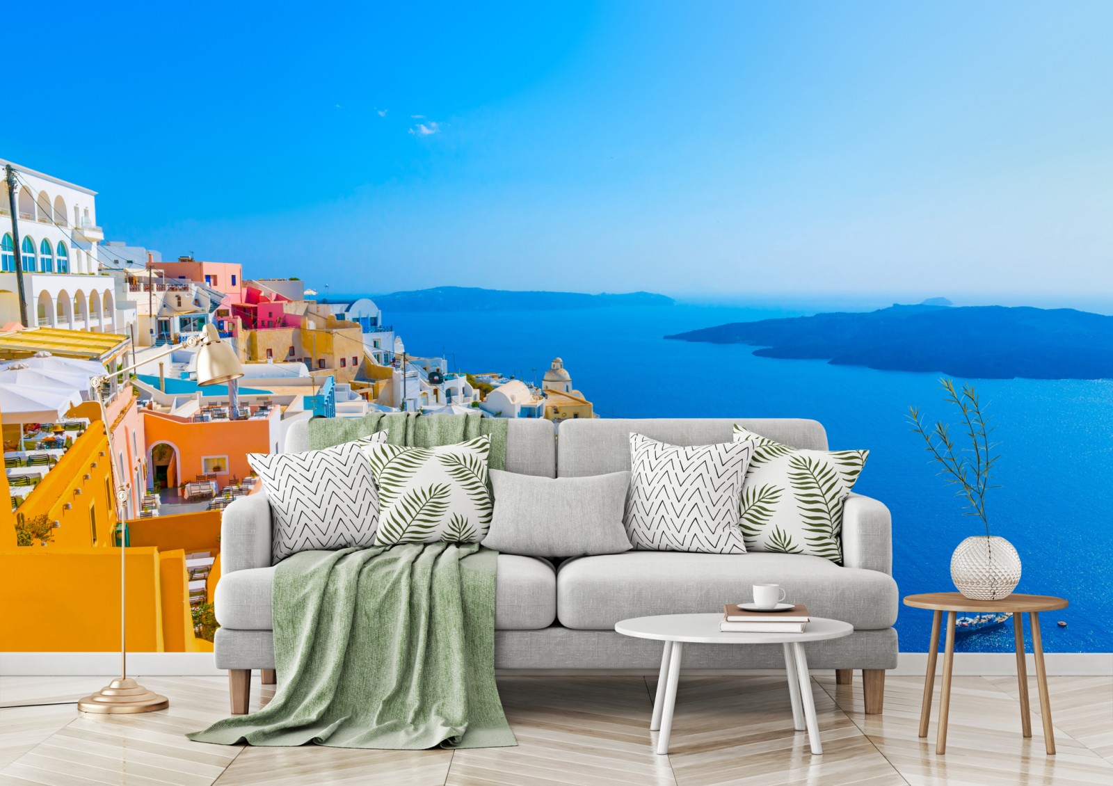 Wprowadź do wnętrza intensywne błękity Santorini dzięki tej żywej panoramie nadmorskiej.