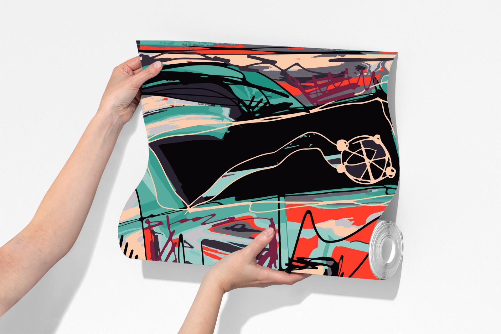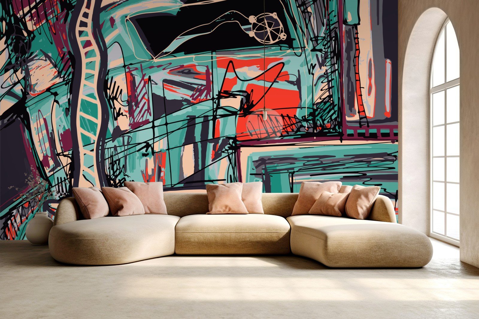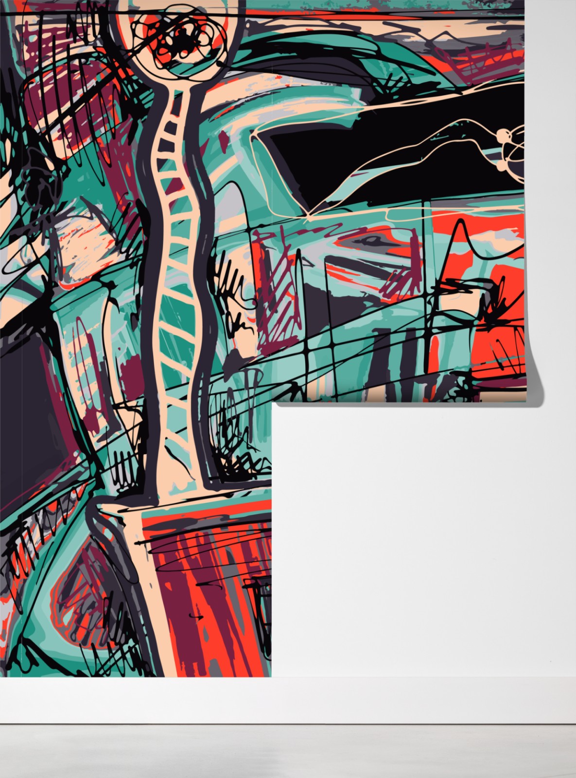 Żywa abstrakcyjna kompozycja w turkusowych i koralowych tonach wnosi nowoczesną energię do wnętrza.