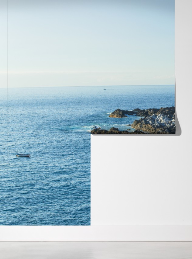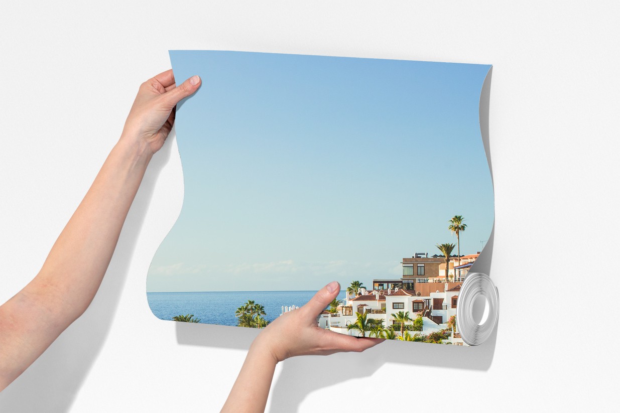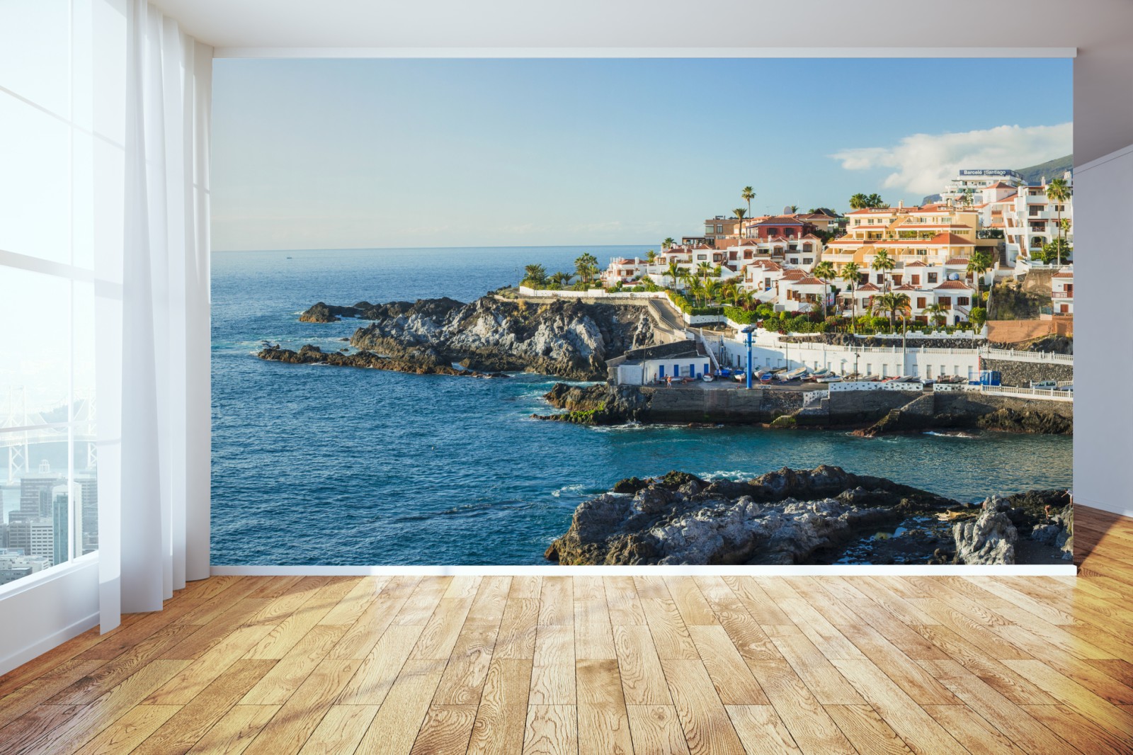 Wprowadź do wnętrza słoneczną panoramę wybrzeża z turkusową wodą, skalistymi klifami i urokliwymi domami na wzgórzu.