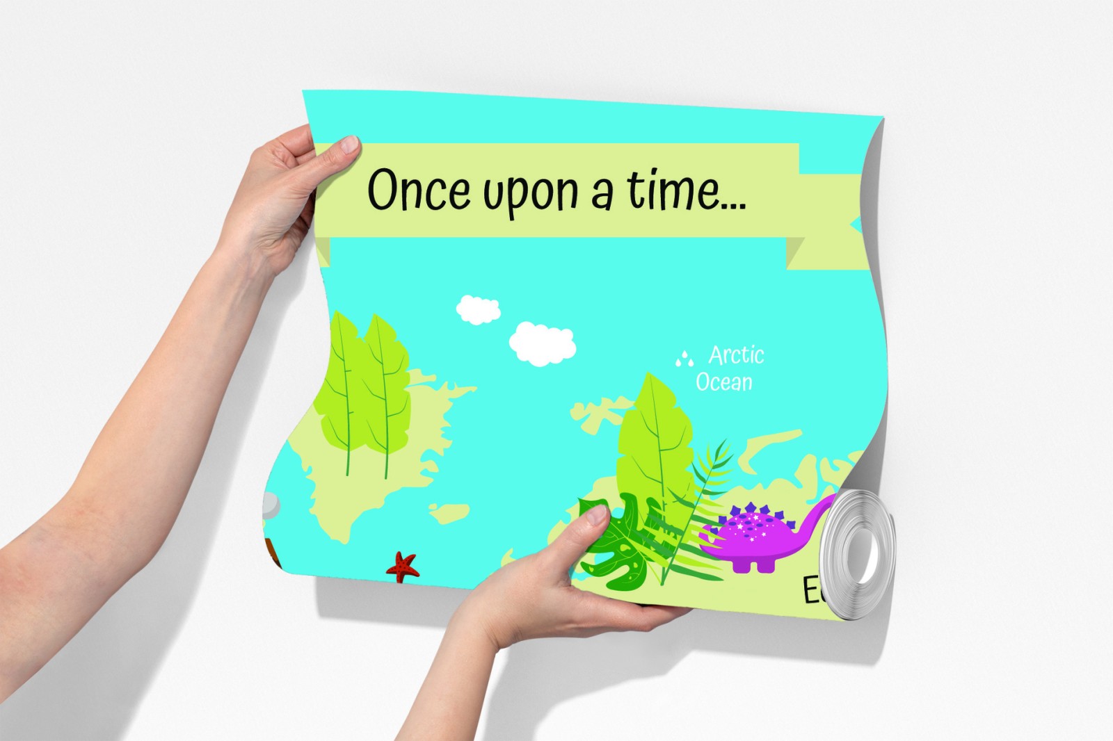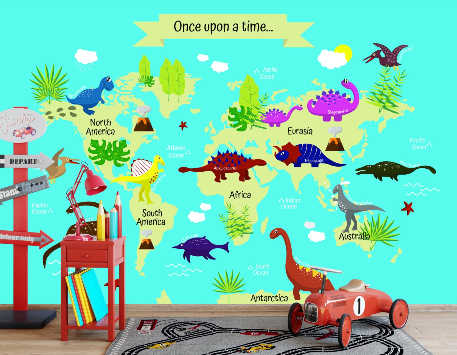 Jaskrawa i zabawna mapa świata z dinozaurami, idealna do dekoracji pokoju dziecięcego i nauki o kontynentach i prehistorii.
