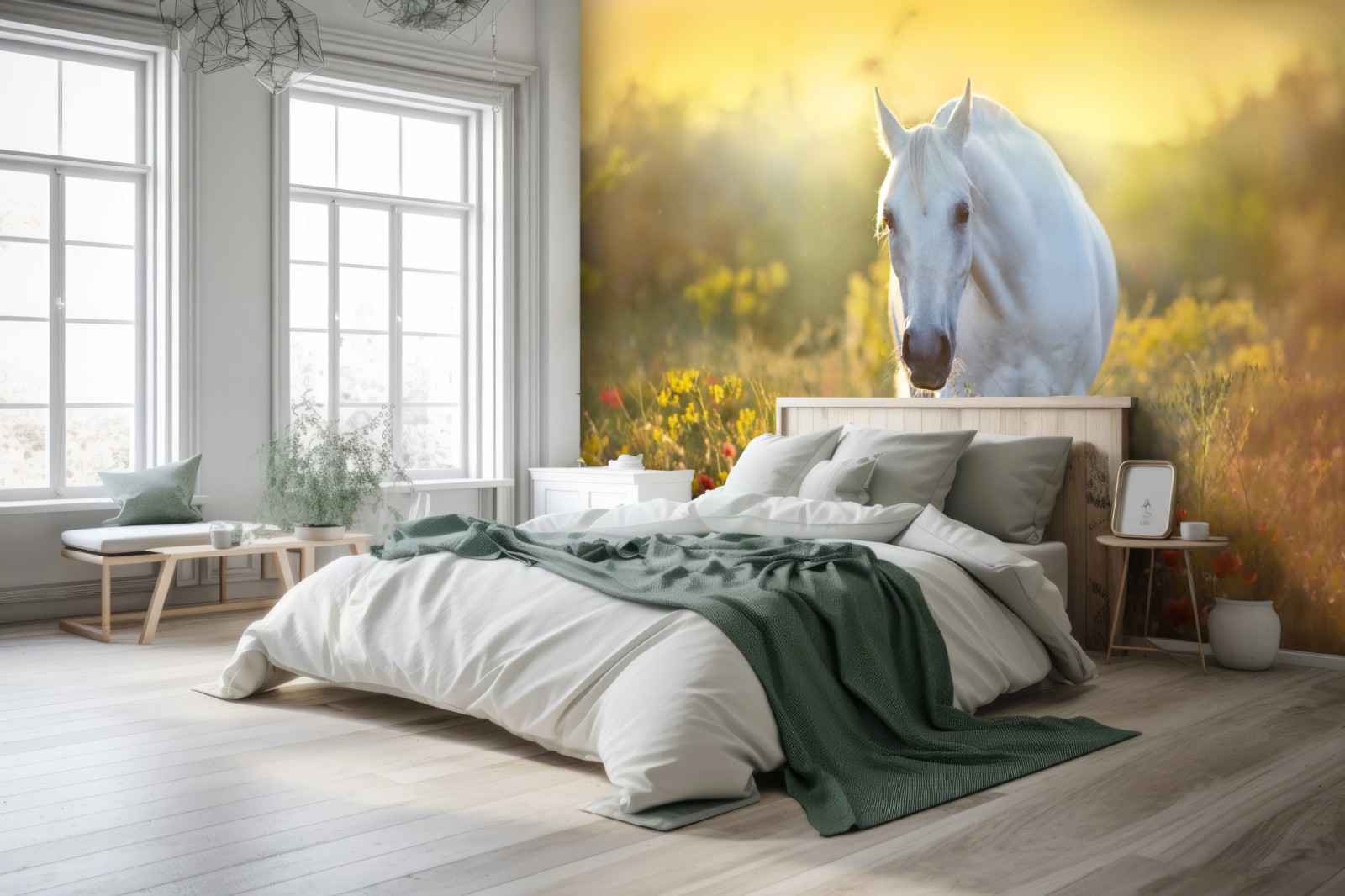 Fototapeta Biały koń na łące maków o wschodzie słońca